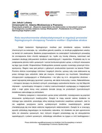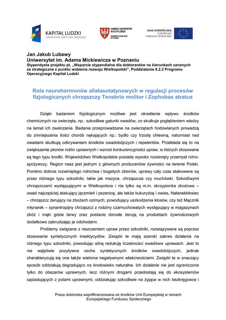 Jan Jakub Lubawy Uniwersytet im. Adama Mickiewicza w Poznaniu Stypendysta projektu pt. „Wsparcie stypendialne dla doktorantów na kierunkach uznanych za strategiczne z punktu widzenia rozwoju Wielkopolski”, Poddziałanie 8.2.2 Programu Operacyjnego Kapitał Ludzki Rola neurohormonów allatasotatynowych w regulacji procesów fizjologicznych chrząszczy Tenebrio molitor i Zophobas atratus Dzięki badaniom fizjologicznym możliwe jest określenie wpływu środków chemicznych na zwierzęta, np.: szkodliwe gatunki owadów, co skutkuje pogłębieniem wiedzy na temat ich zwalczania. Badania przeprowadzane na zwierzętach hodowlanych prowadzą do zmniejszenia ilości chorób nękających np.: bydło czy trzodę chlewną, natomiast nad owadami skutkują odkrywaniem środków owadobójczych i repelentów. Przekłada się to na zwiększenie plonów roślin uprawnych i wzrost konkurencyjności upraw, w których stosowane są tego typu środki. Województwo Wielkopolskie posiada wysoko rozwinięty przemysł rolnospożywczy. Region nasz jest jednym z głównych producentów żywności na terenie Polski. Pomimo dobrze rozwiniętego rolnictwa i bogatych zbiorów, uprawy cały czas atakowane są przez różnego typu szkodniki, takie jak mszyce, chrząszcze czy muchówki. Szkodliwymi chrząszczami występującymi w Wielkopolsce i nie tylko są m.in. skrzypionka zbożowa – owad najczęściej atakujący jęczmień i pszenicę, ale także kukurydzę i owies, Nałanekkłosiec – chrząszcz żerujący na zbożach ozimych, powodujący uszkodzenia kłosów, czy też Mącznik młynarek – synantropijny chrząszcz z rodziny czarnuchowatych występujący w magazynach zbóż i mąki gdzie larwy oraz postacie dorosłe żerują na produktach żywnościowych dodatkowo zabrudzając je odchodami. Problemy związane z niszczeniem upraw przez szkodniki, rozwiązywane są poprzez stosowanie syntetycznych insektycydów. Związki te mają szeroki zakres działania na różnego typu szkodniki, powodując silną redukcję liczebności owadóww uprawach. Jest to nie wątpliwie pozytywna cecha syntetycznych środków owadobójczych, jednak charakteryzują się one także wieloma negatywnymi właściwościami. Związki te w znaczący sposób oddziałują degradująco na środowisko naturalne. Ich działanie nie jest ograniczone tylko do obszarów uprawnych, lecz różnymi drogami przedostają się do ekosystemów sąsiadujących z polami uprawnymi, oddziałując szkodliwie na żyjące w nich bezkręgowce i Praca doktorska współfinansowana ze środków Unii Europejskiej w ramach Europejskiego Funduszu Społecznego kręgowce. Insektycydy te charakteryzują się także długim czasem rozkładu, przez co zalegają w środowisku naturalnym, kumulując się w organizmach żywych. Alternatywą dla syntetycznych insektycydów są związki naturalnie występujące u owadów, które charakteryzują się właściwościami ograniczającymi żywotność szkodników owadzich oraz posiadają krótki okres półtrwania uniemożliwiający akumulację w środowisku naturalnym. Do takich substancji mogą już wkrótce należeć pseudopeptydy i peptydomimetyki syntetyzowane na bazie zidentyfikowanych neurohormonów owadów. Procesy fizjologiczne owadów takie, jak np.: rozród lub rozwój, regulowane są przez układ neuro-endokrynowy. Kontroli tej podlegają m.in. proces metamorfozy i linienia, aktywność kurczliwa serca, jajowodu oraz przewodu wytryskowego, metabolizm substancji zapasowych (lipidów, węglowodanów, białek), czy ubarwienie ciała. Układ neuroendokrynowy tworzą ciała kardialne (corporacardiaca), ciała przyległe(corporaallata), oraz komórki neurosekrecyjne mózgu i brzusznego łańcuszka nerwowego, usytuowanego w tułowiu i odwłoku.Wydaję się, że neurohormony owadzie są idealnymi związkami do badań nad nowymi potencjalnymibioinsektycydami. Jedną z dużych grup zidentyfikowanych neurohormonów owadów są allatostatyny, które odkryto u karaczanów, motyli, muchówek, patyczaków, świerszczy i skorupiaków. Allatostatyny jako hormony występujące endogennie w organizmie owadów regulują wiele czynności życiowych tych zwierząt. Najważniejszą ich rolą jest przede wszystkim oddziaływanie na główny gruczoł neuro-endokrynowy owadów – ciała przyległe, odpowiednik przysadki kręgowców – hamując wydzielanie hormonu juwenilnego, który kontroluje metamorfozę i rozwój. Zaburzenia w syntezie głównego czynnika odpowiedzialnego za rozwój owada mogą prowadzić do zahamowania przepoczwarczania się szkodników, tym samym zmniejszając liczbę osobników zdolnych do rozrodu i być może zahamowanie ekspansji populacji owadów na obszarze stosowania hormonów jako biopestycydów. Z przeprowadzonych badań wynika jednak także, że peptydy te mogą zaburzać proces oogenezy oraz procesy pobierania i wchłaniania pokarmu. Udowodniono, że allatostatyny z typu FGL powodują zahamowanie syntezy enzymów trawiennych oraz mają właściwości mioinhibicyjne na skurcze mięśni jelita karaczanów. W naturze główną drogą przyjmowania pokarmu przez owada jest jelito środkowe, więc zaburzenie czynności tego narządu może powodować utratę zdolności do przyjmowania oraz trawieniapokarmu i prowadzićostatecznie do śmierci owada. Neurohormony allatostatyczne mogą również wpływać na ciało tłuszczowe. Tkanka ta pełni funkcje magazynujące w ciele owada, poprzez gromadzenie w swych strukturach białek, tłuszczów i węglowodanów. Poza tym tkanka ta syntetyzuje i gromadzi m.in. witelogeniny, białka odpowiedzialne za wzrost i rozwój oocytu w jajniku. Witelogeniny stanowią około 80% białek wydzielanych przez ciało tłuszczowe u dorosłej samicy owada. Zahamowanie syntezy witelogenin w ciele tłuszczowym pod wpływem allatostatyn z rodziny FGL wykazano u Blattellagermanica.Efek ten prowadzi Praca doktorska współfinansowana ze środków Unii Europejskiej w ramach Europejskiego Funduszu Spo