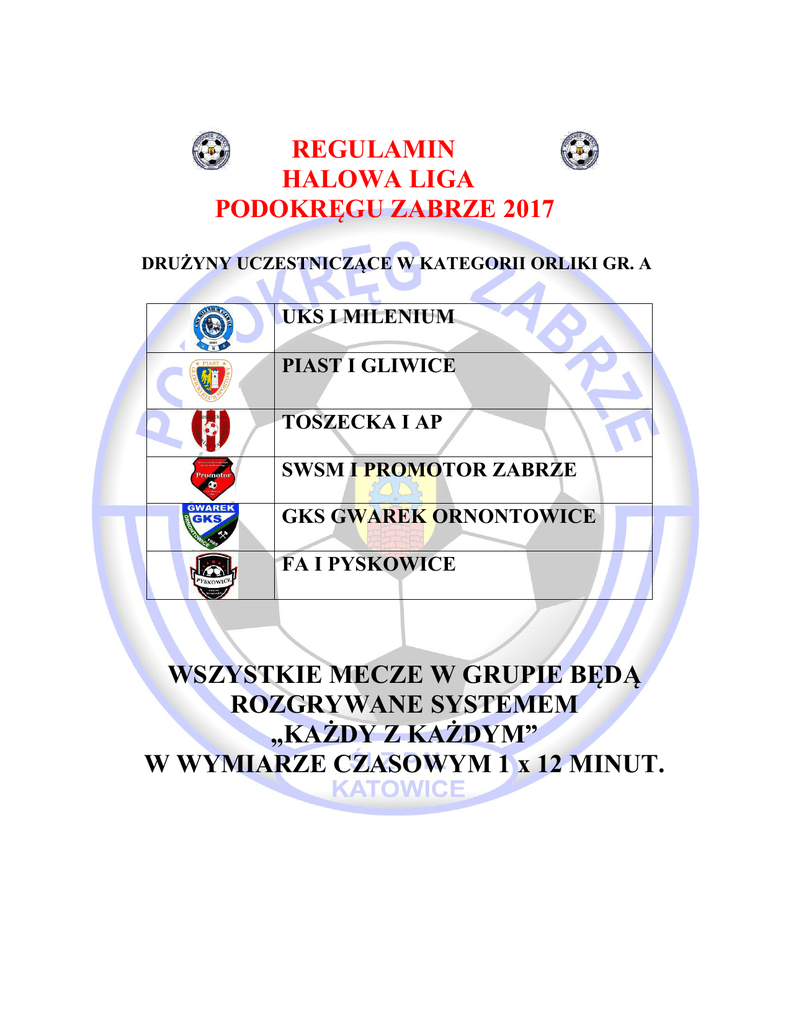 REGULAMIN HALOWA LIGA PODOKRĘGU ZABRZE 2017 DRUŻYNY UCZESTNICZĄCE W KATEGORII ORLIKI GR. A UKS I MILENIUM PIAST I GLIWICE TOSZECKA I AP SWSM I PROMOTOR ZABRZE GKS GWAREK ORNONTOWICE FA I PYSKOWICE WSZYSTKIE MECZE W GRUPIE BĘDĄ ROZGRYWANE SYSTEMEM „KAŻDY Z KAŻDYM” W WYMIARZE CZASOWYM 1 x 12 MINUT. REGULAMIN HALOWA LIGA PODOKRĘGU ZABRZE 2017 DRUŻYNY UCZESTNICZĄCE W KATEGORII ORLIKI GR. B GSF I GLIWICE LKS NAPRZÓD PONISZOWICE AP TEAM I GLIWICE GÓRNIK II ZABRZE KKS KOLEJARZ GLIWICE TOSZECKA II AP WSZYSTKIE MECZE W GRUPIE BĘDĄ ROZGRYWANE SYSTEMEM „KAŻDY Z KAŻDYM” W WYMIARZE CZASOWYM 1 x 12 MINUT. REGULAMIN HALOWA LIGA PODOKRĘGU ZABRZE 2017 DRUŻYNY UCZESTNICZĄCE W KATEGORII ORLIKI GR. C GÓRNIK I ZABRZE LKS AMATOR RUDZINIEC PIAST III GLIWICE SWSM PROMOTOR II ZABRZE KS MOSiR SPARTA ZABRZE FA II PYSKOWICE WSZYSTKIE MECZE W GRUPIE BĘDĄ ROZGRYWANE SYSTEMEM „KAŻDY Z KAŻDYM” W WYMIARZE CZASOWYM 1 x 12 MINUT. REGULAMIN HALOWA LIGA PODOKRĘGU ZABRZE 2017 DRUŻYNY UCZESTNICZĄCE W KATEGORII ORLIKI GR. D UKS II MILENIUM GSF II GLIWICE TOSZECKA III AP MSPN GÓRNIK ZABRZE PIAST III GLIWICE SKS GWAREK ZABRZE WSZYSTKIE MECZE W GRUPIE BĘDĄ ROZGRYWANE SYSTEMEM „KAŻDY Z KAŻDYM” W WYMIARZE CZASOWYM 1 x 12 MINUT. REGULAMIN HALOWA LIGA PODOKRĘGU ZABRZE 2017 DRUŻYNY UCZESTNICZĄCE W KATEGORII ORLIKI GR. E LKS WILKI WILCZA MKS ZABORZE LKS ORZEŁ I STANICA KS BURZA BOROWA WIEŚ MKS SOŚNICOWICE KS 94 RACHOWICE WSZYSTKIE MECZE W GRUPIE BĘDĄ ROZGRYWANE SYSTEMEM „KAŻDY Z KAŻDYM” W WYMIARZE CZASOWYM 1 x 12 MINUT. REGULAMIN HALOWA LIGA PODOKRĘGU ZABRZE 2017 DRUŻYNY UCZESTNICZĄCE W KATEGORII ORLIKI ORLIKI GR. F MKS ZABRZE – KOŃCZYCE AP BYTOM LKS POGOŃ ZIEMIĘCICE LKS 35 GIERAŁTOWICE LKS ORZEŁ II STANICA AP TEAM II GLIWICE WSZYSTKIE MECZE W GRUPIE BĘDĄ ROZGRYWANE SYSTEMEM „KAŻDY Z KAŻDYM” W WYMIARZE CZASOWYM 1 x 12 MINUT. REGULAMIN HALOWA LIGA PODOKRĘGU ZABRZE 2017 1. 2. Cel zawodów popularyzacja zdrowego trybu życia oraz gry w piłkę nożną na hali - futsal wyłonienie najlepszych drużyn orlików w „HLPZ Śl. ZPN Podokręg Zabrze 2017” Terminy zawodów i miejsce Halowa Liga w dniach: - Gr. A - 28.01.2017 r. w godzinach 15:00-19:00 hala sportowa przy ulicy Wilkowicka 2 w Toszku - Gr. B - 18.02.2017 r. w godzinach 13:00-17:00 hala sportowa przy ulicy Gliwicka 32 w Poniszowicach - Gr. C - 25.02.2017 r. w godzinach 09:00-13:00 hala sportowa przy ulicy Szafarczyka 16 w Zabrzu - Gr. D – 04.02.2017 r. w godzinach 15:00-19:00 hala sportowa przy ulicy Wilkowicka 2 w Toszku - Gr. E - 26.02.2017 r. w godzinach 09:00-12:45 hala sportowa przy ulicy Gimnazjalnej 6 w Sośnicowicach - Gr. F - 26.02.2017 r. w godzinach 12:45-16:30 hala sportowa przy ulicy Gimnazjalnej 6 w Sośnicowicach Osoba kontaktowa Barbara Knebel – Tel. 501-857-917 3. Uczestnictwo a/ zasady udziału w rozgrywkach turniej organizowany jest dla drużyn piłkarskich występujących w różnych klasach rozgrywkowych drużyny mogą również składać się z dowolnie dobranych zawodników którzy wystąpią pod jedną wspólną nazwą w rozgrywkach mogą brać udział zawodnicy z roczników 2006 i 2007 b/ warunkiem uczestnictwa jest zgłoszenie zespołu maksymalnie 12 osobowego plus trener-opiekun (lista zgłoszeniowa drużyny jest taka sama podczas rozgrywek grupowych jak i podczas Wielkiego Finału) dokonanie opłaty startowej bezzwrotnej posiadanie przez cały czas trwania dowodu tożsamości posiadanie przez zawodników aktualnych badań lekarskich (odpowiedzialność spada na opiekuna drużyny) c/ przystąpienie drużyny do rozgrywek jest jednoznaczne z akceptacją niniejszego regulaminu REGULAMIN HALOWA LIGA PODOKRĘGU ZABRZE 2017 4. 5. Sposób punktowania zwycięstwo – 3 pkt remis – 1 pkt porażka – 0 pkt Dyskwalifikacje podejmuje organizator oraz sędzia prowadzący zawody na pisemny wniosek opiekuna drużyny biorącej udział w turnieju protesty przyjmowane są przez organizatora tylko podczas trwania turnieju w danym dniu przy składaniu wniosku wnioskodawca jest zobowiązany podać dane dotyczące zawodnika, co do którego wnosi się protest tj. imię , nazwisko, drużynę w której występował po zakończeniu turnieju wyniki nie podlegają weryfikacji 6. Nagrody i wyróżnienia Drużynowe – trzy najlepsze drużyny w turniej Nagrody indywidualne (najlepszy strzelec, najlepszy bramkarz i najlepszy zawodnik) 7. Postanowienia końcowe obowiązuje obuwie sportowe parking znajduje się przy hali i jest niestrzeżony wszyscy uczestnicy ubezpieczają się od następstw nieszczęśliwych wypadków we własnym zakresie; na żądanie organizatora należy je przedstawić pod rygorem nie dopuszczenia do gry organizator nie odpowiada za rzeczy osobiste i inne pozostawione na obiekcie sportowym rozstrzyganie spraw spornych oraz interpretacja niniejszego regulaminu należy do organizatora Skrócone przepisy gry 1. Zasady ogólne czas gry wynosi raz 12min., bez przerwy , czas odmierza zegar boiskowy lub osoba prowadząca zawody, który kończy grę syreną bądź sędzia gwizdkiem mierzący czas zatrzymuje zegar w trakcje meczu na wyraźne wskazanie przez sędziego głównego gra odbywa się na boisku o wymiarach 20 x 40 m bramka ma wymiary 3 x 2 m pole bramkowe wyznacza linia 6 m od piłki ręcznej REGULAMIN HALOWA LIGA PODOKRĘGU ZABRZE 2017 2. Zawodnicy: drużyna liczy z rezerwowymi max 12 zawodników w turnieju (w przypadku gdy klub-stowarzyszenie zgłosi więcej niż jedną drużynę rozgrywkach danej kategorii wiekowej lub w całych rozgrywkach HLPZ zawodnicy mogą być wpisani tylko do jednej drużyny) w grze bezpośrednio bierze udział 5 zawodników w tym bramkarz, ilość zmian w trakcie meczu dowolna, zmiany tzw. hokejowe w wyznaczonej od strony trybun od strony własnej ławki rezerwowych a. Rzuty: bramka jest uznana gdy piłka całym obwodem przejdzie za linię bramkową, rzut karny wykonuje się z linii 7 m., auty boczne wykonuje się nogą z linii boiska, aut bramkowy br