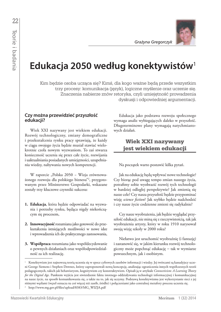 22 Teorie i badania *UDő\QD*UHJRUF]\N Edukacja 2050 według konektywistów1 Kim będzie osoba ucząca się? Kimś, dla kogo ważne będą przede wszystkim trzy procesy: komunikacja (język), logiczne myślenie oraz uczenie się. Znaczenia nabierze znów retoryka, czyli umiejętność prowadzenia dyskusji i odpowiedniej argumentacji. Czy można przewidzieć przyszłość edukacji? Wiek XXI nazywany jest wiekiem edukacji. Rozwój technologiczny, zmiany demograficzne i przekształcenia rynku pracy sprawiają, że każdy w ciągu swojego życia będzie musiał stawiać wielokrotnie czoła nowym wyzwaniom. To zaś stwarza konieczność uczenia się przez całe życie, rozwijania i uaktualniania posiadanych umiejętności, uzupełniania wiedzy, nabywania nowych kompetencji. W raporcie „Polska 2050 − Wizja zrównoważonego rozwoju dla polskiego biznesu”2, przygotowanym przez Ministerstwo Gospodarki, wskazane zostały trzy kluczowe czynniki sukcesu: 1. Edukacja, która będzie odpowiadać na wyzwania i potrzeby rynku, będąca nigdy niekończącym się procesem, 2. Innowacyjność rozumiana jako gotowość do przekształcenia istniejących możliwości w nowe idee i wprowadzenia ich do praktycznego zastosowania, 3. Współpraca rozumiana jako współdecydowanie o pewnych działaniach oraz współodpowiedzialność za ich realizację. Edukacja jako podstawa rozwoju społecznego wymaga analiz wybiegających daleko w przyszłość. Długoterminowe plany wymagają natychmiastowych działań. Wiek XXI nazywany jest wiekiem edukacji Na początek warto postawić kilka pytań. Jak na edukację będą wpływać nowe technologie? Czy biorąc pod uwagę tempo zmian naszego życia, potrafimy sobie wyobrazić rozwój tych technologii w bardziej odległej perspektywie? Jak zmienią się nasze cele? Czy nasza przyszłość będzie przypominać wizję science fiction? Jak szybko będzie nadchodzić i czy nasze życie codzienne zmieni się radykalnie? Czy nasze wyobrażenia, jak będzie wyglądać przyszłość edukacji, nie miną się z rzeczywistością, tak jak wyobrażenia artysty, który w roku 1910 narysował swoją wizję szkoły w 2000 roku? Niełatwo jest uruchomić wyobraźnię (i fantazję) i zastanowić się, w jakim kierunku rozwój technologiczny może popchnąć edukację tak w wymiarze powszechnym, jak i osobistym. 1 Konektywizm jest najnowszą teorią uczenia się w epoce cyfrowych zasobów informacji i wiedzy. Jej twórcami są kanadyjscy uczeni George Siemens i Stephen Downes, którzy zaproponowali nową koncepcję, analizując ograniczenia innych współczesnych teorii pedagogicznych, takich jak behawioryzm, kognitywizm czy konstruktywizm. Opisali ją w artykule Connectivism: A Learning Theory for the Digital Age. Punktem wyjścia jest stwierdzenie faktu istotnego oddziaływania technologii informacyjnej i komunikacyjnej na nasze życie, na sposób komunikowania się, a także na to, jak się uczymy. Podstawą konektywizmu jest wykorzystanie sieci z jej różnymi węzłami (węzeł oznacza tu coś więcej niż zasób, źródło) i połączeniami jako centralnej metafory procesu uczenia się. 2 http://www.mg.gov.pl/files/upload/8383/MG_WIZJA.pdf Mazowiecki Kwartalnik Edukacyjny Meritum 1 (32) 2014 (GXNDFMDZHGğXJNRQHNW\ZLVWÐZ 23 Teorie i badania Villemard, 1910 – Chromolithographie Paris, BNF, Estampes Źródło: http://www.ufunk.net/en/insolite/en-lan-2000-le-futur-imagine-en-1910-avec-24-illustrations-retro/ Zapowiedź przyszłości edukacji w teraźniejszości Zanim jednak spojrzymy w przyszłość, spróbujmy rozejrzeć się wokół i zaobserwować, które elementy tworzącego się cyfrowego świata, współczesności opisywanej jako płynna nowoczesność3, mogą mieć wpływ na szkołę i na to, w jaki sposób będziemy się uczyć. Zasoby Internetu rozrastają się w tempie błyskawicznym. Ilość informacji produkowana każdego roku wzrasta o 40%4. Po raz pierwszy suma cyfrowych informacji wyprodukowanych na świecie w ciągu jednego roku (2010) przekroczyła jeden zetabajt (1021). Stworzyło to nowe wyzwania dla nauki, edukacji, mediów i administracji. Zasoby o tak wielkiej skali, określane jako big data – ogromne nieustrukturalizowane zbiory – dostarczyły wartościowych danych do wszelkiego rodzaju badań. Dzięki temu można np. zbadać, jak uczą się ludzie i dopasować do każdego uczącego się odpowiedni dla niego zestaw materiałów, zadania i ćwiczenia, sposób ich prezentacji oraz sprawdzania wiedzy. Jest to dzia- łanie prowadzące do personalizacji procesu kształcenia. Wirtualny profil ucznia może być dostępny wszędzie i zawsze. Bez względu na to, gdzie i za pomocą jakiego urządzenia łączy się z zasobami (laptop, komórka, tablet), uczeń ma zawsze osobiste okno odbioru informacji dopasowanych do jego profilu. Zaczyna nas otaczać Internet wszechrzeczy (IoE Internet of everything) sieć łącząca ludzi, procesy, dane i przedmioty. Przez ostatnie 20 lat Internet połączył miliardy ludzi i komputerów, zmieniając sposób, w jaki żyjemy, komunikujemy się, uczymy i pracujemy. Obieg informacji, doświadczeń, emocji nigdy nie był szybszy. Ale to dopiero początek, gdyż 99% urządzeń, przedmiotów, obiektów i miejsc, z których na co dzień korzystamy, nie jest jeszcze włączonych w globalną sieć. Podłączenie ich do Internetu umożliwi powstanie nowych oddziaływań – tzw. efektu sieciowego pomiędzy ludźmi i przedmiotami, który stworzy nowe możliwości rozwoju zarówno pojedynczego człowieka, jak i całego społeczeństwa. Płynna nowoczesność (liquid modernity) – pojęcie stworzone przez socjologa i filozofa Zygmunta Baumana, mające służyć jako główna kategoria opisowa współczesności. 4 Wollan M. For Start-Ups That Aim at Giants, Sorting the Data Cloud Is the Next Big Thing, The New York Times 2011, December 25. 3 Meritum 1 (32) 2014 Mazowiecki Kwartalnik Edukacyjny *UDő\QD*UHJRUF]\N 24 Teorie i badania Coraz czę