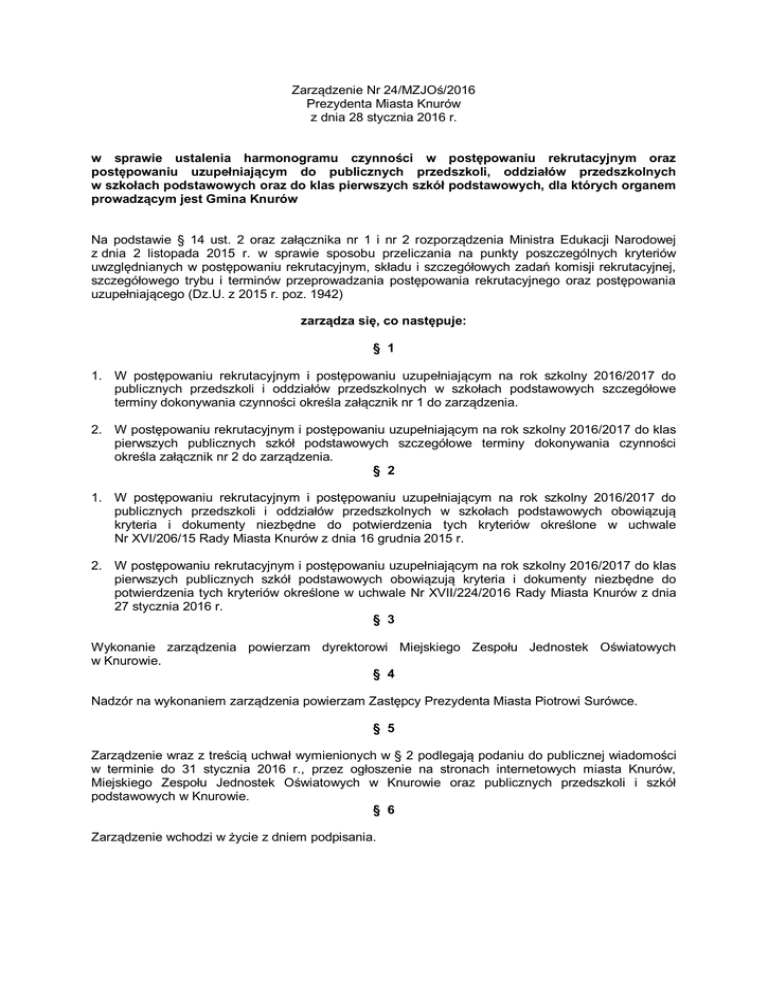 Zarządzenie Nr 24/MZJOś/2016 Prezydenta Miasta Knurów z dnia 28 stycznia 2016 r. w sprawie ustalenia harmonogramu czynności w postępowaniu rekrutacyjnym oraz postępowaniu uzupełniającym do publicznych przedszkoli, oddziałów przedszkolnych w szkołach podstawowych oraz do klas pierwszych szkół podstawowych, dla których organem prowadzącym jest Gmina Knurów Na podstawie § 14 ust. 2 oraz załącznika nr 1 i nr 2 rozporządzenia Ministra Edukacji Narodowej z dnia 2 listopada 2015 r. w sprawie sposobu przeliczania na punkty poszczególnych kryteriów uwzględnianych w postępowaniu rekrutacyjnym, składu i szczegółowych zadań komisji rekrutacyjnej, szczegółowego trybu i terminów przeprowadzania postępowania rekrutacyjnego oraz postępowania uzupełniającego (Dz.U. z 2015 r. poz. 1942) zarządza się, co następuje: § 1 1. W postępowaniu rekrutacyjnym i postępowaniu uzupełniającym na rok szkolny 2016/2017 do publicznych przedszkoli i oddziałów przedszkolnych w szkołach podstawowych szczegółowe terminy dokonywania czynności określa załącznik nr 1 do zarządzenia. 2. W postępowaniu rekrutacyjnym i postępowaniu uzupełniającym na rok szkolny 2016/2017 do klas pierwszych publicznych szkół podstawowych szczegółowe terminy dokonywania czynności określa załącznik nr 2 do zarządzenia. § 2 1. W postępowaniu rekrutacyjnym i postępowaniu uzupełniającym na rok szkolny 2016/2017 do publicznych przedszkoli i oddziałów przedszkolnych w szkołach podstawowych obowiązują kryteria i dokumenty niezbędne do potwierdzenia tych kryteriów określone w uchwale Nr XVI/206/15 Rady Miasta Knurów z dnia 16 grudnia 2015 r. 2. W postępowaniu rekrutacyjnym i postępowaniu uzupełniającym na rok szkolny 2016/2017 do klas pierwszych publicznych szkół podstawowych obowiązują kryteria i dokumenty niezbędne do potwierdzenia tych kryteriów określone w uchwale Nr XVII/224/2016 Rady Miasta Knurów z dnia 27 stycznia 2016 r. § 3 Wykonanie zarządzenia powierzam dyrektorowi Miejskiego Zespołu Jednostek Oświatowych w Knurowie. § 4 Nadzór na wykonaniem zarządzenia powierzam Zastępcy Prezydenta Miasta Piotrowi Surówce. § 5 Zarządzenie wraz z treścią uchwał wymienionych w § 2 podlegają podaniu do publicznej wiadomości w terminie do 31 stycznia 2016 r., przez ogłoszenie na stronach internetowych miasta Knurów, Miejskiego Zespołu Jednostek Oświatowych w Knurowie oraz publicznych przedszkoli i szkół podstawowych w Knurowie. § 6 Zarządzenie wchodzi w życie z dniem podpisania. Załącznik nr 1 do Zarządzenia Nr 24/MZJOś/2016 Prezydenta Miasta Knurów z dnia 28 stycznia 2016 r. Terminy postępowania rekrutacyjnego oraz postępowania uzupełniającego do publicznych przedszkoli i oddziałów przedszkolnych w szkołach podstawowych, dla których organem prowadzącym jest Gmina Knurów na rok szkolny 2016/2017 Lp. 1. 1. 2. 3. 4. 5. 6. 7. Rodzaj czynności 2. Składanie deklaracji o kontynuacji wychowania przedszkolnego Złożenie wniosku o przyjęcie do przedszkola, oddziału przedszkolnego w szkole podstawowej wraz z dokumentami potwierdzającymi spełnienie przez kandydata warunków lub kryteriów branych pod uwagę w postępowaniu rekrutacyjnym Weryfikacja wniosków przez komisje rekrutacyjne Podanie przez komisję rekrutacyjną do publicznej wiadomości listy kandydatów zakwalifikowanych i kandydatów niezakwalifikowanych Potwierdzenie przez rodzica kandydata woli przyjęcia w postaci pisemnego oświadczenia Podanie przez komisję rekrutacyjną do publicznej wiadomości listy kandydatów przyjętych i kandydatów nieprzyjętych Składanie wniosków o sporządzenie uzasadnienia odmowy przyjęcia 8. Przygotowanie i wydanie uzasadnienia odmowy przyjęcia 9. Złożenie do dyrektora przedszkola/ szkoły podstawowej odwołania od rozstrzygnięcia komisji rekrutacyjnej wyrażonego w pisemnym uzasadnieniu odmowy przyjęcia Rozstrzygnięcie przez dyrektora przedszkola/szkoly podstawowej odwołania od rozstrzygnięcia komisji rekrutacyjnej wyrażonego w pisemnym uzasadnieniu odmowy przyjęcia 10. Termin w postępowaniu rekrutacyjnym Termin w postępowaniu uzupełniającym 3. 4. od 22 lutego 2016 r. godz. 8,00 do 3 marca 2016 r. godz. 15,00 od 10 marca 2016 r. godz. 8,00 do 25 marca 2016 r. godz. 15,00 od 09 maja 2016 r. godz. 8,00 do 13 maja 2016 r. godz. 15,00 od 10 marca 2016 r. godz. 8,00 do 31 marca 2016 r. godz. 15,00 22 kwietnia 2016 r. godz. 8,00 od 09 maja 2016 r. godz. 8,00 do 18 maja 2016 r. godz. 15,00 01 czerwca 2016 r. godz. 8,00 od 22 kwietnia 2016 r. godz. 8,00 do 02 maja 2016 r. godz. 15,00 05 maja 2016 r. godz. 8,00 01 czerwca 2016 r. godz. 8,00 do 06 czerwca 2016 r. godz. 15,00 08 czerwca 2016 r. godz. 15,00 X do 7 dni od dnia podania do publicznej wiadomości listy kandydatów przyjętych i kandydatów nieprzyjętych do 5 dni od daty złożenia wniosku o sporządzenie uzasadnienia odmowy przyjęcia do 7 dni od terminu otrzymania pisemnego uzasadnienia odmowy przyjęcia do 7 dni od dnia złożenia do dyrektora odwołania od rozstrzygnięcia komisji rekrutacyjnej Załącznik nr 2 do Zarządzenia Nr 24/MZJOś/2016 Prezydenta Miasta Knurów z dnia 28 stycznia 2016 r. Terminy postępowania rekrutacyjnego oraz postępowania uzupełniającego do klas pierwszych publicznych szkół podstawowych, dla których organem prowadzącym jest Gmina Knurów na rok szkolny 2016/2017 Lp. 1. 1. 2. 3. 4. 5. 6. 7. 8. Rodzaj czynności 2. Złożenie wniosku o kontynuacji nauki w klasie pierwszej (dotyczy dzieci ur. w roku 2009, które w roku szkolnym 2015/2016 rozpoczęły naukę w klasie pierwszej szkoły podstawowej) Zgłoszenie kandydata do klasy pierwszej zamieszkałego w obwodzie szkoły podstawowej Złożenie wniosku o przyjęcie do klasy pierwszej szkoły podstawowej wraz z dokumentami potwierdzającymi spełnienie przez kandydata warunków lub kryteriów branych pod uwagę w postępowaniu rekrutacyjnym Weryfikacja wniosków przez komisje rekrutacyjne P