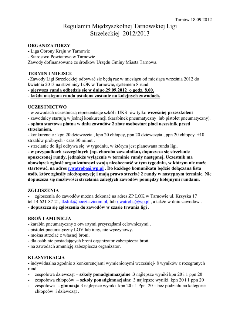 Tarnów 18.09.2012 Regulamin Międzyszkolnej Tarnowskiej Ligi Strzeleckiej 2012/2013 ORGANIZATORZY - Liga Obrony Kraju w Tarnowie - Starostwo Powiatowe w Tarnowie Zawody dofinansowane ze środków Urzędu Gminy Miasta Tarnowa. TERMIN I MIEJSCE - Zawody Ligi Strzeleckiej odbywać się będą raz w miesiącu od miesiąca września 2012 do kwietnia 2013 na strzelnicy LOK w Tarnowie, systemem 8 rund. - pierwsza runda odbędzie się w dniuo.29.09.2012 o godz. 8.00. - każda następna runda ustalona zostanie na kolejnych zawodach. UCZESTNICTWO - w zawodach uczestniczą reprezentacje szkół i UKS -ów tylko wcześniej przeszkoleni - zawodnicy startują w jednej konkurencji (karabinek pneumatyczny lub pistolet pneumatyczny). - opłata startowa płatna w dniu zawodów 2 złote osobostart płaci uczestnik przed strzelaniem. - konkurencje : kpn 20 dziewczęta , kpn 20 chłopcy, ppn 20 dziewczęta , ppn 20 chłopcy +10 strzałów próbnych - czas 30 minut . - strzelanie do ligi odbywa się w tygodniu, w którym jest planowana runda ligi. - w przypadkach szczególnych (np. choroba zawodnika), dopuszcza się strzelanie opuszczonej rundy, jednakże wyłącznie w terminie rundy następnej. Uczestnik ma obowiązek zgłosić organizatorowi swoją nieobecność w tym tygodniu, w którym nie może startować, na adres [email protected] . Do każdego komunikatu będzie dołączana lista osób, które zgłosiły niedyspozycję i mają prawo strzelać 2 rundy w następnym terminie. Nie dopuszcza się możliwości strzelania zaległych zawodów pomiędzy kolejnymi rundami. ZGŁOSZENIA - zgłoszenia do zawodów można dokonać na adres ZP LOK w Tarnowie ul. Krzyska 17 tel.14 621-87-21, [email protected], lub [email protected] , a także w dniu zawodów . - dopuszcza się zgłoszenia do zawodów w czasie trwania ligi . BROŃ I AMUNICJA - karabin pneumatyczny z otwartymi przyrządami celowniczymi . - pistolet pneumatyczny LOV lub inny, nie wyczynowy. - można strzelać z własnej broni. - dla osób nie posiadających broni organizator zabezpiecza broń. - na zawodach amunicję zabezpiecza organizator. KLASYFIKACJA - indywidualna zgodnie z konkurencjami wymienionymi wcześniej- 8 wyników z rozegranych rund - zespołowa dziewcząt – szkoły ponadgimnazjalne :3 najlepsze wyniki kpn 20 i 1 ppn 20 - zespołowa chłopców – szkoły ponadgimnazjalne 3 najlepsze wyniki kpn 20 i 1 ppn 20 - zespołowa - gimnazja 3 najlepsze wyniki kpn 20 i 1 Ppn 20 – bez podziału na kategorie chłopców i dziewcząt . - Wyniki ze szkolnej ligi strzeleckiej zostaną zaliczone do współzawodnictwa sportowego szkół prowadzonego przez SZS na terenie Miasta Tarnowa i Powiatu Tarnowskiego. NAGRODY I WYRÓŻNIENIA - zespołowa dziewczęta , chłopcy oraz gimnazja bez podziału na płeć, miejsca I - III puchary i dyplomy IV - VI dyplomy - indywidualna I - III medale i dyplomy IV - VI dyplomy SPRAWY ORGANIZACYJNE - organizator nie pokrywa kosztów dojazdu i posiłków. - podsumowanie wyników nastąpi w miesiącu maju 2012. - interpretacja niniejszego regulaminu należy do organizatorów. - wyniki i bieżące informacje zamieszczane będą na stronie - tkslok.pl - dodatkowych informacji na temat ligi oraz możliwości przeszkolenia przed starem w lidze udziela Sekretarz Zarządu Powiatowego LOK Jerzy Madej tel – 604 45 88 19 lub 508 06 58 62 - Treningi z broni pneumatycznej do ligi można odbywać na strzelnicy – koszt treningu 5 złotych ( 30 śrutów , 2 tarcze ,broń ,strzelnica ). - Przewodniczącym Komisji Klasyfikacyjnej jest pan Ryszard Wątroba , który przyjmuje uwagi do komunikatu na adres [email protected] lub tel 698 055 714. Dla uniknięcia nieporozumień spowodowanych nieczytelnie wpisanymi nazwiskami i imionami przez zawodników na metryczkach strzelań, proszę opiekunów o przesłanie list startujących na podany wyżej adres Przewodniczącego Komisji Klasyfikacyjnej. Wyniki z nieczytelnie lub niekompletnie wypełnionych metryczek nie będą liczone i zamieszczane w komunikatach. Za prawidłowo wypełnioną metryczkę odpowiada zawodnik. Regulamin został przyjęty na Posiedzeniu Zarządu Powiatowego LOK Tarnów w dniu 18.09.2012. Info. mgr Grzegorz Dzierwa