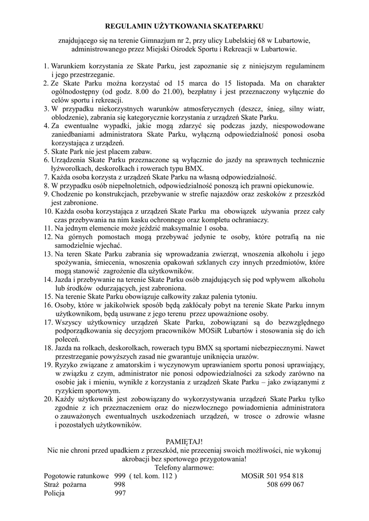 REGULAMIN UŻYTKOWANIA SKATEPARKU znajdującego się na terenie Gimnazjum nr 2, przy ulicy Lubelskiej 68 w Lubartowie, administrowanego przez Miejski Ośrodek Sportu i Rekreacji w Lubartowie. 1. Warunkiem korzystania ze Skate Parku, jest zapoznanie się z niniejszym regulaminem i jego przestrzeganie. 2. Ze Skate Parku można korzystać od 15 marca do 15 listopada. Ma on charakter ogólnodostępny (od godz. 8.00 do 21.00), bezpłatny i jest przeznaczony wyłącznie do celów sportu i rekreacji. 3. W przypadku niekorzystnych warunków atmosferycznych (deszcz, śnieg, silny wiatr, oblodzenie), zabrania się kategorycznie korzystania z urządzeń Skate Parku. 4. Za ewentualne wypadki, jakie mogą zdarzyć się podczas jazdy, niespowodowane zaniedbaniami administratora Skate Parku, wyłączną odpowiedzialność ponosi osoba korzystająca z urządzeń. 5. Skate Park nie jest placem zabaw. 6. Urządzenia Skate Parku przeznaczone są wyłącznie do jazdy na sprawnych technicznie łyżworolkach, deskorolkach i rowerach typu BMX. 7. Każda osoba korzysta z urządzeń Skate Parku na własną odpowiedzialność. 8. W przypadku osób niepełnoletnich, odpowiedzialność ponoszą ich prawni opiekunowie. 9. Chodzenie po konstrukcjach, przebywanie w strefie najazdów oraz zeskoków z przeszkód jest zabronione. 10. Każda osoba korzystająca z urządzeń Skate Parku ma obowiązek używania przez cały czas przebywania na nim kasku ochronnego oraz kompletu ochraniaczy. 11. Na jednym elemencie może jeździć maksymalnie 1 osoba. 12. Na górnych pomostach mogą przebywać jedynie te osoby, które potrafią na nie samodzielnie wjechać. 13. Na teren Skate Parku zabrania się wprowadzania zwierząt, wnoszenia alkoholu i jego spożywania, śmiecenia, wnoszenia opakowań szklanych czy innych przedmiotów, które mogą stanowić zagrożenie dla użytkowników. 14. Jazda i przebywanie na terenie Skate Parku osób znajdujących się pod wpływem alkoholu lub środków odurzających, jest zabroniona. 15. Na terenie Skate Parku obowiązuje całkowity zakaz palenia tytoniu. 16. Osoby, które w jakikolwiek sposób będą zakłócały pobyt na terenie Skate Parku innym użytkownikom, będą usuwane z jego terenu przez upoważnione osoby. 17. Wszyscy użytkownicy urządzeń Skate Parku, zobowiązani są do bezwzględnego podporządkowania się decyzjom pracowników MOSiR Lubartów i stosowania się do ich poleceń. 18. Jazda na rolkach, deskorolkach, rowerach typu BMX są sportami niebezpiecznymi. Nawet przestrzeganie powyższych zasad nie gwarantuje uniknięcia urazów. 19. Ryzyko związane z amatorskim i wyczynowym uprawianiem sportu ponosi uprawiający, w związku z czym, administrator nie ponosi odpowiedzialności za szkody zarówno na osobie jak i mieniu, wynikłe z korzystania z urządzeń Skate Parku – jako związanymi z ryzykiem sportowym. 20. Każdy użytkownik jest zobowiązany do wykorzystywania urządzeń Skate Parku tylko zgodnie z ich przeznaczeniem oraz do niezwłocznego powiadomienia administratora o zauważonych ewentualnych uszkodzeniach urządzeń, w trosce o zdrowie własne i pozostałych użytkowników. PAMIĘTAJ! Nic nie chroni przed upadkiem z przeszkód, nie przeceniaj swoich możliwości, nie wykonuj akrobacji bez sportowego przygotowania! Telefony alarmowe: Pogotowie ratunkowe 999 ( tel. kom. 112 ) MOSiR 501 954 818 Straż pożarna 998 508 699 067 Policja 997