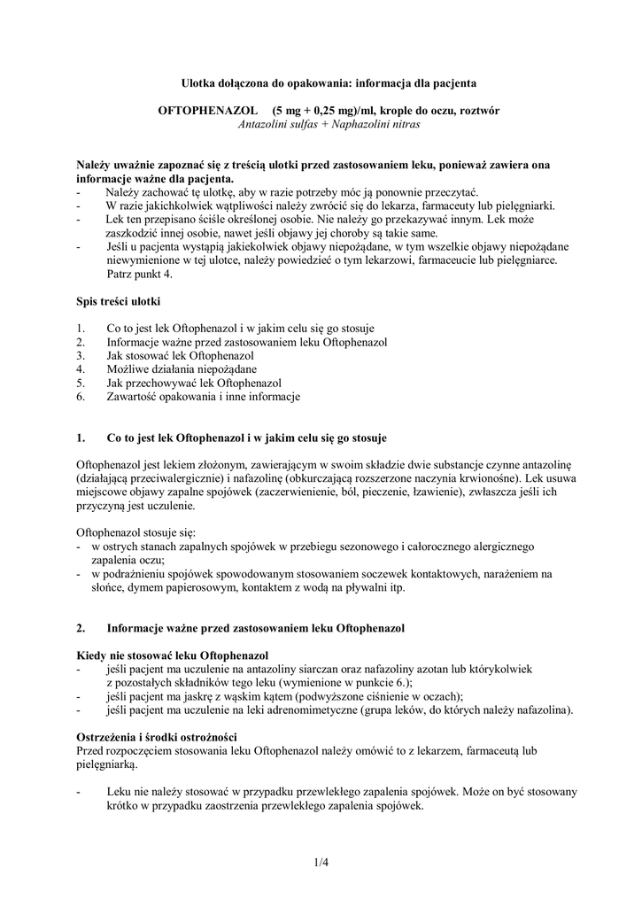 Ulotka dołączona do opakowania: informacja dla pacjenta OFTOPHENAZOL (5 mg + 0,25 mg)/ml, krople do oczu, roztwór Antazolini sulfas + Naphazolini nitras Należy uważnie zapoznać się z treścią ulotki przed zastosowaniem leku, ponieważ zawiera ona informacje ważne dla pacjenta. Należy zachować tę ulotkę, aby w razie potrzeby móc ją ponownie przeczytać. W razie jakichkolwiek wątpliwości należy zwrócić się do lekarza, farmaceuty lub pielęgniarki. Lek ten przepisano ściśle określonej osobie. Nie należy go przekazywać innym. Lek może zaszkodzić innej osobie, nawet jeśli objawy jej choroby są takie same. Jeśli u pacjenta wystąpią jakiekolwiek objawy niepożądane, w tym wszelkie objawy niepożądane niewymienione w tej ulotce, należy powiedzieć o tym lekarzowi, farmaceucie lub pielęgniarce. Patrz punkt 4. Spis treści ulotki 1. 2. 3. 4. 5. 6. Co to jest lek Oftophenazol i w jakim celu się go stosuje Informacje ważne przed zastosowaniem leku Oftophenazol Jak stosować lek Oftophenazol Możliwe działania niepożądane Jak przechowywać lek Oftophenazol Zawartość opakowania i inne informacje 1. Co to jest lek Oftophenazol i w jakim celu się go stosuje Oftophenazol jest lekiem złożonym, zawierającym w swoim składzie dwie substancje czynne antazolinę (działającą przeciwalergicznie) i nafazolinę (obkurczającą rozszerzone naczynia krwionośne). Lek usuwa miejscowe objawy zapalne spojówek (zaczerwienienie, ból, pieczenie, łzawienie), zwłaszcza jeśli ich przyczyną jest uczulenie. Oftophenazol stosuje się: - w ostrych stanach zapalnych spojówek w przebiegu sezonowego i całorocznego alergicznego zapalenia oczu; - w podrażnieniu spojówek spowodowanym stosowaniem soczewek kontaktowych, narażeniem na słońce, dymem papierosowym, kontaktem z wodą na pływalni itp. 2. Informacje ważne przed zastosowaniem leku Oftophenazol Kiedy nie stosować leku Oftophenazol jeśli pacjent ma uczulenie na antazoliny siarczan oraz nafazoliny azotan lub którykolwiek z pozostałych składników tego leku (wymienione w punkcie 6.); jeśli pacjent ma jaskrę z wąskim kątem (podwyższone ciśnienie w oczach); jeśli pacjent ma uczulenie na leki adrenomimetyczne (grupa leków, do których należy nafazolina). Ostrzeżenia i środki ostrożności Przed rozpoczęciem stosowania leku Oftophenazol należy omówić to z lekarzem, farmaceutą lub pielęgniarką. - Leku nie należy stosować w przypadku przewlekłego zapalenia spojówek. Może on być stosowany krótko w przypadku zaostrzenia przewlekłego zapalenia spojówek. 1/4 - Należy przestrzegać zaleconego czasu stosowania leku oraz nie przekraczać zalecanych dawek, ponieważ może dojść do nasilenia obrzęku i zwiększenia wydzielania, a także powstania trwałych zmian w nabłonku oka. Lek Oftophenazol a inne leki Należy powiedzieć lekarzowi lub farmaceucie o wszystkich lekach przyjmowanych obecnie lub ostatnio, a także o lekach, które pacjent planuje stosować. Nie stosować leku jednocześnie z lekami przeciwdepresyjnymi należącymi do grupy tzw. inhibitorów monoaminooksydazy (np. selegilina) lub trójpierścieniowych leków przeciwdepresyjnych (np. imipramina, amitryptylina). Ciąża i karmienie piersią Jeśli pacjentka jest w ciąży lub karmi piersią, przypuszcza że może być w ciąży lub gdy planuje mieć dziecko, powinna poradzić się lekarza lub farmaceuty przed zastosowaniem tego leku. Lek może być stosowany w ciąży jedynie w przypadku, gdy w opinii lekarza korzyść dla matki przeważa nad potencjalnym zagrożeniem dla płodu. U kobiet karmiących piersią Oftophenazol wymaga zachowania ostrożności. Prowadzenie pojazdów i obsługiwanie maszyn Lek może zaburzać zdolność widzenia i dlatego należy go stosować ostrożnie u osób prowadzących pojazdy i obsługujących maszyny. Lek Oftophenazol zawiera benzalkoniowy chlorek Oftophenazol zawiera benzalkoniowy chlorek, który pełni rolę środka konserwującego w leku. Benzalkoniowy chlorek może powodować podrażnienie oczu i zmieniać zabarwienie miękkich soczewek kontaktowych. Jeśli pacjent nosi soczewki kontaktowe, powinien porozumieć się z lekarzem przed zastosowaniem leku. Przed zakropleniem leku należy zdjąć soczewki kontaktowe i założyć je ponownie po upływie co najmniej 15 minut od jego zakroplenia. 3. Jak stosować lek Oftophenazol Ten lek należy zawsze stosować zgodnie z zaleceniami lekarza. W razie wątpliwości należy zwrócić się do lekarza lub farmaceuty. Lek przeznaczony do stosowania do oczu. Stosowanie u dorosłych i dzieci powyżej 6 lat: 1-2 krople do worka spojówkowego, w razie potrzeby dawkę można powtórzyć po 4-6 godzinach. Bez zalecenia lekarza, leku nie należy stosować dłużej niż przez 3-5 dni. Sposób podawania Lek jest przeznaczony tylko do użytku zewnętrznego – miejscowo do worka spojówkowego. Nie należy dotykać końcówki kroplomierza, ponieważ może to spowodować zanieczyszczenie zawartości butelki. 1. Przed zakropleniem leku należy dokładnie umyć ręce. 2. Odkręcić zakrętkę znajdującą się na butelce. 3. Przechylić głowę do tyłu i odciągnąć dolną powiekę w dół, aby utworzyć kieszonkę pomiędzy powieką i gałką oczną. 2/4 4. Odwrócić butelkę i delikatnie nacisnąć kciukiem lub palcem wskazującym na ściankę, aż do wyciśnięcia jednej kropli leku do oka. Nie należy dotykać końcówką kroplomierza do oka, ani powiek. Jeśli kropla nie trafiła do oka, należy zakroplić następną. 5. Po zakropleniu leku Oftophenazol należy przez około 2 minuty delikatnie uciskać wewnętrzny kącik oka. Pomoże to zahamować wchłanianie leku do organizmu. 6. Jeśli lekarz zalecił zakraplanie leku także do drugiego oka, należy powtórzyć czynności z punktów 3., 4. i 5. 7. Kroplomierz jest tak zaprojektowany, aby dokładnie odmierzać krople, dlatego nie należy powiększać otworu w kroplomierzu. 8. Po zakropleniu należy zakręcić 