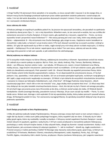 1 rozdział 1 Drogi Teofilu! W pierwszym liście opisałem ci to wszystko, co Jezus zaczął robić i nauczać 2 aż do owego dnia, w którym mocą Ducha Świętego przekazał wybranym przez siebie apostołom ostatnie polecenia i został wzięty do nieba. 3 Im też dał wiele dowodów, że żyje pomimo doznanych cierpień i śmierci. Przez czterdzieści dni ukazywał się im i rozmawiał o królestwie Bożym. Jezus zabrany do nieba 4 Podczas jednego ze wspólnych posiłków polecił im, by jeszcze nie opuszczali Jerozolimy, ale poczekali na spełnienie się obietnicy danej przez Ojca. 5 – Już o niej słyszeliście. Mówiłem wam, że Jan zanurzał w wodzie, lecz wy za kilka dni zostaniecie zanurzeni w Duchu Świętym. 6 Innym razem, gdy spotkali się z Jezusem, zapytali Go: – Panie, czy teraz wyzwolisz Izrael i przywrócić nasze królestwo? 7 – Nie waszą sprawą jest znać czas i daty, które swą władzą ustalił Ojciec – odpowiedział. 8 – Wy otrzymacie moc Ducha Świętego, gdy zstąpi na was, i będziecie moimi świadkami w Jerozolimie i całej Judei, w Samarii i aż po krańce ziemi. 9 Po tych słowach wzniósł się na oczach uczniów i zniknął w obłoku. 10 I gdy tak wpatrywali się za Nim w niebo, nagle stanęli przy nich dwaj ubrani na biało mężczyźni, 11 którzy zapytali: – Galilejczycy! Po co tak stoicie i wpatrujecie się w niebo? Ten sam Jezus, zabrany od was do nieba, pewnego dnia powróci w taki sam sposób, w jaki widzieliście Go odchodzącego. Maciej wybrany na miejsce Judasza 12 To wszystko miało miejsce na Górze Oliwnej, oddalonej do Jerozolimy o kilometr. Apostołowie wrócili do miasta 13 i zebrali się w swoim pokoju na piętrze. Byli to: Piotr, Jan, Jakub, Andrzej, Filip, Tomasz, Bartłomiej, Mateusz, Jakub – syn Alfeusza, Szymon zelota i Juda – syn Jakuba. 14 Wszyscy oni, razem z innymi kobietami oraz Marią, matką Jezusa, i Jego braćmi nieustannie i jednomyślnie trwali na modlitwie. 15 W tym właśnie czasie, gdy zebrało się około stu dwudziestu wierzących, Piotr powstał i rzekł: 16 – Bracia! Musiało się wypełnić proroctwo Pisma, które Duch Święty ustami króla Dawida wypowiedział o Judaszu. To on doprowadził do aresztowania Jezusa, 17 bo był jednym z nas, apostołów, i miał udział w tej służbie. 18 I on za krwawe pieniądze kupił pole, na którym runął głową w dół i pękł, a jego wnętrzności wypłynęły na zewnątrz. 19 Wieść o tym dotarła do wszystkich mieszkańców Jerozolimy i nazwano to miejsce po hebrajsku Hakeldamach, czyli „Pole Krwi”. 20 Księga Psalmów mówi bowiem: „Niech opustoszeje jego dom i niech nikt w nim nie mieszka” oraz „Jego służbę niech przejmie ktoś inny”. 21 Musi więc ktoś inny dołączyć do nas jako świadek zmartwychwstania Jezusa – ktoś, kto tak jak my był z Panem od samego początku, 22 od chwili Jego zanurzenia przez Jana Chrzciciela aż do dnia, w którym został wzięty do nieba. 23 Wybrali dwóch kandydatów: Józefa (zwanego Barsabą, pseudonim Justus) i Macieja, 24 po czym zaczęli się modlić: – Panie, Ty znasz każde serce. Wskaż nam, którego z nich wybrałeś 25 do tej apostolskiej służby, którą Judasz porzucił i poszedł własną drogą. 26 Następnie podali im losy. Ten zaznaczony wyciągnął Maciej. Za aprobatą wszystkich dołączył więc do grona jedenastu apostołów. 2 rozdział Duch Święty przychodzi w Dniu Pięćdziesiątnicy 1 Kilka dni później nadeszło święto Pięćdziesiątnicy. Wszyscy wierzący znowu byli razem w tym samym miejscu. 2 I nagle dał się słyszeć z nieba szum jakby potężnego huraganu, który wypełnił cały ten dom. 3 Ukazały się im także jakby języki ognia, które się rozdzieliły i osiadły na każdym. 4 Wszyscy zostali napełnieni Duchem Świętym i zaczęli mówić obcymi im językami, zgodnie z wolą Ducha. 5 W tym czasie przebywali w Jerozolimie pobożni Hebrajczycy, pochodzący z wielu różnych krajów świata. 6 Gdy usłyszeli hałas, zbiegli się tłumnie i stanęli oszołomieni. Każdy z nich słyszał bowiem, jak uczniowie mówią ich własnym językiem. 7 – Jak to możliwe? – dziwili się, ciągle oszołomieni. – Przecież wszyscy ci ludzie pochodzą z Galilei? 8 Dlaczego więc słyszymy swój własny język, język kraju, w którym się urodziliśmy? 9 Partowie, Medowie i Elamici, mieszkańcy Mezopotamii, Judei, Kapadocji, Pontu, Azji, 10 Frygii, Pamfilii, Egiptu, mieszkańcy Libii z okolic Cyreny, przybysze z Rzymu (zarówno Hebrajczycy, jak i poganie nawróceni na judaizm), 11 Kreteńczycy i Arabowie – wszyscy słyszymy, jak mówią w naszych ojczystych językach o wielkich dziełach Boga! 12 Oszołomieni i niepewni pytali siebie nawzajem: – Co to może znaczyć? 13 – Spili się niedojrzałym winem – drwili jednak niektórzy. Piotr przemawia do tłumu 14 Wtedy wystąpił Piotr z pozostałymi jedenastoma, podniósł ręce, by uciszyć tłum, i zawołał: – Posłuchajcie mnie uważnie wszyscy przybysze i mieszkańcy Jerozolimy! 15 Ci ludzie nie są pijani, jak niektórzy podejrzewają. Jest dopiero dziewiąta rano! 16 To, co widzicie, zostało przed wiekami zapowiedziane przez proroka Joela: 17 „W ostatnich dniach – mówi Bóg – ześlę mego Ducha na różnych ludzi: wasi synowie i córki będą prorokować, młodzieńcy będą mieć widzenia, a starcy – sny. 18 Ześlę mego Ducha na wszystkie swoje sługi, na mężczyzn i kobiety, i będą prorokować. 19 I uczynię cudowne znaki wysoko na niebie i nisko na ziemi. Krew, ogień i kłęby dymu powstaną na ziemi. 20 Słońce na niebie zgaśnie, a księżyc stanie się krwawoczerwony – zanim nadejdzie wielki i wspaniały Dzień Pana. 21 Lecz każdy, kto wezwie imienia Pana, będzie zbawiony”. 22 Posłuchajcie mnie, Izraelici! Bóg w oczywisty sposób udzielił poparcia Jezusowi z Nazaretu, przez którego uczynił wśród was wielkie cuda i znaki, o czym doskonale wiecie. 23 Zgodnie ze swym o