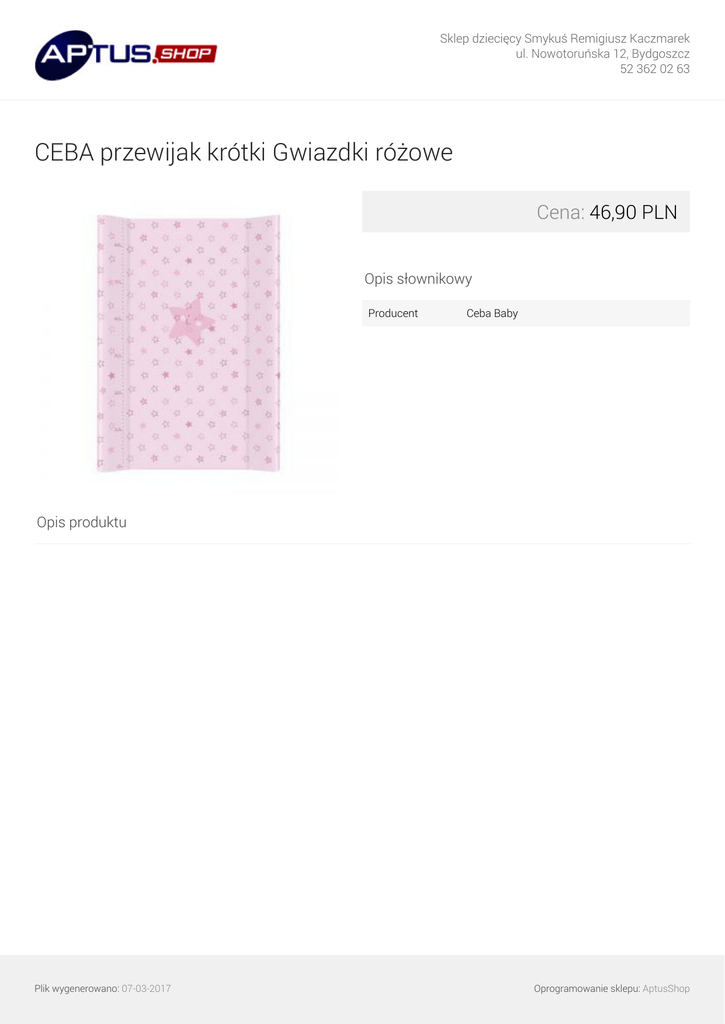 Sklep dziecięcy Smykuś Remigiusz Kaczmarek ul. Nowotoruńska 12, Bydgoszcz 52 362 02 63 CEBA przewijak krótki Gwiazdki różowe Cena: 46,90 PLN Opis słownikowy Producent Ceba Baby Opis produktu Plik wygenerowano: 07-03-2017 Powered by TCPDF (www.tcpdf.org) Oprogramowanie sklepu: AptusShop