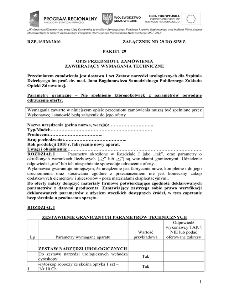 „Wydatek współfinansowany przez Unię Europejską ze środków Europejskiego Funduszu Rozwoju Regionalnego oraz budŜetu Województwa Mazowieckiego w ramach Regionalnego Programu Operacyjnego Województwa Mazowieckiego 2007-2013” RZP-16/IM/2010 ZAŁĄCZNIK NR 29 DO SIWZ PAKIET 29 OPIS PRZEDMIOTU ZAMÓWIENIA ZAWIERAJĄCY WYMAGANIA TECHNICZNE Przedmiotem zamówienia jest dostawa 1 szt Zestaw narzędzi urologicznych dla Szpitala Dziecięcego im prof. dr. med. Jana Bogdanowicza Samodzielnego Publicznego Zakładu Opieki Zdrowotnej. Parametry graniczne – Nie spełnienie któregokolwiek z parametrów powoduje odrzucenie oferty. Wymagania zawarte w niniejszym opisie przedmiotu zamówienia muszą być spełnione przez Wykonawcę i stanowić będą załącznik do jego oferty Nazwa urządzenia (pełna nazwa, wersja):……………………….. Typ/Model:………………………………………………………… Producent:…………………………….. Kraj pochodzenia:………………………………….. Rok produkcji 2010 r. fabrycznie nowy aparat. Uwagi i objaśnienia:…………………………………………………………………………… Parametry określone w Rozdziale I jako „tak”, oraz parametry o ROZDZIAŁ I określonych warunkach liczbowych („≥” lub „≤”) są warunkami granicznymi. Udzielenie odpowiedzi „nie” lub ich niespełnienie spowoduje odrzucenie oferty. Wykonawca gwarantuje niniejszym, Ŝe urządzenie jest fabrycznie nowe, kompletne i do jego uruchomienia oraz stosowania zgodnie z przeznaczeniem nie jest konieczny zakup dodatkowych elementów i akcesoriów - poza materiałami eksploatacyjnymi. Do oferty naleŜy dołączyć materiały firmowe potwierdzające zgodność deklarowanych parametrów z danymi producenta. Zamawiający zastrzega sobie prawo weryfikacji deklarowanych parametrów z uŜyciem wszelkich dostępnych źródeł, w tym zapytanie bezpośrednio u producenta sprzętu. ROZDZIAŁ I Lp 1. ZESTAWIENIE GRANICZNYCH PARAMETRÓW TECHNICZNYCH Odpowiedź wykonawcy TAK \ Wartość NIE lub podać Parametry wymagane aparatu przykładowa oferowane zakresy ZESTAW NARZĘDZI UROLOGICZNYCH Do zestawu narzędzi urologicznych wchodzą cytoskopy: -cytoskop roboczy ze skośną optyką 1 szt – Nr 10 Ch Tak Tak 1 2. 3. 4. 5. 6. 7. 8. 9. 10. 11. 12. 13. 14. -cytoskop- urethotom z zestawem noŜy 1 szt – Nr 9 Ch -cytoskop roboczy z optyką na wprost 1 szt – Nr 10 Ch. - noŜe proste w zestawie 3 szt, -noŜe zimne okrągłe w zestawie 3 szt, -noŜe haczykowate w zestawie 6 szt, -nóŜ zimny sierpowaty w zestawie 6szt. -kleszczyki biopsyjne półsztywne 2 szt w zamawianym rozmiarze -noŜyczki półsztywne 1 szt -płaszcz cystoskopowy dwukranikowy z kanałem roboczym ( zamawiane rozmiary) 1szt – Nr 10 i 1 szt. - Nr 12 Ch -obturator do płaszcza cystoskopowego 1 szt - Nr 10 Ch i 1 szt. Nr 12 Ch. -płaszcz uretrotomu jednokranikowy 1 szt Nr 12 Ch -oburator do płaszcza uretromu 1 szt – Nr 12 Ch -element roboczy pasywny 1 szt ROZDZIAŁ II 1. 2. 3. 5. 6. 7. 8. 9. Tak Tak Tak Tak Tak Tak Tak Tak Tak Tak Zawiera wymagane warunki gwarancji i serwisowania WYMAGANE WARUNKI GWARANCJI I SERWISU Wykonawca udziela minimum 24 miesięcznej gwarancji od daty uruchomienia, przeszkolenia pracowników i podpisania protokołu odbioru. W przypadku jeśli producent danego urządzenia określi gwarancję dłuŜszą niŜ 24 miesiące, Wykonawca automatycznie udzieli gwarancji identycznej jak określona przez producenta. Przez cały okres trwania umowy Wykonawca zobowiązany jest do: • przedłuŜenia okresu gwarancji o okres naprawy, • wstawienia sprzętu zastępczego na okres naprawy przy naprawach trwających powyŜej 7 dni kalendarzowych • wymiany aparatu na nowy w przypadku 3 – krotnej awarii lub naprawy tego samego podzespołu lub elementu • wymiana aparatu w przypadku określonym w pkt. 3 nastąpi w ciągu 14 dni od daty zgłoszenia 4-tej naprawy lub awarii tego samego podzespołu lub elementu. Urządzenia będą opakowane w sposób zabezpieczający je przed uszkodzeniami w transporcie do siedziby Zamawiającego. Serwis gwarancyjny będzie prowadzony w całości przez Wykonawcę. Wykonawca realizować będzie usuwanie awarii na podstawie zgłoszeń przekazywanych telefonicznie, faxem i/lub a-mailem, • Zgłoszenie awarii powinno zawierać: • Typ i rodzaj uszkodzonego urządzenia, • Imię i nazwisko osoby zgłaszającej awarię, • Telefon kontaktowy do osoby zgłaszającej awarię, • Opis usterek występujących w pracy danego urządzenia. Zgłoszenie awarii przyjmowane będzie przez Wykonawcę w dni robocze do godz. 17:00. Wykonawca poda Zamawiającemu stacjonarny i komórkowy nr telefonu oraz e-mail pod który naleŜy zgłaszać awarie i uszkodzenia. 2 10. Czas reakcji serwisu na zgłoszenie awarii do 24 godz., / poprzez czas reakcji na zgłoszenie rozumiane jest zebranie pełnej informacji oraz zdiagnozowanie awarii oraz przyjazd do siedziby Zamawiającego/ 11. Gwarancja na wymienione części i podzespoły biegnie od daty ich zainstalowania potwierdzonego protokołem odbioru. 12. Konserwacja urządzeń przez okres gwarancji będzie dokonywana w czasie dogodnym dla Zamawiającego, a dokładne terminy zostaną uzgodnione przez obie strony 13. Wykonawca zapewni przegląd techniczny przed upływem końca okresu gwarancji. 14. Zapewnienie bezpłatnej dostawy nowych wersji oprogramowań jeśli nie będą one wymagały zmian sprzętowych lub zakupu nowych licencji. …………..,dnia ……………… ………………………………………………………… Podpisy osób uprawnionych do reprezentowania Wykonawcy 3