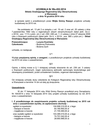 UCHWAŁA Nr Wa.452.2014 Składu Orzekającego Regionalnej Izby Obrachunkowej w Warszawie z dnia 16 grudnia 2014 roku w sprawie opinii o przedłożonym przez Wójta Gminy Raszyn projekcie uchwały budżetowej na 2015 rok. Na podstawie art. 13 pkt 3 w związku z art. 19 ust. 2 oraz art. 20 ustawy z dnia 7 października 1992 roku o regionalnych izbach obrachunkowych (tekst jedn. Dz.U. z 2012r., poz. 1113 z późn. zm.) i art. 238 i 246 ust. 1 i 2 ustawy z dnia 27 sierpnia 2009 roku o finansach publicznych (tekst jedn. Dz.U. z 2013r., poz. 885 z późn.zm.) - Skład Orzekający Regionalnej Izby Obrachunkowej w Warszawie: Przewodnicząca: Członkowie: - Lucyna Kusińska - Bożenna Piotrowska - Bożena Zych uchwala, co następuje: §1 Wydaje pozytywną opinię, z uwagami, o przedłożonym projekcie uchwały budżetowej na 2015 rok wraz z uzasadnieniem. §2 Opinia, o której mowa w § 1 niniejszej uchwały stosownie do art. 238 ust. 3 ustawy o finansach publicznych, organ wykonawczy jednostki samorządu terytorialnego jest obowiązany przedstawić, przed uchwaleniem budżetu, organowi stanowiącemu. §3 Od niniejszej uchwały służy odwołanie do Kolegium Regionalnej Izby Obrachunkowej w Warszawie w terminie 14 dni od daty jej doręczenia. Uzasadnienie W dni 17 listopada 2014 roku Wójt Gminy Raszyn przedłożył przy Zarządzeniu Nr 164/2014 z dnia 14 listopada 2014 roku projekt uchwały budżetowej na rok 2015 wraz z uzasadnieniem. I. Z przedłożonego do zaopiniowania projektu uchwały budżetowej na 2015 rok wraz z uzasadnieniem wynika, że zaplanowano dochody : ogółem w wysokości 104.906.310,00 zł, z tego: - bieżące w kwocie 83.160.850,00 zł - majątkowe w kwocie 21.745.460,00 zł oraz wydatki ogółem w wysokości 103.395.010,00 zł, z tego - bieżące w kwocie 74.701.042,00 zł - majątkowe w kwocie 28.693.968,00 zł. 1 Analiza i ocena przedłożonych materiałów wykazała ,że w zdecydowanej większości spełnione zostały wymogi dotyczące obowiązujących przepisów prawa. Niemniej Skład Orzekający zgłasza następujące uwagi do przedłożonego do zaopiniowania projektu uchwały budżetowej : 1. W dziale 010 ,, Rolnictwo i łowiectwo” zaplanowano dotację celową dla Starostwa Powiatowego w Pruszkowie na zadania bieżące realizowane na podstawie porozumień (umów) między jednostkami samorządu terytorialnego ( § 232 ) tj. na zadanie dot. odławiania zwierząt - w kwocie 4.440,00 zł. Skład Orzekający zauważa, że zgodnie z art. 45 ust.3 ustawy z dnia 13 października 1995 r. Prawo łowieckie ( t.j.Dz. U. z 2013 r. poz.1226 ze zm.) kompetencje starosty określone w w/w przepisie do wydawania decyzji o odłowie lub odstrzale redukcyjnym zwierzyny stanowią administrację z zakresu łowiectwa sprawowaną przez samorząd powiatowy, a więc tym samym są zadaniami z zakresu administracji rządowej. W tej sytuacji zadania Starosty Pruszkowskiego określone w art. 45 ust.3 ustawy Prawo łowieckie winny być finansowane z dotacji celowej z budżetu państwa zgodnie z art. 49 ustawy z dnia 13 listopada 2003 r. o dochodach jednostek samorządu terytorialnego nie zaś ze środków własnych Powiatu lub też z dotacji Gminy Raszyn ( wyrok WSA w Warszawie z 16 czerwca 2014 r. sygn. akt V SA/Wa 1133/14 ) 2. Skład Orzekający zgłasza również wątpliwości w związku z zaplanowaniem w Funduszu Sołeckim w kilku sołectwach przedsięwzięć pn. „Imprezy integracyjne”, „Wycieczki integracyjne”, ,,Piknik rodzinny’’, ,,Zakup biletów do teatru i kina’’, ,,Zakup materiałów na spotkania mieszkańców(zastawa stołowa)’’. W uzasadnieniu do projektu uchwały budżetowej nie wskazano jakiego zadania własnego gminy to dotyczy, czy zgodnie z ustawą z dnia 21 lutego 2014 roku o funduszu sołeckim (Dz.U. z 2014 r. poz. 301) zadanie to służy poprawie warunków życia mieszkańców i jest zgodne ze strategią rozwoju gminy. Skład Orzekający zauważa, że art.5 ust. 11 cyt. ustawy obliguje radę gminy, aby uchwalając budżet odrzuciła wniosek sołectwa , w przypadku gdy zamierzone przedsięwzięcia nie spełniają w/w wymogów. W przypadku zaplanowania tych przedsięwzięć w uchwale budżetowej na 2015 rok należy również zamieścić informację – jakiego zadania własnego gminy dotyczą te wydatki. 3. W § 2 punkcie 5. części normatywnej projektu proponuje się wskazać kwotę ustalonego limitu zobowiązań zaś w § 10 punkcie 2. dokonywanie zmian w planie wydatków na inwestycje i zakupy inwestycyjne należy ograniczyć do działu. II. W projekcie uchwały budżetowej na 2015 rok zaplanowano nadwyżkę w wysokości 1.511.300,00 zł, która zostanie przeznaczona na spłatę zaciągniętych zobowiązań z tytułu otrzymanych kredytów. Ponadto zaplanowane są w budżecie przychody w kwocie 4.500.000,00 zł. z tytułu emisji obligacji komunalnych , które również przeznacza się na spłatę wcześniej zaciągniętych zobowiązań. 2 W ocenie Składu Orzekającego Regionalnej Izby Obrachunkowej w Warszawie opiniowany projekt stanowi dokument kompletny , spójny i który po dokonaniu w/wskazanych korekt może być podstawą gospodarki finansowej jednostki w 2015 roku. Mając na względzie powyższe Skład Orzekający Obrachunkowej w Warszawie postanowił jak w sentencji uchwały. Regionalnej Izby 3
