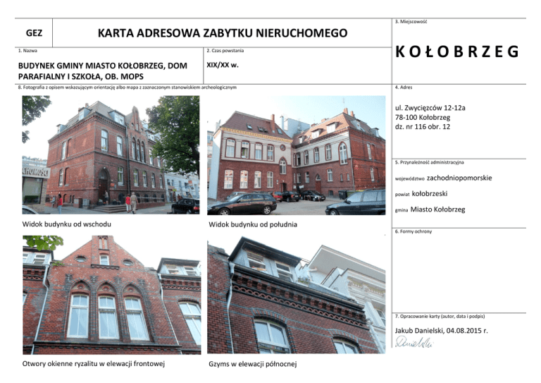 3. Miejscowośd GEZ KARTA ADRESOWA ZABYTKU NIERUCHOMEGO 1. Nazwa 2. Czas powstania BUDYNEK GMINY MIASTO KOŁOBRZEG, DOM PARAFIALNY I SZKOŁA, OB. MOPS XIX/XX w. 8. Fotografia z opisem wskazującym orientację albo mapa z zaznaczonym stanowiskiem archeologicznym KOŁOBRZEG 4. Adres ul. Zwycięzców 12-12a 78-100 Kołobrzeg dz. nr 116 obr. 12 5. Przynależnośd administracyjna województwo Widok budynku od wschodu zachodniopomorskie powiat kołobrzeski gmina Miasto Kołobrzeg Widok od budynku od południa 6. Formy ochrony 7. Opracowanie karty (autor, data i podpis) Jakub Danielski, 04.08.2015 r. Otwory okienne ryzalitu w elewacji frontowej Gzyms w elewacji północnej 9. Opis Budynek na wsch. kraocu zabudowy ulicznej pierzei, wysoko podpiwniczony, dwukondygnacyjny na rzucie prostokąta z płytkim pozornym ryzalitem zwieoczonym trójkątnym szczytem z nadwieszonym wykuszem, wzniesionym w formie prostokątnej sterczyny - na osi fasady. Dach mansardowy z lukarnami na wszystkich połaciach. Ściany murowane z cegły, w tylnej elewacji w 2 kondygnacji tynkowane, detal ceglany, jako element dekoracyjny wprowadzone pasy i detale z ciemniejszej cegły oraz tynkowane, linearne gzymsy. Fasada na parterze sześcioosiowa, na piętrze ryzalitu - trzy okna zamknięte łukiem odcinkowym, umieszczone w tynkowanych, ostrołucznych blendach, z ceglanym czteroliściem w środku. We wsch. części przyziemia ostrołuczny otwór drzwi wypełniony prostokątnymi drzwiami i ostrołucznym, szklonym nadświetlem. Okna zamknięte łukiem odcinkowym, ramowane wałkiem na krawędzi węgarów, zwieoczone łukami odciążającymi z ceglanych klioców (cegła dwubarwna) ujętymi w pasy ciemniejszej cegły obiegające budynek. Gzyms cokołowy wydatny, profilowany; gzyms kordonowy zdwojony: ceglany i tynkowany, podcięty gzymsem kostkowym; gzyms koronujący na schodkowych kroksztynach, poprzedzony fryzem z ceglanych okręgów. Między łukami okien ryzalitu - metalowe koocówki kotew (?) w formie lilii andegaweoskich. Z tyłu - dwukondygnacyjny budynek połączony z głównym za pomocą dwukondygnacyjnego łącznika. Murowany z cegły, w górnej kondygnacji tynkowany, nakryty mansardowym dachem; fasada pięcioosiowa: cztery osie okien zamkniętych odcinkiem łuku - zgrupowane w części płd., w części płn. - klatka schodowa z ostrołucznym oknem i tondem - na piętrach. 10. Wnioski konserwatorskie Budynki w dobrym technicznym i dobrym estetycznym, po remoncie: wymiana tynków, czyszczenie cegieł budynku 12 a i tylnej elewacji budynku głównego, wymiana stolarki okiennej na PCV z zachowaniem pierwotnych podziałów; w elewacji frontowej i bocznej budynku głównego liczne przebarwienia cegły, niestarannie wykooczone elewacje lukarn. Do zachowania: bryła budynku, układ i dekoracje elewacji, kształt i istniejące podziały okien. Części budynku i ujednolicenie kolorystyki elewacji. Remonty w uzgodnieniu z Konserwatorem Zabytków. 10. Lokalizacja