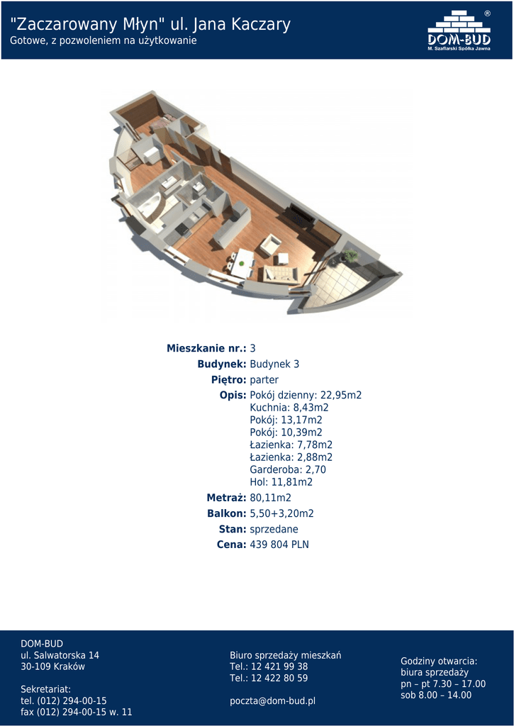 "Zaczarowany Młyn" ul. Jana Kaczary Gotowe, z pozwoleniem na użytkowanie Mieszkanie nr.: 3 Budynek: Budynek 3 Piętro: parter Opis: Pokój dzienny: 22,95m2 Kuchnia: 8,43m2 Pokój: 13,17m2 Pokój: 10,39m2 Łazienka: 7,78m2 Łazienka: 2,88m2 Garderoba: 2,70 Hol: 11,81m2 Metraż: 80,11m2 Balkon: 5,50+3,20m2 Stan: sprzedane Cena: 439 804 PLN DOM-BUD ul. Salwatorska 14 30-109 Kraków Sekretariat: tel. (012) 294-00-15 fax (012) 294-00-15 w. 11 Biuro sprzedaży mieszkań Tel.: 12 421 99 38 Tel.: 12 422 80 59 [email protected] Godziny otwarcia: biura sprzedaży pn – pt 7.30 – 17.00 sob 8.00 – 14.00