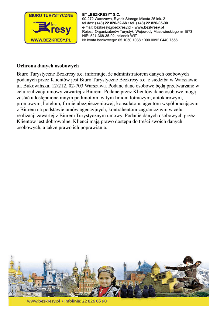 BT „BEZKRESY” S.C. 00-272 Warszawa, Rynek Starego Miasta 25 lok. 2 tel./fax: (+48) 22 826-52-68 • tel. (+48) 22 826-05-90 e-mail: [email protected] • www.bezkresy.pl Rejestr Organizatorów Turystyki Wojewody Mazowieckiego nr 1573 NIP: 521-368-35-92, członek WIT Nr konta bankowego: 65 1050 1038 1000 0092 0440 7556 Ochrona danych osobowych Biuro Turystyczne Bezkresy s.c. informuje, że administratorem danych osobowych podanych przez Klientów jest Biuro Turystyczne Bezkresy s.c. z siedzibą w Warszawie ul. Bukowińska, 12/212, 02-703 Warszawa. Podane dane osobowe będą przetwarzane w celu realizacji umowy zawartej z Biurem. Podane przez Klientów dane osobowe mogą zostać udostępnione innym podmiotom, w tym liniom lotniczym, autokarowym, promowym, hotelom, firmie ubezpieczeniowej, konsulatom, agentom współpracującym z Biurem na podstawie umów agencyjnych, kontrahentom zagranicznym w celu realizacji zawartej z Biurem Turystycznym umowy. Podanie danych osobowych przez Klientów jest dobrowolne. Klienci mają prawo dostępu do treści swoich danych osobowych, a także prawo ich poprawiania.