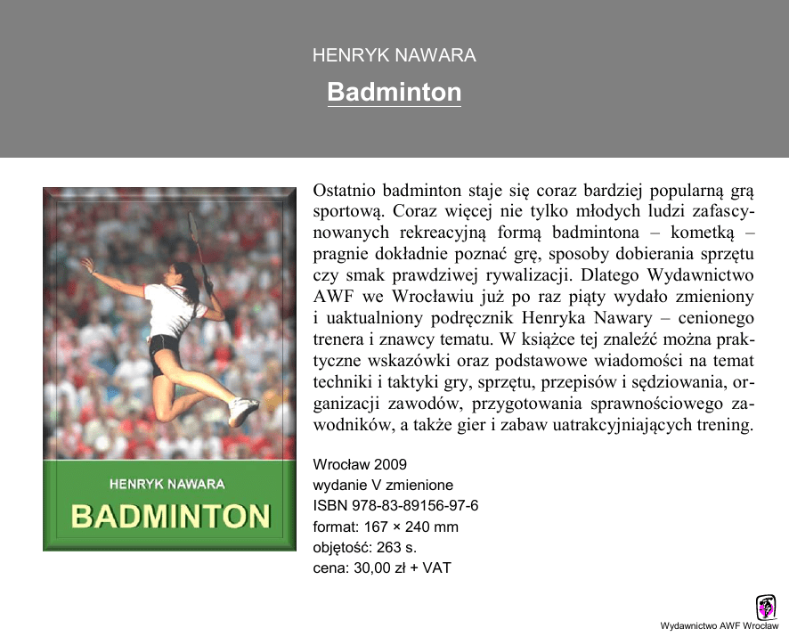 HENRYK NAWARA Badminton Ostatnio badminton staje się coraz bardziej popularną grą sportową. Coraz więcej nie tylko młodych ludzi zafascynowanych rekreacyjną formą badmintona – kometką – pragnie dokładnie poznać grę, sposoby dobierania sprzętu czy smak prawdziwej rywalizacji. Dlatego Wydawnictwo AWF we Wrocławiu już po raz piąty wydało zmieniony i uaktualniony podręcznik Henryka Nawary – cenionego trenera i znawcy tematu. W książce tej znaleźć można praktyczne wskazówki oraz podstawowe wiadomości na temat techniki i taktyki gry, sprzętu, przepisów i sędziowania, organizacji zawodów, przygotowania sprawnościowego zawodników, a także gier i zabaw uatrakcyjniających trening. Wrocław 2009 wydanie V zmienione ISBN 978-83-89156-97-6 format: 167 × 240 mm objętość: 263 s. cena: 30,00 zł + VAT Wydawnictwo AWF Wrocław