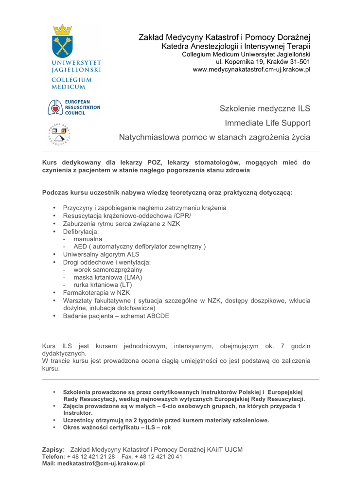 Zakład Medycyny Katastrof i Pomocy Doraźnej Katedra Anestezjologii i Intensywnej Terapii Collegium Medicum Uniwersytet Jagielloński ul. Kopernika 19, Kraków 31-501 www.medycynakatastrof.cm-uj.krakow.pl Szkolenie medyczne ILS Immediate Life Support Natychmiastowa pomoc w stanach zagrożenia życia Kurs dedykowany dla lekarzy POZ, lekarzy stomatologów, mogących mieć do czynienia z pacjentem w stanie nagłego pogorszenia stanu zdrowia Podczas kursu uczestnik nabywa wiedzę teoretyczną oraz praktyczną dotyczącą: • • • • • • • • • Przyczyny i zapobieganie nagłemu zatrzymaniu krążenia Resuscytacja krążeniowo-oddechowa /CPR/ Zaburzenia rytmu serca związane z NZK Defibrylacja: - manualna - AED ( automatyczny defibrylator zewnętrzny ) Uniwersalny algorytm ALS Drogi oddechowe i wentylacja: - worek samorozprężalny - maska krtaniowa (LMA) - rurka krtaniowa (LT) Farmakoterapia w NZK Warsztaty fakultatywne ( sytuacja szczególne w NZK, dostępy doszpikowe, wkłucia dożylne, intubacja dotchawicza) Badanie pacjenta – schemat ABCDE Kurs ILS jest kursem jednodniowym, intensywnym, obejmującym ok. 7 godzin dydaktycznych. W trakcie kursu jest prowadzona ocena ciągłą umiejętności co jest podstawą do zaliczenia kursu. • • • • Szkolenia prowadzone są przez certyfikowanych Instruktorów Polskiej i Europejskiej Rady Resuscytacji, według najnowszych wytycznych Europejskiej Rady Resuscytacji. Zajęcia prowadzone są w małych – 6-cio osobowych grupach, na których przypada 1 Instruktor. Uczestnicy otrzymują na 2 tygodnie przed kursem materiały szkoleniowe. Okres ważności certyfikatu – ILS – rok Zapisy: Zakład Medycyny Katastrof i Pomocy Doraźnej KAiIT UJCM Telefon: + 48 12 421 21 28 Fax. + 48 12 421 20 41 Mail: [email protected]