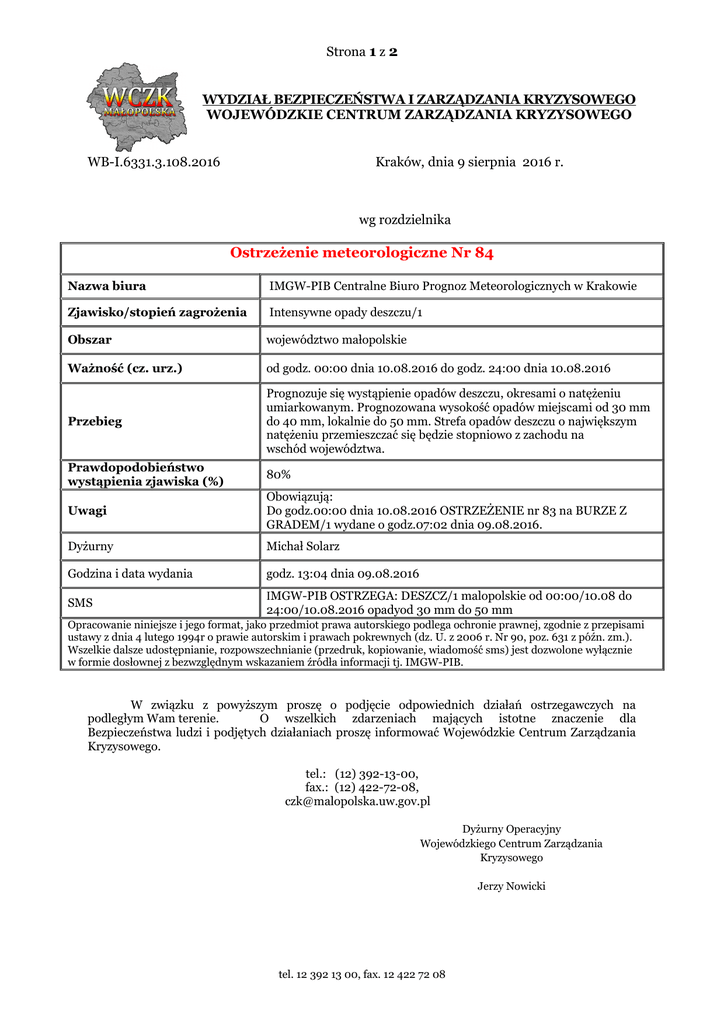Strona 1 z 2 WYDZIAŁ BEZPIECZEŃSTWA I ZARZĄDZANIA KRYZYSOWEGO WOJEWÓDZKIE CENTRUM ZARZĄDZANIA KRYZYSOWEGO WB-I.6331.3.108.2016 Kraków, dnia 9 sierpnia 2016 r. wg rozdzielnika Ostrzeżenie meteorologiczne Nr 84 Nazwa biura IMGW-PIB Centralne Biuro Prognoz Meteorologicznych w Krakowie Zjawisko/stopień zagrożenia Intensywne opady deszczu/1 Obszar województwo małopolskie Ważność (cz. urz.) od godz. 00:00 dnia 10.08.2016 do godz. 24:00 dnia 10.08.2016 Przebieg Prognozuje się wystąpienie opadów deszczu, okresami o natężeniu umiarkowanym. Prognozowana wysokość opadów miejscami od 30 mm do 40 mm, lokalnie do 50 mm. Strefa opadów deszczu o największym natężeniu przemieszczać się będzie stopniowo z zachodu na wschód województwa. Prawdopodobieństwo wystąpienia zjawiska (%) 80% Uwagi Obowiązują: Do godz.00:00 dnia 10.08.2016 OSTRZEŻENIE nr 83 na BURZE Z GRADEM/1 wydane o godz.07:02 dnia 09.08.2016. Dyżurny Michał Solarz Godzina i data wydania godz. 13:04 dnia 09.08.2016 SMS IMGW-PIB OSTRZEGA: DESZCZ/1 malopolskie od 00:00/10.08 do 24:00/10.08.2016 opadyod 30 mm do 50 mm Opracowanie niniejsze i jego format, jako przedmiot prawa autorskiego podlega ochronie prawnej, zgodnie z przepisami ustawy z dnia 4 lutego 1994r o prawie autorskim i prawach pokrewnych (dz. U. z 2006 r. Nr 90, poz. 631 z późn. zm.). Wszelkie dalsze udostępnianie, rozpowszechnianie (przedruk, kopiowanie, wiadomość sms) jest dozwolone wyłącznie w formie dosłownej z bezwzględnym wskazaniem źródła informacji tj. IMGW-PIB. W związku z powyższym proszę o podjęcie odpowiednich działań ostrzegawczych na podległym Wam terenie. O wszelkich zdarzeniach mających istotne znaczenie dla Bezpieczeństwa ludzi i podjętych działaniach proszę informować Wojewódzkie Centrum Zarządzania Kryzysowego. tel.: (12) 392-13-00, fax.: (12) 422-72-08, [email protected] Dyżurny Operacyjny Wojewódzkiego Centrum Zarządzania Kryzysowego Jerzy Nowicki tel. 12 392 13 00, fax. 12 422 72 08 Strona 2 z 2 Otrzymują: 1. Powiatowe (Miejskie) CZK 2. a/a Do wiadomości: 1. KW PSP 2. KW Policji 3. RZGW 4. MZMiUW 5. WSzW w Krakowie 6. KO SG Nowy Sącz 7. Dyspozytor PKP 8. Zakłady Energetyczne 9. GDDKiA 10. ZDW 11. WSSE Kraków 12. WINB Kraków 13. Urząd Żeglugi Śródlądowej w Krakowie 14. a/a tel. 12 392 13 00, fax. 12 422 72 08
