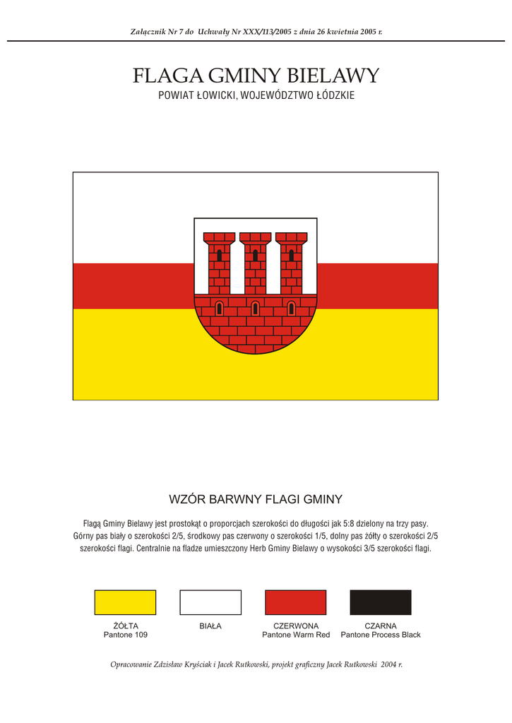 Za³¹cznik Nr 7 do Uchwa³y Nr XXX/113/2005 z dnia 26 kwietnia 2005 r. FLAGA GMINY BIELAWY POWIAT £OWICKI, WOJEWÓDZTWO £ÓDZKIE WZÓR BARWNY FLAGI GMINY Flag¹ Gminy Bielawy jest prostok¹t o proporcjach szerokoœci do d³ugoœci jak 5:8 dzielony na trzy pasy. Górny pas bia³y o szerokoœci 2/5, œrodkowy pas czerwony o szerokoœci 1/5, dolny pas ¿ó³ty o szerokoœci 2/5 szerokoœci flagi. Centralnie na fladze umieszczony Herb Gminy Bielawy o wysokoœci 3/5 szerokoœci flagi. ¯Ó£TA Pantone 109 BIA£A CZERWONA Pantone Warm Red CZARNA Pantone Process Black Za³¹cznik Nr 8 do Uchwa³y Nr XXX/113/2005 z dnia 26 kwietnia 2005 r. FLAGA GMINY BIELAWY POWIAT £OWICKI, WOJEWÓDZTWO £ÓDZKIE WZÓR CZARNO-BIA£Y FLAGI GMINY SZRAFOWANY Flag¹ Gminy Bielawy jest prostok¹t o proporcjach szerokoœci do d³ugoœci jak 5:8 dzielony na trzy pasy. Górny pas bia³y o szerokoœci 2/5, œrodkowy pas czerwony o szerokoœci 1/5, dolny pas ¿ó³ty o szerokoœci 2/5 szerokoœci flagi. Centralnie na fladze umieszczony Herb Gminy Bielawy o wysokoœci 3/5 szerokoœci flagi. ¯Ó£TA BIA£A CZERWONA CZARNA Za³¹cznik Nr 9 do Uchwa³y Nr XXX/113/2005 z dnia 26 kwietnia 2005 r. FLAGA GMINY BIELAWY POWIAT £OWICKI, WOJEWÓDZTWO £ÓDZKIE WZÓR RYSUNKOWY FLAGI GMINY Flag¹ Gminy Bielawy jest prostok¹t o proporcjach szerokoœci do d³ugoœci jak 5:8 dzielony na trzy pasy. Górny pas bia³y o szerokoœci 2/5, œrodkowy pas czerwony o szerokoœci 1/5, dolny pas ¿ó³ty o szerokoœci 2/5 szerokoœci flagi. Centralnie na fladze umieszczony Herb Gminy Bielawy o wysokoœci 3/5 szerokoœci flagi. Za³¹cznik Nr 10 do Uchwa³y Nr XXX/113/2005 z dnia 26 kwietnia 2005 r. FLAGA GMINY BIELAWY B A:B = 5:8 SPOSÓB WYKREŒLANIA FLAGI GMINY A 1/5 A 2/5 A 3/5 A 2/5 A POWIAT £OWICKI, WOJEWÓDZTWO £ÓDZKIE Za³¹cznik Nr 11 do Uchwa³y Nr XXX/113/2005 z dnia 26 kwietnia 2005 r. FLAGA GMINY BIELAWY POWIAT £OWICKI, WOJEWÓDZTWO £ÓDZKIE IDENTYFIKACJA BARW FLAGI GMINY BIA£A CZERWONA ¯Ó£TA CZARNA oznaczenie wg systemu PANTONE oznaczenie wg systemu ORACAL oznaczenie wg systemu CMYK vacat ORACAL white 641-010 Cyan Magenta Yellow Black PANTONE WARM RED ORACAL light red 641-032 Cyan 0% Magenta 100 % Yellow 100 % 0% Black PANTONE 109 ORACAL yellow 641-021 Cyan 0% Magenta 9 % 94 % Yellow 0% Black PANTONE Process Black ORACAL black 641-070 Cyan 0% Magenta 0 % 0% Yellow 100 % Black 0% 0% 0% 0% kod graficzny barw wzorce barw