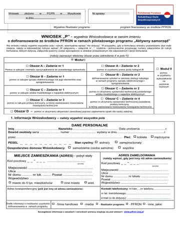 Wniosek złożono w PCPR w Nr sprawy: Myszkowie w dniu ............................ Wypełnia Realizator programu program finansowany ze środków PFRON WNIOSEK „P” - wypełnia Wnioskodawca w swoim imieniu o dofinansowanie ze środków PFRON w ramach pilotażowego programu „Aktywny samorząd” We wniosku należy wypełnić wszystkie pola i rubryki, ewentualnie wpisać ”nie dotyczy”. W przypadku, gdy w formularzu wniosku przewidziano zbyt mało miejsca, należy w odpowiedniej rubryce wpisać „W załączeniu – załącznik nr ..”, czytelnie i jednoznacznie przypisując numery załączników do rubryk formularza, których dotyczą. Załączniki powinny zostać sporządzone w układzie przewidzianym dla odpowiednich rubryk formularza. (należy zaznaczyć właściwy obszar przez zakreślenie X w polu □) □ Moduł I □ Obszar A – Zadanie nr 1 □ Obszar A – Zadanie nr 2 Pomoc w zakupie i montażu oprzyrządowania do posiadanego samochodu pomoc w uzyskaniu prawa jazdy kategorii B □ □ Obszar B – Zadanie nr 1 □ Obszar C – Zadanie nr 2 □ Obszar C – Zadanie nr 1 pomoc w utrzymaniu sprawności technicznej posiadanego wózka inwalidzkiego o napędzie elektrycznym pomoc w zakupie wózka inwalidzkiego o napędzie elektrycznym □ □ Obszar C – Zadanie nr 3 Obszar C – Zadanie nr 4 pomoc w utrzymaniu sprawności technicznej posiadanej protezy kończyny, w której zastosowano nowoczesne rozwiązania techniczne pomoc w zakupie protezy kończyny, w której zastosowano nowoczesne rozwiązania techniczne – pomoc w uzyskaniu wykształcenia na poziomie wyższym Obszar B – Zadanie nr 2 dofinansowanie szkoleń w zakresie obsługi nabytego w ramach programu sprzętu elektronicznego i oprogramowania pomoc w zakupie sprzętu elektronicznego lub jego elementów oraz oprogramowania □ Obszar D □ Moduł II pomoc w utrzymaniu aktywności zawodowej poprzez zapewnienie opieki dla osoby zależnej 1. Informacje Wnioskodawcy – należy wypełnić wszystkie pola DANE PERSONALNE Imię.....................................................Nazwisko....................................................... Data urodzenia ..............................r. Dowód osobisty seria ........................ numer ............................... wydany w dniu.........................................................r. przez................................................................................................................................ Płeć: _ _ _ _ _ _ _ _ _ _ _ Gospodarstwo domowe Wnioskodawcy: □ PESEL Stan cywilny: _ _ - _ _ _ ...................................... (poczta) Miejscowość ...................................................................... Ulica .................................................................................. Nr domu ........... nr lok. ......... Powiat ................................ Województwo .................................................................... □ miasto do 5 tys. mieszkańców wolna/y samodzielne (osoba samotna) MIEJSCE ZAMIESZKANIA (ADRES) - pobyt stały Kod pocztowy □ □ inne miasto Adres korespondencyjny (jeśli jest inny od adresu zamieszkania): □ wieś □ □ kobieta □ mężczyzna zamężna/żonaty □ wspólne ADRES ZAMELDOWANIA (należy wpisać, gdy jest inny niż adres zamieszkania) Kod pocztowy _ _ - _ _ _................................... (poczta) Miejscowość ........................................................... Ulica ........................................................................ Nr domu ................. nr lokalu ................................ Powiat ..................................................................... Województwo ........................................................ Kontakt telefoniczny: nr kier.....nr telefonu...................... nr tel. komórkowego:.......................................................... e’mail (o ile dotyczy): ......................................................... Źródło informacji o możliwości uzyskania dofinansowania w ramach programu □ - firma handlowa □ - media □ - Realizator programu □ - PFRON □ - inne, jakie: Szczegółowe informacje o zasadach i warunkach pomocy znajdują się pod adresem: www.pfron.org.pl STRONA 2 STAN PRAWNY DOT. NIEPEŁNOSPRAWNOŚCI □ całkowita niezdolność do pracy i do samodzielnej egzystencji lub całkowita niezdolność do samodzielnej egzystencji □ całkowita niezdolność do pracy □ częściowa niezdolność do pracy Orzeczenie dot. niepełnosprawności ważne jest: □ znaczny stopień □ I grupa inwalidzka □ umiarkowany stopień □ lekki stopień □ II grupa inwalidzka □ III grupa inwalidzka □ okresowo do dnia: .............................................. □ bezterminowo RODZAJ NIEPEŁNOSPRAWNOŚCI □ NARZĄD RUCHU 05-R, w zakresie: □ obu kończyn dolnych □ obu kończyn górnych □ jednej kończyny dolnej Wnioskodawca nie porusza się przy pomocy wózka inwalidzkiego: Wnioskodawca porusza się samodzielnie przy pomocy wózka inwalidzkiego: Wnioskodawca porusza się niesamodzielnie przy pomocy wózka inwalidzkiego: □ □ □ □ jednej kończyny górnej □ innym □ NARZĄD WZROKU 04-O Lewe oko: Prawe oko: Ostrość wzoru (w korekcji):........................... Ostrość wzoru (w korekcji):........................... □ osoba niewidoma Zwężenie pola widzenia: ................... stopni Zwężenie pola widzenia: .................... stopni □ osoba głuchoniewidoma □ INNE PRZYCZYNY niepełnosprawności wynikające z orzeczenia (proszę zaznaczyć właściwy kod/symbol ): □ 01-U upośledzenie □ 03-L zaburzenia głosu, □ 07-S choroby □ 09-M choroby □ 11-I inne umysłowe □ 02-P choroby psychiczne mowy i choroby słuchu □ - OSOBA GŁUCHA □ 06-E epilepsja układu oddechowego i krążenia układu moczowo płciowego □ 08-T choroby □ 10-N układu pokarmowego choroby neurologiczne □ 12-C całościowe zaburzenia rozwojowe AKTYWNO
