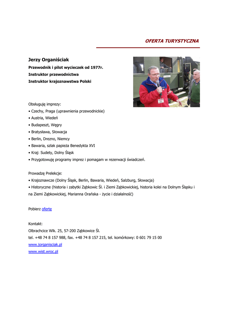 OFERTA TURYSTYCZNA Jerzy Organiściak Przewodnik i pilot wycieczek od 1977r. Instruktor przewodnictwa Instruktor krajoznawstwa Polski Obsługuję imprezy: • Czechy, Praga (uprawnienia przewodnickie) • Austria, Wiedeń • Budapeszt, Węgry • Bratysława, Słowacja • Berlin, Drezno, Niemcy • Bawaria, szlak papieża Benedykta XVI • Kraj: Sudety, Dolny Śląsk • Przygotowuję programy imprez i pomagam w rezerwacji świadczeń. Prowadzę Prelekcje: • Krajoznawcze (Dolny Śląsk, Berlin, Bawaria, Wiedeń, Salzburg, Słowacja) • Historyczne (historia i zabytki Ząbkowic Śl. i Ziemi Ząbkowickiej, historia kolei na Dolnym Śląsku i na Ziemi Ząbkowickiej, Marianna Orańska - życie i działalność) Pobierz ofertę Kontakt: Olbrachcice Wlk. 25, 57-200 Ząbkowice Śl. tel. +48 74 8 157 988, fax. +48 74 8 157 215, tel. komórkowy: 0 601 79 15 00 www.jorganisciak.pl www.wist.wroc.pl