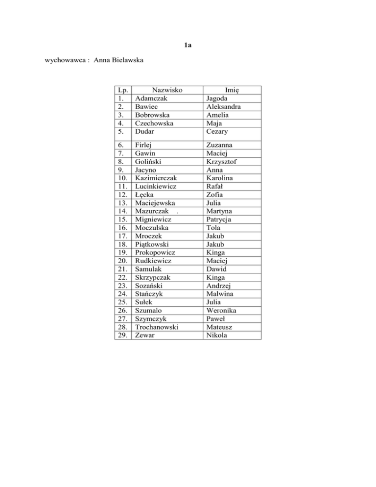 1a wychowawca : Anna Bielawska Lp. Nazwisko Imię 1. Adamczak