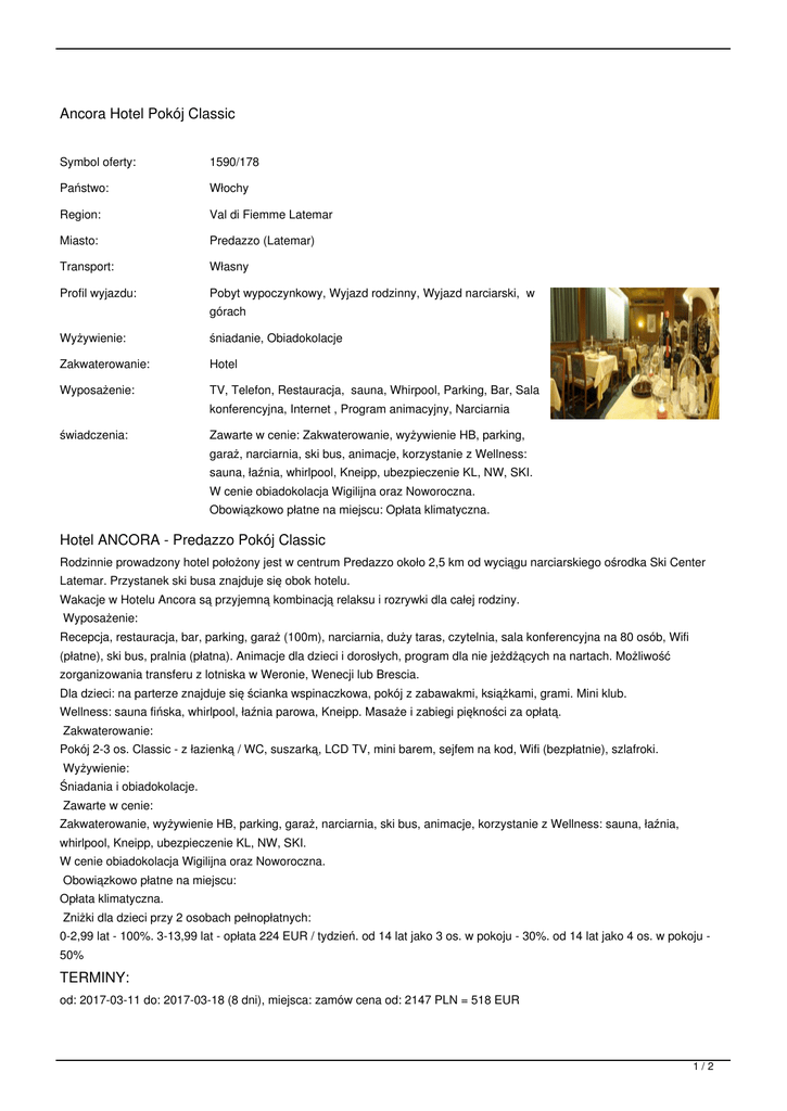 Ancora Hotel Pokój Classic Symbol oferty: 1590/178 Państwo: Włochy Region: Val di Fiemme Latemar Miasto: Predazzo (Latemar) Transport: Własny Profil wyjazdu: Pobyt wypoczynkowy, Wyjazd rodzinny, Wyjazd narciarski, w Wyżywienie: śniadanie, Obiadokolacje Zakwaterowanie: Hotel Wyposażenie: TV, Telefon, Restauracja, sauna, Whirpool, Parking, Bar, Sala świadczenia: Zawarte w cenie: Zakwaterowanie, wyżywienie HB, parking, górach konferencyjna, Internet , Program animacyjny, Narciarnia garaż, narciarnia, ski bus, animacje, korzystanie z Wellness: sauna, łaźnia, whirlpool, Kneipp, ubezpieczenie KL, NW, SKI. W cenie obiadokolacja Wigilijna oraz Noworoczna. Obowiązkowo płatne na miejscu: Opłata klimatyczna. Hotel ANCORA - Predazzo Pokój Classic Rodzinnie prowadzony hotel położony jest w centrum Predazzo około 2,5 km od wyciągu narciarskiego ośrodka Ski Center Latemar. Przystanek ski busa znajduje się obok hotelu. Wakacje w Hotelu Ancora są przyjemną kombinacją relaksu i rozrywki dla całej rodziny. Wyposażenie: Recepcja, restauracja, bar, parking, garaż (100m), narciarnia, duży taras, czytelnia, sala konferencyjna na 80 osób, Wifi (płatne), ski bus, pralnia (płatna). Animacje dla dzieci i dorosłych, program dla nie jeżdżących na nartach. Możliwość zorganizowania transferu z lotniska w Weronie, Wenecji lub Brescia. Dla dzieci: na parterze znajduje się ścianka wspinaczkowa, pokój z zabawakmi, książkami, grami. Mini klub. Wellness: sauna fińska, whirlpool, łaźnia parowa, Kneipp. Masaże i zabiegi piękności za opłatą. Zakwaterowanie: Pokój 2-3 os. Classic - z łazienką / WC, suszarką, LCD TV, mini barem, sejfem na kod, Wifi (bezpłatnie), szlafroki. Wyżywienie: Śniadania i obiadokolacje. Zawarte w cenie: Zakwaterowanie, wyżywienie HB, parking, garaż, narciarnia, ski bus, animacje, korzystanie z Wellness: sauna, łaźnia, whirlpool, Kneipp, ubezpieczenie KL, NW, SKI. W cenie obiadokolacja Wigilijna oraz Noworoczna. Obowiązkowo płatne na miejscu: Opłata klimatyczna. Zniżki dla dzieci przy 2 osobach pełnopłatnych: 0-2,99 lat - 100%. 3-13,99 lat - opłata 224 EUR / tydzień. od 14 lat jako 3 os. w pokoju - 30%. od 14 lat jako 4 os. w pokoju 50% TERMINY: od: 2017-03-11 do: 2017-03-18 (8 dni), miejsca: zamów cena od: 2147 PLN = 518 EUR 1/2 od: 2017-03-18 do: 2017-03-25 (8 dni), miejsca: zamów cena od: 2147 PLN = 518 EUR CENNIK: Długość pobytu: 8 dni 8 dni Grupa cenowa: M L 14 14 2.5 2.5 Ubezpieczenie (obligatoryjne) (*) Ubezpieczenie KL, NW, SKI (*) Turystyczny Fundusz Gwarancyjny Pobyt w obiekcie (do wyboru) (*) Pokój Classic standardowo dla osób: 3 minimalnie: 2 (-) Rodzaj osoby (do wyboru) Dziecko 0-2 Dziecko 3-13 3 osoba na dostawce (*) Osoba dorosła (-) (-) (-) 224 224 353 353 504 504 Waluta: EUR Aktualne ceny z systemu S.A.R.T. (-) - cena usługi, podatku kalkulowana przy osobie lub gratis (*) - kwota wliczona w cenę standardową 2/2