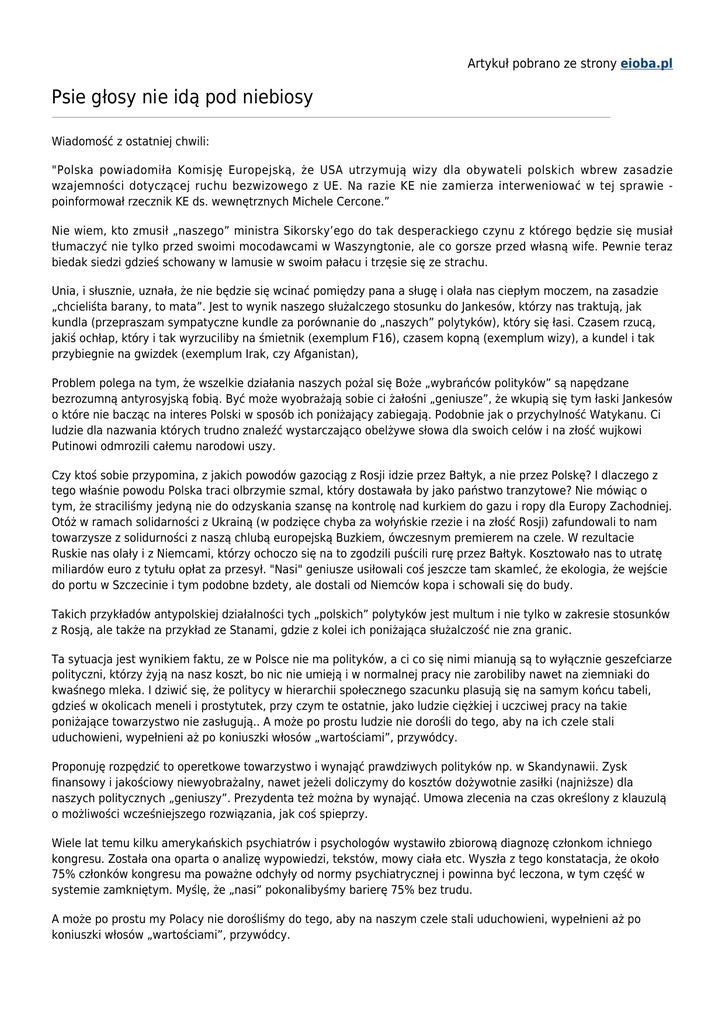 Artykuł pobrano ze strony eioba.pl Psie głosy nie idą pod niebiosy Wiadomość z ostatniej chwili: "Polska powiadomiła Komisję Europejską, że USA utrzymują wizy dla obywateli polskich wbrew zasadzie wzajemności dotyczącej ruchu bezwizowego z UE. Na razie KE nie zamierza interweniować w tej sprawie poinformował rzecznik KE ds. wewnętrznych Michele Cercone.” Nie wiem, kto zmusił „naszego” ministra Sikorsky’ego do tak desperackiego czynu z którego będzie się musiał tłumaczyć nie tylko przed swoimi mocodawcami w Waszyngtonie, ale co gorsze przed własną wife. Pewnie teraz biedak siedzi gdzieś schowany w lamusie w swoim pałacu i trzęsie się ze strachu. Unia, i słusznie, uznała, że nie będzie się wcinać pomiędzy pana a sługę i olała nas ciepłym moczem, na zasadzie „chcieliśta barany, to mata”. Jest to wynik naszego służalczego stosunku do Jankesów, którzy nas traktują, jak kundla (przepraszam sympatyczne kundle za porównanie do „naszych” polytyków), który się łasi. Czasem rzucą, jakiś ochłap, który i tak wyrzuciliby na śmietnik (exemplum F16), czasem kopną (exemplum wizy), a kundel i tak przybiegnie na gwizdek (exemplum Irak, czy Afganistan), Problem polega na tym, że wszelkie działania naszych pożal się Boże „wybrańców polityków” są napędzane bezrozumną antyrosyjską fobią. Być może wyobrażają sobie ci żałośni „geniusze”, że wkupią się tym łaski Jankesów o które nie bacząc na interes Polski w sposób ich poniżający zabiegają. Podobnie jak o przychylność Watykanu. Ci ludzie dla nazwania których trudno znaleźć wystarczająco obelżywe słowa dla swoich celów i na złość wujkowi Putinowi odmrozili całemu narodowi uszy. Czy ktoś sobie przypomina, z jakich powodów gazociąg z Rosji idzie przez Bałtyk, a nie przez Polskę? I dlaczego z tego właśnie powodu Polska traci olbrzymie szmal, który dostawała by jako państwo tranzytowe? Nie mówiąc o tym, że straciliśmy jedyną nie do odzyskania szansę na kontrolę nad kurkiem do gazu i ropy dla Europy Zachodniej. Otóż w ramach solidarności z Ukrainą (w podzięce chyba za wołyńskie rzezie i na złość Rosji) zafundowali to nam towarzysze z solidurności z naszą chlubą europejską Buzkiem, ówczesnym premierem na czele. W rezultacie Ruskie nas olały i z Niemcami, którzy ochoczo się na to zgodzili puścili rurę przez Bałtyk. Kosztowało nas to utratę miliardów euro z tytułu opłat za przesył. "Nasi" geniusze usiłowali coś jeszcze tam skamleć, że ekologia, że wejście do portu w Szczecinie i tym podobne bzdety, ale dostali od Niemców kopa i schowali się do budy. Takich przykładów antypolskiej działalności tych „polskich” polytyków jest multum i nie tylko w zakresie stosunków z Rosją, ale także na przykład ze Stanami, gdzie z kolei ich poniżająca służalczość nie zna granic. Ta sytuacja jest wynikiem faktu, ze w Polsce nie ma polityków, a ci co się nimi mianują są to wyłącznie geszefciarze polityczni, którzy żyją na nasz koszt, bo nic nie umieją i w normalnej pracy nie zarobiliby nawet na ziemniaki do kwaśnego mleka. I dziwić się, że politycy w hierarchii społecznego szacunku plasują się na samym końcu tabeli, gdzieś w okolicach meneli i prostytutek, przy czym te ostatnie, jako ludzie ciężkiej i uczciwej pracy na takie poniżające towarzystwo nie zasługują.. A może po prostu ludzie nie dorośli do tego, aby na ich czele stali uduchowieni, wypełnieni aż po koniuszki włosów „wartościami”, przywódcy. Proponuję rozpędzić to operetkowe towarzystwo i wynająć prawdziwych polityków np. w Skandynawii. Zysk finansowy i jakościowy niewyobrażalny, nawet jeżeli doliczymy do kosztów dożywotnie zasiłki (najniższe) dla naszych politycznych „geniuszy”. Prezydenta też można by wynająć. Umowa zlecenia na czas określony z klauzulą o możliwości wcześniejszego rozwiązania, jak coś spieprzy. Wiele lat temu kilku amerykańskich psychiatrów i psychologów wystawiło zbiorową diagnozę członkom ichniego kongresu. Została ona oparta o analizę wypowiedzi, tekstów, mowy ciała etc. Wyszła z tego konstatacja, że około 75% członków kongresu ma poważne odchyły od normy psychiatrycznej i powinna być leczona, w tym część w systemie zamkniętym. Myślę, że „nasi” pokonalibyśmy barierę 75% bez trudu. A może po prostu my Polacy nie dorośliśmy do tego, aby na naszym czele stali uduchowieni, wypełnieni aż po koniuszki włosów „wartościami”, przywódcy. I jeszcze dwa cytaty być może niesprawiedliwe, ale pokazujące jak nas widzą inni. Współczesnych nie przytaczam, ponieważ nie podejrzewam, żeby taki na przykład taki Obama (nie mówiąc o jego poprzedniku Bushu) wiedział gdzie leży Polska, z która kojarzą mu się tylko obozy koncentracyjne dla Żydów. "Naród zapalny i niepraktyczny, szlachetny, żywy, i lekkomyślny, naród który czuje wstręt do wytężonej i długotrwałej pracy i zawsze miał pociąg do wszelkich silnych i subtelnych rozkoszy, tak zmysłowych, jak duchowych, ale który przede wszystkim kochał niepodległość do szaleństwa, wolność do liberum veto(...). Polacy są żywego temperamentu, jak południowcy, ale na próżno szukałbyś u nich tego politycznego machiawelizmu, jakim celują mądrzy Włosi, którzy pozwolili w swoim czasie Francji wyciągać dla siebie kasztany z ognia. Jest to naród, który w Legionach Napoleona setki razy krew przelewał za cudze interesy, bo trzymano przed nim sztandar z białym orłem. Tego rodzaju młodociany, a nawet dziecinny entuzjazm nie jest z pewnością dodatnia cecha w wielkiej walce o byt, która się obecnie toczy pomiędzy ludami w obecnych czasach wielkiego przemysłu i militaryzmu. “ Georg Brandes (Morris Cohen) duński pisarz, krytyk i historyk literatury. Autor ksiązki "Polska". przebywał w zaborach rosyjskim i austriackim w latach 1885, 1886, 1894 