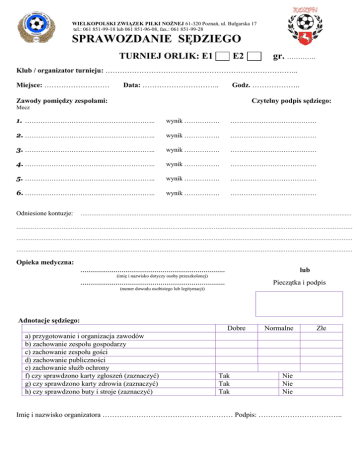 WIELKOPOLSKI ZWIĄZEK PIŁKI NOŻNEJ 61-320 Poznań, ul. Bułgarska 17 tel.: 061 851-99-18 lub 061 851-96-08, fax.: 061 851-99-28 SPRAWOZDANIE SĘDZIEGO TURNIEJ ORLIK: E1 E2 gr. …………. Klub / organizator turnieju: …………………………………………………………………….. Miejsce: ……………………… Data: ………………………….. Godz. ……………….. Zawody pomiędzy zespołami: Czytelny podpis sędziego: Mecz 1. ………………………………………………….. wynik ……………. ………………………………… 2. ………………………………………………….. wynik ……………. ………………………………… 3. ………………………………………………….. wynik ……………. ………………………………… 4. ………………………………………………….. wynik ……………. ………………………………… 5. ………………………………………………….. wynik ……………. ………………………………… 6. ………………………………………………….. wynik ……………. ………………………………… Odniesione kontuzje: ………………………………………………………………………………….……………………………………………..… ………………………………………………………………………………….……………………………………………..………………………………… ………………………………………………………………………………….……………………………………………..………………………………… ………………………………………………………………………………….……………………………………………..………………………………… Opieka medyczna: ……………………………………………………………….. lub (imię i nazwisko dotyczy osoby przeszkolonej) ……………………………………………………………….. Pieczątka i podpis (numer dowodu osobistego lub legitymacji) Adnotacje sędziego: Dobre a) przygotowanie i organizacja zawodów b) zachowanie zespołu gospodarzy c) zachowanie zespołu gości d) zachowanie publiczności e) zachowanie służb ochrony f) czy sprawdzono karty zgłoszeń (zaznaczyć) g) czy sprawdzono karty zdrowia (zaznaczyć) h) czy sprawdzono buty i stroje (zaznaczyć) Tak Tak Tak Normalne Złe Nie Nie Nie Imię i nazwisko organizatora ……………………………………………… Podpis: ……………………………..