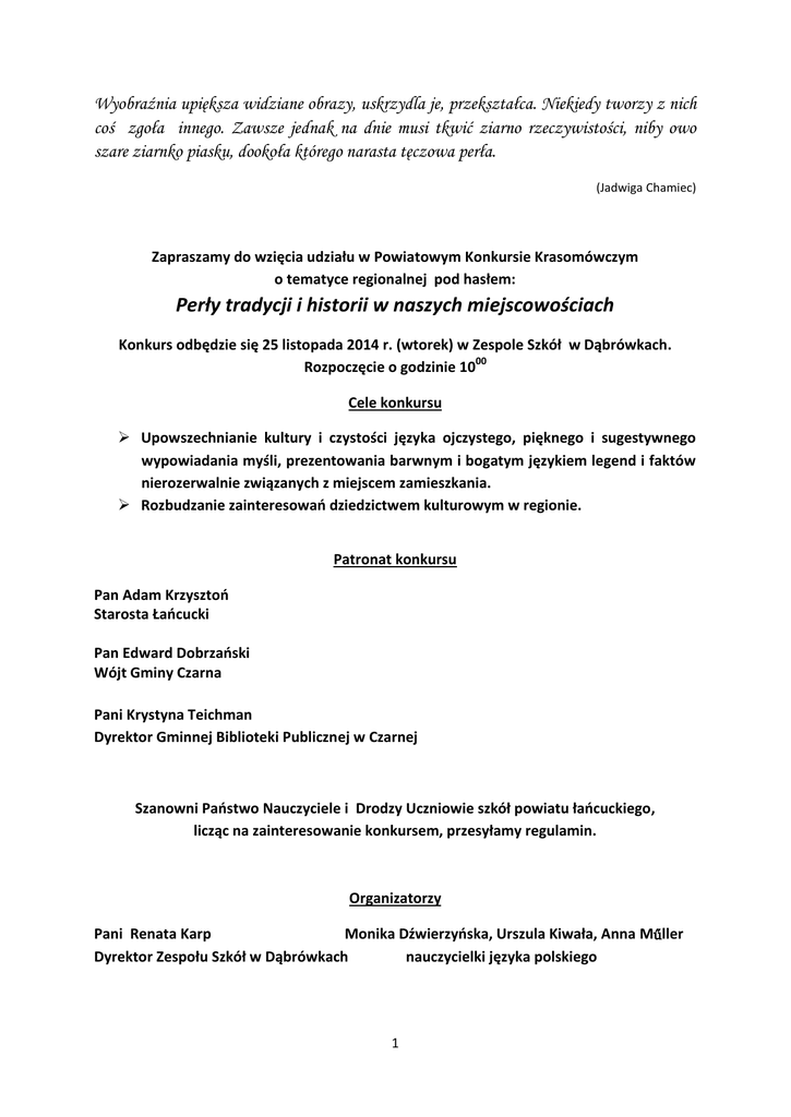 Wyobraźnia upiększa widziane obrazy, uskrzydla je, przekształca. Niekiedy tworzy z nich coś zgoła innego. Zawsze jednak na dnie musi tkwić ziarno rzeczywistości, niby owo szare ziarnko piasku, dookoła którego narasta tęczowa perła. (Jadwiga Chamiec) Zapraszamy do wzięcia udziału w Powiatowym Konkursie Krasomówczym o tematyce regionalnej pod hasłem: Perły tradycji i historii w naszych miejscowościach Konkurs odbędzie się 25 listopada 2014 r. (wtorek) w Zespole Szkół w Dąbrówkach. Rozpoczęcie o godzinie 1000 Cele konkursu Upowszechnianie kultury i czystości języka ojczystego, pięknego i sugestywnego wypowiadania myśli, prezentowania barwnym i bogatym językiem legend i faktów nierozerwalnie związanych z miejscem zamieszkania. Rozbudzanie zainteresowań dziedzictwem kulturowym w regionie. Patronat konkursu Pan Adam Krzysztoń Starosta Łańcucki Pan Edward Dobrzański Wójt Gminy Czarna Pani Krystyna Teichman Dyrektor Gminnej Biblioteki Publicznej w Czarnej Szanowni Państwo Nauczyciele i Drodzy Uczniowie szkół powiatu łańcuckiego, licząc na zainteresowanie konkursem, przesyłamy regulamin. Organizatorzy Pani Renata Karp Monika Dźwierzyńska, Urszula Kiwała, Anna Műller Dyrektor Zespołu Szkół w Dąbrówkach nauczycielki języka polskiego 1 Jesień swoim wdziękiem Też czarować może W swej pięknej sukience W jesiennym kolorze. Regulamin Powiatowego Konkursu Krasomówczego o tematyce regionalnej pod hasłem: Perły tradycji i historii w naszych miejscowościach I. W konkursie mogą brać udział uczniowie szkół podstawowych i gimnazjalnych z terenu powiatu łańcuckiego (jeden reprezentant szkoły podstawowej i jeden reprezentant gimnazjum z poszczególnych szkół). II. Konkurs będzie zorganizowany w dwóch kategoriach wiekowych: 1) dla uczniów szkół podstawowych, 2) dla uczniów gimnazjów. III. 1) Pierwsza kategoria wiekowa (szkoła podstawowa): każdy uczestnik konkursu przygotowuje występ krasomówczy na temat: Pory roku. Jesień. Tradycje i zwyczaje mojej rodziny związane z tą porą roku; czas występu 3 – 5 minut. 2) Druga kategoria wiekowa (gimnazjum): każdy uczestnik konkursu przygotowuje występ krasomówczy na temat: Pory roku. Jesień. Tradycje i zwyczaje mojej miejscowości związane z tą porą roku; czas występu 5 - 7 minut. IV. Kryteria oceny: 1) realizacja tematu ( 0 – 5 pkt.) 2) kultura słowa (0 – 5 pkt.) 3) bogactwo języka i umiejętność wyrażania myśli (0 – 5 pkt.) 4) rozumienie tematu i ogólny wyraz artystyczny (0 – 5 pkt.) Do uzyskania maksymalnie 20 pkt. V. Kolejność prezentacji będzie ustalona alfabetycznie. Krasomówca zapowiada swój występ (imię i nazwisko, szkoła, temat). Nagłośnienie zapewniają organizatorzy w zależności od potrzeb. VI. Uczestnicy będą oceniani w dwóch kategoriach wiekowych. VII. Są przewidziane nagrody, wyróżnienia oraz pamiątkowe dyplomy. 2 VIII. Opiekunowie uczniów biorących udział w konkursie i członkowie jury otrzymają od organizatorów pisemne podziękowania. IX. Zgłoszenia udziału w konkursie będą przyjmowane do 8 listopada 2014 r. Prosimy je przesyłać na adresy e – mail: [email protected] na formularzu zgłoszeniowym dołączonym do regulaminu. X. Regulamin konkursu oraz formularz zgłoszeniowy dostępne są na stronie internetowej szkoły, adres: www.zsdabrowki.pl XI. Informacje dotyczące organizacji i przebiegu konkursu można uzyskać również w sekretariacie szkoły od poniedziałku do piątku podczas długiej przerwy (1035 – 1050). XII. Akceptacja regulaminu jest równoznaczna z wyrażeniem zgody na publikacje wizerunku i przetwarzanie danych osobowych na potrzeby konkursu. 3
