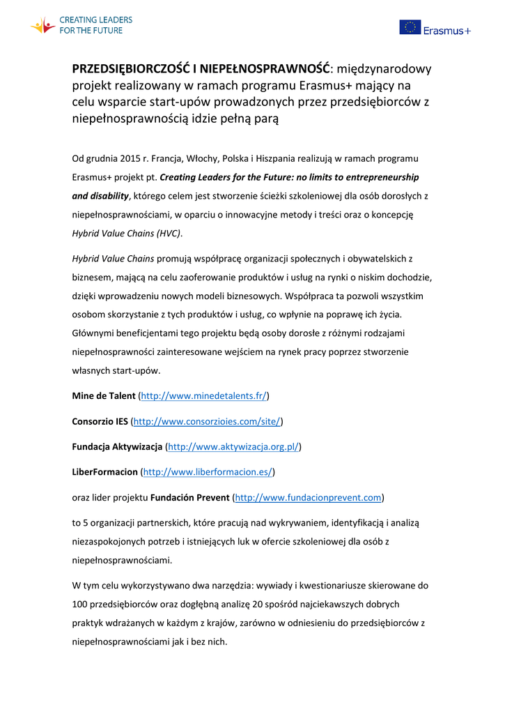 PRZEDSIĘBIORCZOŚĆ I NIEPEŁNOSPRAWNOŚĆ: międzynarodowy projekt realizowany w ramach programu Erasmus+ mający na celu wsparcie start-upów prowadzonych przez przedsiębiorców z niepełnosprawnością idzie pełną parą Od grudnia 2015 r. Francja, Włochy, Polska i Hiszpania realizują w ramach programu Erasmus+ projekt pt. Creating Leaders for the Future: no limits to entrepreneurship and disability, którego celem jest stworzenie ścieżki szkoleniowej dla osób dorosłych z niepełnosprawnościami, w oparciu o innowacyjne metody i treści oraz o koncepcję Hybrid Value Chains (HVC). Hybrid Value Chains promują współpracę organizacji społecznych i obywatelskich z biznesem, mającą na celu zaoferowanie produktów i usług na rynki o niskim dochodzie, dzięki wprowadzeniu nowych modeli biznesowych. Współpraca ta pozwoli wszystkim osobom skorzystanie z tych produktów i usług, co wpłynie na poprawę ich życia. Głównymi beneficjentami tego projektu będą osoby dorosłe z różnymi rodzajami niepełnosprawności zainteresowane wejściem na rynek pracy poprzez stworzenie własnych start-upów. Mine de Talent (http://www.minedetalents.fr/) Consorzio IES (http://www.consorzioies.com/site/) Fundacja Aktywizacja (http://www.aktywizacja.org.pl/) LiberFormacion (http://www.liberformacion.es/) oraz lider projektu Fundación Prevent (http://www.fundacionprevent.com) to 5 organizacji partnerskich, które pracują nad wykrywaniem, identyfikacją i analizą niezaspokojonych potrzeb i istniejących luk w ofercie szkoleniowej dla osób z niepełnosprawnościami. W tym celu wykorzystywano dwa narzędzia: wywiady i kwestionariusze skierowane do 100 przedsiębiorców oraz dogłębną analizę 20 spośród najciekawszych dobrych praktyk wdrażanych w każdym z krajów, zarówno w odniesieniu do przedsiębiorców z niepełnosprawnościami jak i bez nich. Podczas spotkań w Madrycie (Hiszpania) i w miejscowości Padua (Włochy) partnerzy odwiedzili również organizacje działające w obszarze niepełnosprawności - ILUNION w Hiszpanii (http://www.ilunion.com/en) oraz Anffas Mestre Onlus (http://anffasmestreonlus.org/) we Włoszech, co miało na celu przyjrzenie się z bliska ich innowacyjnym działaniom wpierającym osoby z różnymi niepełnosprawnościami. Wśród najważniejszych efektów dotychczasowych działań warto zauważyć, że większość przedsiębiorców, z którymi przeprowadzono wywiady reprezentuje przedział wiekowy 30-40 lat. 47% badanych uważa, że istotne jest, aby móc liczyć na opiekuna eksperta podczas rozwijania biznesu nie tylko na początku tej przygody. Ponadto, poziom satysfakcji wszystkich osób przeszkolonych w zakresie przedsiębiorczości wynosi 8 przy 10-cio stopniowej skali. Na stronie projektu (http://leadersforthefuture.eu/) każda zainteresowana osoba znajdzie wzór kwestionariusza, który otrzymali przedsiębiorcy oraz organizacje w każdym z krajów. Wkrótce opublikowane zostaną informacje na temat wyników analizy dobrych praktyk. Jeśli jesteś zainteresowany śledzeniem informacji na temat naszego projektu, oto narzędzia mediów społecznościowych, dzięki którym możesz to robić. http://leadersforthefuture.eu/ https://www.facebook.com/CreatingLeadersfortheFuture/?fref=ts @CLeadersFF Do zobaczenia wkrótce!