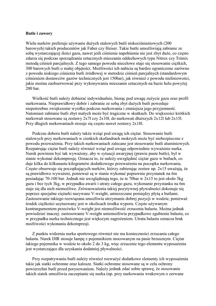 Butle i zawory Wielu nurków preferuje używanie dużych stalowych butli niskociśnieniowych (200 barowych) takich producentów jak Faber czy Heiser. Takie butle umożliwiają zabranie ze sobą wystarczającej ilości gazu, nawet jeśli ciśnienie napełnienia nie jest zbyt duże, co często zdarza się podczas sporządzania sztucznych mieszanin oddechowych typu Nitrox czy Trimix metodą ciśnień parcjalnych. Z tego samego powodu niecelowe staje się stosowanie ciężkich, 300 barowych butli o małej objętości. Możliwości ich nabicia są bardzo ograniczone zarówno z powodu niskiego ciśnienia butli źródłowej w metodzie ciśnień parcjalnych (standardowym ciśnieniem dostawców gazów technicznych jest 150bar), jak również z powodu nieliniowości, jakie można zaobserwować przy wykonywaniu mieszanin sztucznych na bazie helu powyżej 200 bar. Wielkość butli należy dobierać indywidualnie, biorąc pod uwagę zużycie gazu oraz profil nurkowania. Nieprawidłowy dobór i zabranie ze sobą zbyt dużych butli powoduje niepotrzebne zwiększenie wysiłku podczas nurkowania i zmniejsza jego przyjemność. Natomiast zabranie butli zbyt małych może być tragiczne w skutkach. Do większości krótkich nurkowań stosowane są zestawy 2x7l czy 2x10l, do nurkowań dłuższych 2x12l lub 2x15l. Przy długich nurkowaniach stosuje się często nawet zestawy 2x18l. Podczas doboru butli należy także wziąć pod uwagę ich ciężar. Stosowanie butli stalowych przy nurkowaniach w cienkich skafandrach mokrych może być niebezpieczne z powodu przeważenia. Przy takich nurkowaniach zalecane jest stosowanie butli aluminiowych. Rozpatrując ciężar butli należy również wziąć pod uwagę odpowiednie wyważenie nurka. Nurek powinien być tak wyważony, aby w sytuacji awaryjnej (prawie puste butle), był w stanie wykonać dekompresję. Oznacza to, że należy uwzględnić ciężar gazu w butlach, co daje kilka do kilkunastu kilogramów dodatkowego przeważenia na początku nurkowania. Często obserwuje się początkujących nurków, którzy zabierając zestaw np. 2x15 uważają, że są prawidłowo wyważeni, ponieważ są w stanie wykonać poprawnie przystanek na 6m posiadając 70-100 bar. Jednak nie uwzględniają tego, że te 70bar w 2x15 to jest około 3kg gazu i bez tych 3kg, w przypadku awarii i utraty całego gazu, wykonanie przystanku na 6m staje się dla nich niemożliwe. Zrównoważenia takiej pozytywnej pływalności dokonuje się poprzez specjalne ciężarki nazywane V-weight, umieszczane pomiędzy płytą a butlami. Zastosowanie takiego rozwiązana umożliwia utrzymanie dobrej pozycji w wodzie, ponieważ środek ciężkości usytuowany jest w okolicach środka wyporu. Często używanym kontrargumentem przeciwko V-weight jest niemożliwość zrzucenia balastu. Można jednak powiedzieć inaczej: zastosowanie V-weight uniemożliwia przypadkowe zgubienie balastu, co w przypadku nurka technicznego jest większym zagrożeniem. Utrata balastu oznacza brak możliwości wykonania dekompresji. Z punktu widzenia nurka sportowego również nie ma konieczności zrzucania całego balastu. Nurek DIR stosuje lampę z pojemnikiem mocowanym na pasie brzusznym. Ciężar takiego pojemnika w wodzie to około 2 do 3 kg, więc zrzucenie tego elementu wyposażenia jest wystarczające dla uzyskania dodatniej pływalności. Przy rozpatrywaniu butli należy również rozważyć dodatkowe elementy ich wyposażenia takie jak siatki ochronne oraz kalosze. Siatki ochronne stosowane są w celu ochrony powierzchni butli przed porysowaniem. Należy jednak zdać sobie sprawę, że stosowanie takich siatek umożliwia zaczepianie się nurka (np. przy nurkowaniu wrakowym o zerwane haczyki wędkarskie), w sposób uniemożliwiający wyplątanie się czy wycięcie bez zdjęcia sprzętu. Tak więc siatek ochronnych zaawansowany nurek nie stosuje, tak samo jak kaloszy. Jedynym zastosowaniem kaloszy jest postawienie zestawu na lekcji nurkowania w celu zademonstrowania jak nie należy robić. Zestaw nurkowy kładzie się, nie stawia. Przewrócenie zestawu, często spotykane, skutecznie niszczy resztę sprzętu a w szczególności zawory i automaty. Jeśli butle nie mają kaloszy, nurek nie ma pokusy żeby stawiać zestaw. Kolejną wadą kaloszy jest dodatkowy ciężar, który w przypadku zestawu 2x15 może dojść nawet do 3kg. Po co więc nosić ze sobą dodatkowe kilogramy w całym tym i tak ciężkim sprzęcie? Argumentem przeciw stosowaniu kaloszy jest również to, że butle rdzewieją pod kaloszami. Oczywiście nie zwracamy na to uwagi aż do momentu kolejnej legalizacji a wtedy jest już zbyt późno żeby cokolwiek zrobić. Podczas wyboru butli ważny jest również rodzaj powłoki, jaką butla jest pokryta. Istnieją dwie zasadnicze rodzaje powłok spotykane na rynku: lakier piecowy oraz lakier zwykły. Pierwszy jest zdecydowanie trwalszy ponieważ powłoka jest utwardzona podczas procesu malowania. Zwykły lakier nie ma takiej odporności i bardzo szybko ulega zniszczeniu. * informacja pochodzą ze strony www.hogarthian.pl Tomasz Żabierek