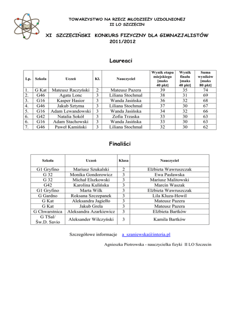 TOWARZYSTWO NA RZECZ MŁODZIEŻY UZDOLNIONEJ II LO SZCZECIN XI SZCZECIŃSKI KONKURS FIZYCZNY DLA GIMNAZJALISTÓW 2011/2012 Laureaci Lp. Szkoła 1. 2. 3. 4. 5. 6. 6. 7. Uczeń G Kat Mateusz Raczyński G46 Agata Lonc G16 Kasper Hasior G46 Jakub Sztyma G16 Adam Lewandowski G42 Natalia Sokół G16 Adam Stachowski G46 Paweł Kamiński Kl. Nauczyciel Wynik etapu miejskiego [maks 40 pkt] 2 3 3 3 3 3 3 3 Mateusz Pazera Liliana Stochmal Wanda Jasińska Liliana Stochmal Wanda Jasińska Zofia Trzaska Wanda Jasińska Liliana Stochmal 39 38 36 37 34 33 33 32 Wynik finału [maks 40 pkt] Suma wyników [maks 80 pkt] 35 31 32 30 32 30 30 30 74 69 68 67 66 63 63 62 Finaliści Szkoła Uczeń Klasa Nauczyciel G1 Gryfino G 32 G 32 G42 G1 Gryfino G Gardno G Kat G Kat G Chwarstnica G TSal/ Św.D. Savio Mariusz Szukalski Monika Gondorowicz Michał Elszkowski Karolina Kulińska Marta Wilk Roksana Szczepanek Aleksandra Jagiełło Jakub Grela Aleksandra Azarkiewicz 2 3 3 3 3 3 3 3 3 Elżbieta Wawruszczak Ewa Pasławska Mariusz Malitowski Marcin Waszak Elżbieta Wawruszczak Lila Kluza-Howil Mateusz Pazera Mateusz Pazera Elżbieta Bartków Aleksander Wilczyński 3 Kamila Bartków Szczegółowe informacje [email protected] Agnieszka Piotrowska - nauczycielka fizyki II LO Szczecin