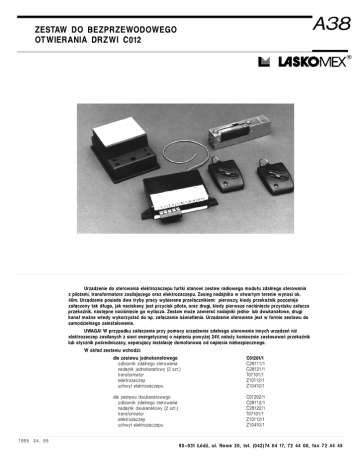 A 3 8 ZESTAW DO BEZPRZEWODOWEGO OTWIERANIA DRZWI C012 ® Urz Ñ dzenie do sterowania elektrozaczepu furtki stanowi zestaw radiowego modu Ô u zdalnego sterowania z pilotami, transformatora zasilajÑ cego oraz elektrozaczepu. ZasiÓ g nadajnika w otwartym terenie wynosi ok. 40m. Urz Ñ dzenie posiada dwa tryby pracy wybierane prze ÔÑ cznikiem: pierwszy, kiedy przeka Ø nik pozostaje za ÔÑ czony tak d Ô ugo, jak naciskany jest przycisk pilota, oraz drugi, kiedy pierwsze naci× niÓ cie przycisku za ÔÑ cza przeka Ø nik, nast Ó pne naci× niÓ cie go wy ÔÑ cza. Zestaw mo … e zawiera Ò nadajniki jedno - lub dwukana Ô owe, drugi kana Ô mo … na wtedy wykorzysta Ò do np. za ÔÑ czania o × wietlenia. Urz Ñ dzenie oferowane jest w formie zestawu do samodzielnego zainstalowania. UWAGA! W przypadku za ÔÑ czania przy pomocy urz Ñ dzenia zdalnego sterowania innych urz Ñ dze Õ ni… elektrozaczep zasilanych z sieci energetycznej o napiÓ ciu powy … ej 24V, nale … y koniecznie zastosowa Ò przeka Ø nik lub stycznik po × rednicz Ñ cy, separujÑ cy instalacj Ó domofonow Ñ od napiÓ cia niebezpiecznego. W sk Ô ad zestawu wchodzi: dla zestawu jednokana Ô owego odbiornik zdalnego sterowania nadajnik jednokana Ô owy (2 szt.) transformator elektrozaczep uchwyt elektrozaczepu C01201/1 C281 1 1 /1 C281 21 /1 T071 01 /1 Z1 01 1 2/1 Z1 041 0/1 dla zestawu dwukana Ô owego odbiornik zdalnego sterowania nadajnik dwukana Ô owy (2 szt.) transformator elektrozaczep uchwyt elektrozaczepu C01 202/1 C281 1 2/1 C281 22/1 T071 01 /1 Z1 01 1 2/1 Z1 041 0/1 1 995. 04. 05 90− 031 ÄÖ d Ø , ul. Nowa 20, tel. (042)74 04 17, 72 44 00, fax 72 44 45