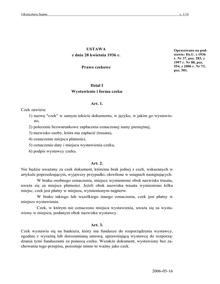 2006-05-16 USTAWA z dnia 28 kwietnia 1936 r. Prawo czekowe