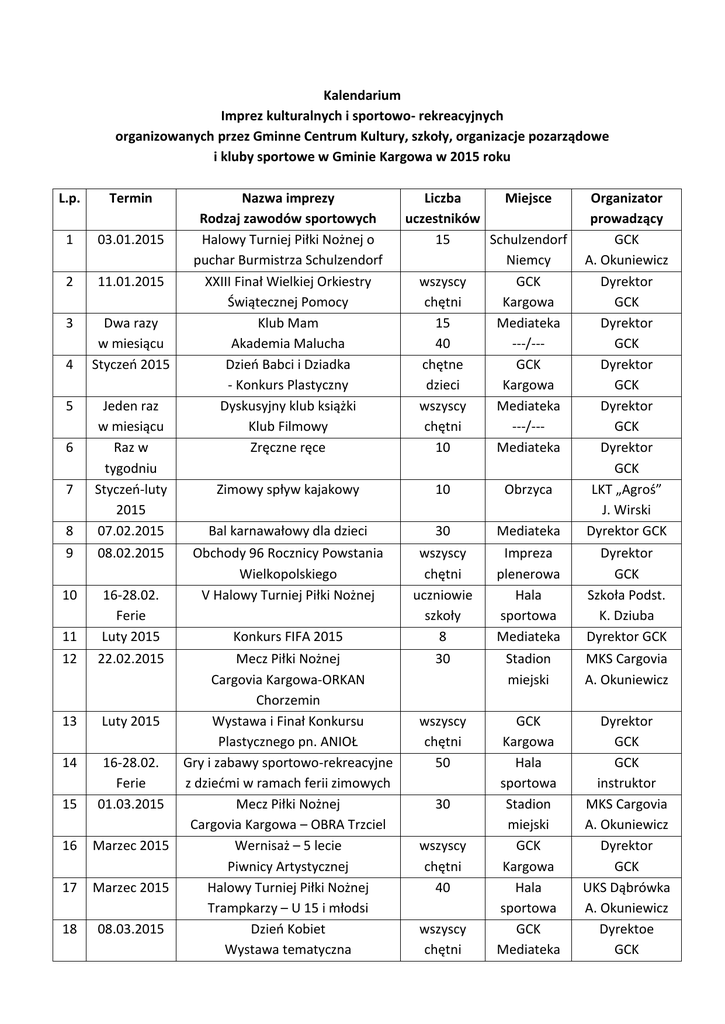 Kalendarium Imprez kulturalnych i sportowo- rekreacyjnych organizowanych przez Gminne Centrum Kultury, szkoły, organizacje pozarządowe i kluby sportowe w Gminie Kargowa w 2015 roku L.p. Termin 1 03.01.2015 2 11.01.2015 3 Dwa razy w miesiącu Styczeń 2015 4 5 8 Jeden raz w miesiącu Raz w tygodniu Styczeń-luty 2015 07.02.2015 9 08.02.2015 10 11 16-28.02. Ferie Luty 2015 12 22.02.2015 6 7 13 14 15 16 17 18 Nazwa imprezy Rodzaj zawodów sportowych Halowy Turniej Piłki Nożnej o puchar Burmistrza Schulzendorf XXIII Finał Wielkiej Orkiestry Świątecznej Pomocy Klub Mam Akademia Malucha Dzień Babci i Dziadka - Konkurs Plastyczny Dyskusyjny klub książki Klub Filmowy Zręczne ręce Zimowy spływ kajakowy 10 Obrzyca Bal karnawałowy dla dzieci 30 Mediateka Organizator prowadzący GCK A. Okuniewicz Dyrektor GCK Dyrektor GCK Dyrektor GCK Dyrektor GCK Dyrektor GCK LKT „Agroś” J. Wirski Dyrektor GCK Obchody 96 Rocznicy Powstania Wielkopolskiego V Halowy Turniej Piłki Nożnej wszyscy chętni uczniowie szkoły 8 Impreza plenerowa Hala sportowa Mediateka Dyrektor GCK Szkoła Podst. K. Dziuba Dyrektor GCK 30 Stadion miejski MKS Cargovia A. Okuniewicz wszyscy chętni 50 GCK Kargowa Hala sportowa Stadion miejski GCK Kargowa Hala sportowa GCK Mediateka Dyrektor GCK GCK instruktor MKS Cargovia A. Okuniewicz Dyrektor GCK UKS Dąbrówka A. Okuniewicz Dyrektoe GCK Konkurs FIFA 2015 Mecz Piłki Nożnej Cargovia Kargowa-ORKAN Chorzemin Luty 2015 Wystawa i Finał Konkursu Plastycznego pn. ANIOŁ 16-28.02. Gry i zabawy sportowo-rekreacyjne Ferie z dziećmi w ramach ferii zimowych 01.03.2015 Mecz Piłki Nożnej Cargovia Kargowa – OBRA Trzciel Marzec 2015 Wernisaż – 5 lecie Piwnicy Artystycznej Marzec 2015 Halowy Turniej Piłki Nożnej Trampkarzy – U 15 i młodsi 08.03.2015 Dzień Kobiet Wystawa tematyczna Liczba Miejsce uczestników 15 Schulzendorf Niemcy wszyscy GCK chętni Kargowa 15 Mediateka 40 ---/--chętne GCK dzieci Kargowa wszyscy Mediateka chętni ---/--10 Mediateka 30 wszyscy chętni 40 wszyscy chętni 19 08.03.2015 20 21 Marzec 2015 15.03.2015 22 21.03.2015 23 21-22.03. 2015 22.03.2015 24 25 26 27 28 29 30 31 32 33 34 35 36 37 38 Marzec 2015 29.03.2015 Kwiecień 2015 Kwiecieńmaj-czerwiec 01-02.04. 2015 04.04.2015 Mecz Piłki Nożnej 30 Cargovia Kargowab- KLON Babimost Mistrzostwa Szkoły Klasy IV - VI w skoku wzwyż Mecz Piłki Nożnej 30 SCHNUG Chociule-Cargovia Kargowa Pierwszy Dzień Wiosny wszyscy Dzień Ziemi chętni Wiosenny Rajd Rowerowy 9 Mecz Piłki Nożnej Cargovia Kargowa- Gwiazda Śiedlec Rozgrywki Piłki Nożnej o puchar Tymbarku Zawody na rozpoczęcie sezonu wędkarskiego Warsztaty wielkanocne Rozgrywki IV Ligi Tenisa Stołowego w/g terminarza XV Festiwal Piosenki Dziecięcej „Od Przedszkola do Kargowej” Mecz Piłki Nożnej klasa A Gr. III Cargovia Kargowa - AVIA Siedlnica 08.04.2015 Wielkanocny Spływ Kajakowy KwiecieńRozgrywki III Ligi Piłki Nożnej Kobiet maj-czerwiec w/g terminarza 12.04.2015 Spławikowe Mistrzostwa Koła I tura na 1 wędkę 14.04.2015 Lubuski Konkurs Recytatorski Eliminacje Gminne 18.04.2015 Mecz Piłki Nożnej klasa A Gr. III Cargovia Kargowa – Błękitni Lubięcin 26.04.2015 Spławikowe Mistrzostwa Koła II tura na 1 wędkę Kwiecień- Rozgrywki Okręgowej Ligi Juniorów maj-czerwiec wg terminarza Maj Majówka na sportowo 2015 Impreza plenerowa Maj Plener malarski 2015 30 Klasy II - III 30 Wszyscy chętni 20 Chętne dzieci 30 26 40 30 Wszyscy chętni 30 30 30 Wszyscy chętni w/g listy zgłoszeń Stadion miejski Hala sportowa Stadion miejski MKS Cargovia A. Okuniewicz Szkoła Podst. G.Omieczyńska MKS Cargovia A. Okuniewicz Rynek Dyrektor w Kargowej GCK PN LKT „Agroś” Ujście Warty J. Jaszczak Stadion MKS Cargovia miejski A. Okuniewicz Boisko Szkoła Podst. Orlik K. Dziuba Jezioro Koło Nr. 1 Święte A.Wawrznowicz GCK Mediateka Hala sportowa GCK Kargowa Stadion miejski Kanał Obrzycki Stadion miejski Północny Kanał Obry GCK Kargowa Stadion miejski Dyrektor GCK UKS Top-Spin J. Radkiewicz Dyrektor GCK MKS Cargovia A. Okuniewicz LKT „Agroś” J. Jaszczak UKS Dąbrówka A. Okuniewicz Koło Nr.1 A.Wawrzynowicz Dyrektor GCK MKS Cargovis A. Okuniewicz Obrzyca k/Ujścia Stadion miejski Stadion miejski Karszyn Koło Nr.1 A.Wawrzynowicz MKS Cargovia A. Okuniewicz GCK instruktor Dyrektor GCK 39 40 41 Maj 2015 Maj 2015 01.05.2015 Rodzinny Piknik Modelarski Wystawa Jana Pawła II Wszyscy chętni Wszyscy chętni 100 Rejon ul.Sportowej Mediateka Dyrektor GCK Dyrektor GCK MKS Cargovia A. Okuniewicz MKS Cargovia A. Okuniewicz Turniej Piłki Nożnej Boisko Drużyn Zakładowych „Orlik” 42 02.05.2015 Mecz Piłki Nożnej klasa A Gr. III 30 Stadion Cargovia Kargowa- Mieszko miejski Konotop 43 02.05.2015 Nocne otwarte zawody wędkarskie 40 Rzeka Odra Koło Nr. ! Parami na 2 wędki k/Kleniczek A.Wawrzynowicz 44 Maj-czerwiec Mistrzostwa Kargowej 20 Boisko Gimnazjum 2015 w tenisie ziemnym „Orlik” L. Radom 45 11.05.2015 Wojewódzkie Spotkania Teatrów w/g listy GCK Dyrektor Dziecięcych Lubuska Gala Teatralna zgłoszeń Kargowa GCK 46 16.05.2015 Mecz Piłki Nożnej klasa A Gr. III 30 Stadion MKS Cargovia Cargovia Kargowa– Nowe miejski A. Okuniewicz Miasteczko 47 21-22.05. XV Lubuski Konkurs Recytatorski Osoby GCK Dyrektor 2015 Prezentacje finałowe PRO ARTE zakwalifikow Kargowa GCK 48 21-22.05. Polska Biega 800 Wyznaczone Gimnazjum 2015 „Bieg Kargowiaka” trasy biegu L. Radom 49 Maj Dzień Matki - wystawa Wszyscy Mediateka Dyrektor 2015 chętni GCK 50 24.05.2015 XIV Turniej Piłki Nożnej Trampkarzy 50 Boisko UKS Dąbrówka o puchar Burmistrza Kargowej „Orlik” A. Okuniewicz 51 24.05.2015 Wiosenne spinningowanie 15 Rzeka Odra Koło Nr.1 k/Młynkowa A.Wawrzynowicz 52 Maj Tydzień Bibliotek Wszyscy Rejon Dyrektor 2015 Impreza plenerowa chętni Kargowej GCK 53 30.05.2015 Mecz Piłki Nożnej klasa A Gr. III 30 Stadion MKS Cargovia Cargovia Kargowa – KORA miejski A. Okuniewicz Niedoradz 54 Czerwiec Spływ kajakowy dla dzieci SP 60 Obrzyca 