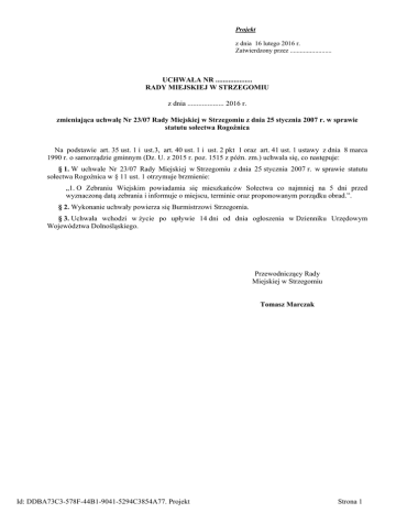 Projekt z dnia 16 lutego 2016 r. Zatwierdzony przez ......................... UCHWAŁA NR .................... RADY MIEJSKIEJ W STRZEGOMIU z dnia .................... 2016 r. zmieniająca uchwałę Nr 23/07 Rady Miejskiej w Strzegomiu z dnia 25 stycznia 2007 r. w sprawie statutu sołectwa Rogoźnica Na podstawie art. 35 ust. 1 i ust.3, art. 40 ust. 1 i ust. 2 pkt 1 oraz art. 41 ust. 1 ustawy z dnia 8 marca 1990 r. o samorządzie gminnym (Dz. U. z 2015 r. poz. 1515 z późn. zm.) uchwala się, co następuje: § 1. W uchwale Nr 23/07 Rady Miejskiej w Strzegomiu z dnia 25 stycznia 2007 r. w sprawie statutu sołectwa Rogoźnica w § 11 ust. 1 otrzymuje brzmienie: „1. O Zebraniu Wiejskim powiadamia się mieszkańców Sołectwa co najmniej na 5 dni przed wyznaczoną datą zebrania i informuje o miejscu, terminie oraz proponowanym porządku obrad.”. § 2. Wykonanie uchwały powierza się Burmistrzowi Strzegomia. § 3. Uchwała wchodzi w życie po upływie 14 dni od dnia ogłoszenia w Dzienniku Urzędowym Województwa Dolnośląskiego. Przewodniczący Rady Miejskiej w Strzegomiu Tomasz Marczak Id: DDBA73C3-578F-44B1-9041-5294C3854A77. Projekt Strona 1 Uzasadnienie Do Urzędu Miejskiego w Strzegomiu wpłynęła uchwała Nr 2/15 Zebrania Wiejskiego w Rogoźnicy z dnia 29 września 2015 r. w sprawie wprowadzenia zmian w statucie sołectwa Rogoźnica przyjętego uchwałą Nr 23/07 Rady Miejskiej w Strzegomiu z dnia 25 stycznia 2007 r. Uczestniczący w konsultacjach mieszkańcy sołectwa Rogoźnica jednogłośnie opowiedzieli się za wprowadzeniem zmiany w statucie sołectwa tak, by o Zebraniu Wiejskim powiadamiać mieszkańców Sołectwa co najmniej na 5 dni przed wyznaczoną datą zebrania. W związku z powyższym wprowadzenie niniejszej zmiany w statucie sołectwa Rogoźnica jest zasadne. Id: DDBA73C3-578F-44B1-9041-5294C3854A77. Projekt Strona 1