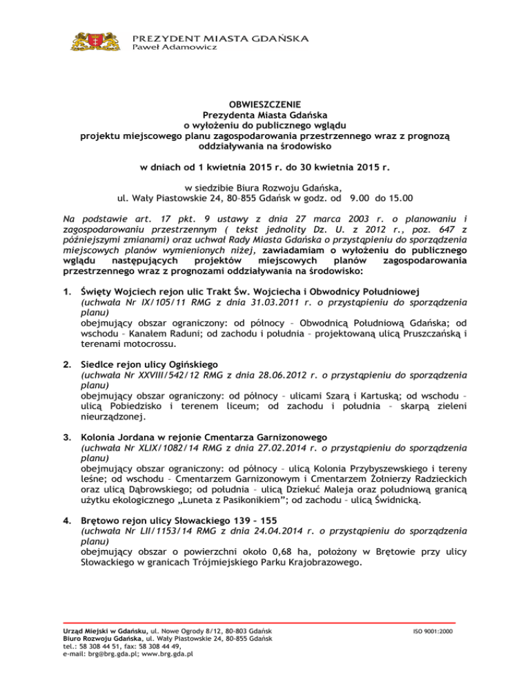 OBWIESZCZENIE Prezydenta Miasta Gdańska o wyłożeniu do publicznego wglądu projektu miejscowego planu zagospodarowania przestrzennego wraz z prognozą oddziaływania na środowisko w dniach od 1 kwietnia 2015 r. do 30 kwietnia 2015 r. w siedzibie Biura Rozwoju Gdańska, ul. Wały Piastowskie 24, 80–855 Gdańsk w godz. od 9.00 do 15.00 Na podstawie art. 17 pkt. 9 ustawy z dnia 27 marca 2003 r. o planowaniu i zagospodarowaniu przestrzennym ( tekst jednolity Dz. U. z 2012 r., poz. 647 z późniejszymi zmianami) oraz uchwał Rady Miasta Gdańska o przystąpieniu do sporządzenia miejscowych planów wymienionych niżej, zawiadamiam o wyłożeniu do publicznego wglądu następujących projektów miejscowych planów zagospodarowania przestrzennego wraz z prognozami oddziaływania na środowisko: 1. Święty Wojciech rejon ulic Trakt Św. Wojciecha i Obwodnicy Południowej (uchwała Nr IX/105/11 RMG z dnia 31.03.2011 r. o przystąpieniu do sporządzenia planu) obejmujący obszar ograniczony: od północy – Obwodnicą Południową Gdańska; od wschodu – Kanałem Raduni; od zachodu i południa – projektowaną ulicą Pruszczańską i terenami motocrossu. 2. Siedlce rejon ulicy Ogińskiego (uchwała Nr XXVIII/542/12 RMG z dnia 28.06.2012 r. o przystąpieniu do sporządzenia planu) obejmujący obszar ograniczony: od północy – ulicami Szarą i Kartuską; od wschodu – ulicą Pobiedzisko i terenem liceum; od zachodu i południa – skarpą zieleni nieurządzonej. 3. Kolonia Jordana w rejonie Cmentarza Garnizonowego (uchwała Nr XLIX/1082/14 RMG z dnia 27.02.2014 r. o przystąpieniu do sporządzenia planu) obejmujący obszar ograniczony: od północy – ulicą Kolonia Przybyszewskiego i tereny leśne; od wschodu – Cmentarzem Garnizonowym i Cmentarzem Żołnierzy Radzieckich oraz ulicą Dąbrowskiego; od południa – ulicą Dziekuć Maleja oraz południową granicą użytku ekologicznego „Luneta z Pasikonikiem”; od zachodu – ulicą Świdnicką. 4. Brętowo rejon ulicy Słowackiego 139 – 155 (uchwała Nr LII/1153/14 RMG z dnia 24.04.2014 r. o przystąpieniu do sporządzenia planu) obejmujący obszar o powierzchni około 0,68 ha, położony w Brętowie przy ulicy Słowackiego w granicach Trójmiejskiego Parku Krajobrazowego. Urząd Miejski w Gdańsku, ul. Nowe Ogrody 8/12, 80-803 Gdańsk Biuro Rozwoju Gdańska, ul. Wały Piastowskie 24, 80-855 Gdańsk tel.: 58 308 44 51, fax: 58 308 44 49, e-mail: [email protected]; www.brg.gda.pl ISO 9001:2000 5. Cmentarz Centralny Srebrzysko II (uchwała Nr XLIX/1090/14 RMG z dnia 27.02.2014 r. o przystąpieniu do sporządzenia planu) obejmujący obszar ograniczony: od północy – Aleją Żołnierzy Wyklętych; od wschodu – wschodnią granica terenu zbiornika retencyjnego „Srebrzysko” oraz wschodnią granica terenu Wojewódzkiego Szpitala Psychiatrycznego im. prof. Bilikiewicza, fragmentem ulicy Srebrniki oraz terenami leśnymi; od południa granicą terenów dawnego poligonu wojskowego; od zachodu – wschodnią granicą terenu Pomorskiej Kolei Metropolitalnej. 6. Matemblewo - część centralna (uchwała Nr XLII/971/13 RMG z dnia 26.09.2013 r. o przystąpieniu do sporządzenia planu) obejmujący obszar ograniczony: od południa z ulicą Matemblewską; od północy – ulicą Waldorffa; od wschodu – ulicą Potokową i dawnym wyrobiskiem żwiru; od zachodu – zabudową mieszkaniową i usługową. 7. Oliwa Górna rejon ulicy Bytowskiej (uchwała Nr L/1123/14 RMG z dnia 27.03.2014 r. o przystąpieniu do sporządzenia planu) obejmujący obszar ograniczony: od północy – granicą działki nr 79/2 obr. 10; od wschodu – ulicą Bytowską; od południa – granicą zbiornika retencyjnego Kuźnia Wodna oraz zabudową hotelu dwór Oliwski; od zachodu – potokiem Prochowym. 8. Oliwa Dolna rejon ulicy Orłowskiej i Wejhera (uchwała Nr LIII/1199/14 RMG z dnia 29.05.2014 r. o przystąpieniu do sporządzenia planu) obejmujący obszar pomiędzy ulicą Orłowską, linią tramwajową przy ulicy Pomorskiej i planowaną ulicą tzw. „Drogą Zieloną”. 9. Maćkowy rejon ulic Czerskiej i Jagatowskiej (uchwała Nr LVI/1305/14 RMG z dnia 28.08.2014 r. o przystąpieniu do sporządzenia planu) obejmujący obszar o powierzchni 3,51 ha pomiędzy ulicami Czerską i Jagatowską. 10. Chełm – cmentarz przy ulicy Stoczniowców (uchwała Nr XLIX/1083/14 RMG z dnia 27.02.2014 r. o przystąpieniu do sporządzenia planu) obejmujący obszar ograniczony: od północy – ulicą Stoczniowców; od wschodu – Traktem Św. Wojciecha; od południa – ulicą Cienistą; od zachodu – terenem istniejącego cmentarza. 11. Zakoniczyn rejon ulicy Unruga (uchwała Nr XLIX/1085/14 RMG z dnia 27.02.2014 r. o przystąpieniu do sporządzenia planu) obejmujący obszar ograniczony: od północy – ulicą Świrskiego: od zachodu – ulicą Huenefelda oraz ulicą Wieżycką; od wschodu – ulicą Unruga; od południa – ulicą Porębskiego. 12. Barniewice rejon ulic Nowy Świat i Zeusa (uchwała Nr LVI/1303/14 RMG z dnia 28.08.2014 r. o przystąpieniu do sporządzenia planu) obejmujący obszar o powierzchni około 0.39 ha położony w rejonie ulic Nowy Świat i Zeusa. 2 13. Klukowo rejon ulic Galaktycznej i Radarowej (uchwała Nr XXXI/640/12 RMG z dnia 25.10.2012 r. o przystąpieniu do sporządzenia planu) obejmujący obszar o powierzchni około 7,94 ha położony pomiędzy ulicami Telewizyjną i Galaktyczną oraz bocznicą kolejową, od północy ograniczony terenami ogródków działkowych. 14. Klukowo – Rębiechowo rejon ulic tzw. Nowej Spadochroniarzy i Telewizyjnej (uchwała Nr L/1124/14 RMG z dnia 27.03.2014 r. o przystąpieniu do sporządzenia planu) obejmujący obszar o powierzchni około 3,3 ha położony w rejonie ulicy Telewizyjnej nr 11. 15. Kokoszki Przemysłowe rejon pomiędzy ulicą Bysewską a terenami kolejowymi II (uchwała Nr LVII/1336/14 RMG z dnia 25.09.2014 r. o przystąpieniu do sporządzenia planu) obejmujący obszar o powierzchni około 23,91 ha 