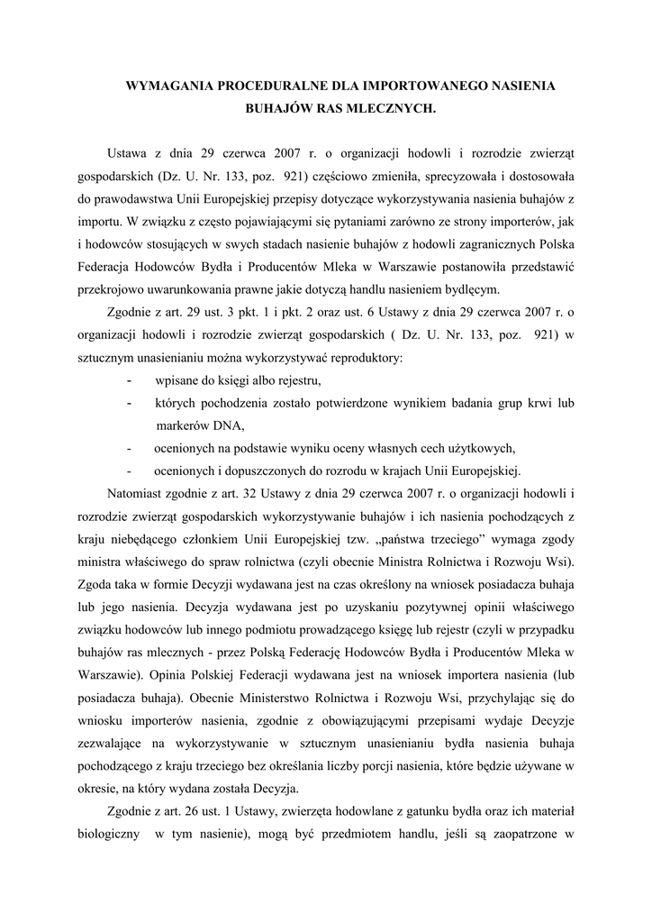 WYMAGANIA PROCEDURALNE DLA IMPORTOWANEGO NASIENIA BUHAJÓW RAS MLECZNYCH. Ustawa z dnia 29 czerwca 2007 r. o organizacji hodowli i rozrodzie zwierząt gospodarskich (Dz. U. Nr. 133, poz. 921) częściowo zmieniła, sprecyzowała i dostosowała do prawodawstwa Unii Europejskiej przepisy dotyczące wykorzystywania nasienia buhajów z importu. W związku z często pojawiającymi się pytaniami zarówno ze strony importerów, jak i hodowców stosujących w swych stadach nasienie buhajów z hodowli zagranicznych Polska Federacja Hodowców Bydła i Producentów Mleka w Warszawie postanowiła przedstawić przekrojowo uwarunkowania prawne jakie dotyczą handlu nasieniem bydlęcym. Zgodnie z art. 29 ust. 3 pkt. 1 i pkt. 2 oraz ust. 6 Ustawy z dnia 29 czerwca 2007 r. o organizacji hodowli i rozrodzie zwierząt gospodarskich ( Dz. U. Nr. 133, poz. 921) w sztucznym unasienianiu moŜna wykorzystywać reproduktory: - wpisane do księgi albo rejestru, - których pochodzenia zostało potwierdzone wynikiem badania grup krwi lub markerów DNA, - ocenionych na podstawie wyniku oceny własnych cech uŜytkowych, - ocenionych i dopuszczonych do rozrodu w krajach Unii Europejskiej. Natomiast zgodnie z art. 32 Ustawy z dnia 29 czerwca 2007 r. o organizacji hodowli i rozrodzie zwierząt gospodarskich wykorzystywanie buhajów i ich nasienia pochodzących z kraju niebędącego członkiem Unii Europejskiej tzw. „państwa trzeciego” wymaga zgody ministra właściwego do spraw rolnictwa (czyli obecnie Ministra Rolnictwa i Rozwoju Wsi). Zgoda taka w formie Decyzji wydawana jest na czas określony na wniosek posiadacza buhaja lub jego nasienia. Decyzja wydawana jest po uzyskaniu pozytywnej opinii właściwego związku hodowców lub innego podmiotu prowadzącego księgę lub rejestr (czyli w przypadku buhajów ras mlecznych - przez Polską Federację Hodowców Bydła i Producentów Mleka w Warszawie). Opinia Polskiej Federacji wydawana jest na wniosek importera nasienia (lub posiadacza buhaja). Obecnie Ministerstwo Rolnictwa i Rozwoju Wsi, przychylając się do wniosku importerów nasienia, zgodnie z obowiązującymi przepisami wydaje Decyzje zezwalające na wykorzystywanie w sztucznym unasienianiu bydła nasienia buhaja pochodzącego z kraju trzeciego bez określania liczby porcji nasienia, które będzie uŜywane w okresie, na który wydana została Decyzja. Zgodnie z art. 26 ust. 1 Ustawy, zwierzęta hodowlane z gatunku bydła oraz ich materiał biologiczny w tym nasienie), mogą być przedmiotem handlu, jeśli są zaopatrzone w świadectwo potwierdzające ich pochodzenie, o którym mowa w przepisach Unii Europejskiej dotyczących świadectw obowiązujących w handlu. Wymagania jakie powinno spełniać świadectwo rodowodowe towarzyszące przesyłce nasienia buhajów w handlu określone są w decyzji Komisji nr 2005/379/WE z dnia 17 maja 2005 w sprawie świadectw rodowodowych i danych szczegółowych dotyczących zwierząt hodowlanych czystorasowych z gatunku bydła oraz ich nasienia, komórek jajowych i zarodków (Dz. Urz. UE L 125 z 18.05.2005r, str. 15). Świadectwo takie powinno być wystawione przez uznaną organizację hodowców prowadzącą księgi w kraju skąd nasienie zostało przywiezione do Polski lub urzędowo uznane centrum pozyskiwania lub przechowywania nasienia bądź w przypadku zarodków przez zespoły pozyskiwania zarodków. Świadectwa rodowodowe mogą być zastąpione przez zbiór dokumentów towarzyszących przesyłce nasienia, takŜe rodowód buhaja wystawiony przez związek hodowców prowadzący księgę w kraju pochodzenia nasienia, pod warunkiem, Ŝe dokumenty te zostały uwierzytelnione przez organizację hodowców prowadzącą księgę, która potwierdzi ich kompletność za pomocą formułki: „NiŜej podpisany zaświadcza, Ŝe dane szczegółowe wymagane zgodnie z art. 3 decyzji Komisji 2005/379/We są zawarte w załączonych dokumentach....” Na dokumenty te mogą składać się: rodowód buhaja z aktualnymi wynikami oceny genetycznej zwierzęcia, wynik badania grup krwi lub markerów genetycznych DNA z potwierdzeniem pochodzenia po parze rodzicielskiej oraz świadectwo weterynaryjne w handlu wewnątrzwspólnotowym. W przypadku gdy nasienie sprowadzone z państw trzecich wymagane dokumenty określone są w decyzji Komisji 96/510/WE z dnia 18 lipca 1996r. ustanawiającej zaświadczenia hodowlane i zootechniczne w przywozie zwierząt hodowlanych, ich nasienia, komórek jajowych i zarodków (Dz. Urz. WE L 210 z 20.08.1996r., str. 53 z póŜn. zm.; Dz. Urz. UE Polskie wydanie specjalne rozdz. 3, t 19 str. 355, z póŜn. zm.) De facto mogą to być dokumenty zawierające takie same informacje jak wymagane przy imporcie nasienia z kraju Unii Europejskiej. JednakŜe tym razem ich kompletność potwierdza podpisem i formułką: „Ja niŜej podpisany zaświadczam, Ŝe niniejsze dokumenty zawierają dane wymienione w decyzji Komisji 96/510/WE” odpowiedzialny pracownik organizacji prowadzącej księgi w kraju skąd pochodzi nasienie. Szczególnie istotną, zwłaszcza w punku widzenia hodowcy- nabywcy nasienia buhajów importowanych, zmianą jest zapis Ustawy w Art. 26 ust. 7 lit. c, który mówi, Ŝe do dokumentu handlowego, w który zaopatrywana jest kaŜda partia materiału biologicznego (w tym nasienia) wprowadzanego do obrotu na terytorium Rzeczpospolitej Polskiej w przypadku buhajów rasy holsztyńsko-fryzyjskiej dołączone są wyniki międzynarodowej oceny wartości hodowlanej udostępnione na stronie internetowej związku hodowców lub innego podmiotu, które zostały upowaŜnione przez ministra właściwego do spraw rolnictwa do prowadzenia oceny wartości hodowlanej tej rasy. Na terenie Rzeczpospolitej Polskiej do prowadzenia takiej oceny upowaŜniony jest Instytut Zootechniki - Państwowy Instytut Badawczy w Krakowie i na jego stronie internetowej publikowane są wyniki oceny. KaŜdy hodowca, który korzysta z nasienia buhajów holsztyńsko-fryzyjskich firm komercyjnych moŜe 