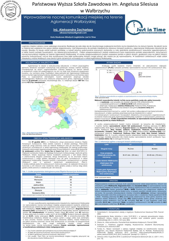 Państwowa Wyższa Szkoła Zawodowa i . A gelusa Silesiusa w Wał rzy hu Wprowadzenie nocnej komunikacji miejskiej na terenie śglomeracji Wałbrzyskiej inż. śleksandra Zachariasz [email protected] Koło Naukowe Młodych Logistyków Just in Time WPROWADZENIE Logistyka miejska nabiera coraz większego znaczenia. Realizując jej cele dąży się do nieustannego zwiększenia komfortu życia mieszkańców na danym terenie. Na jako ć życia w mie cie bez wątpienia ma wpływ dobrze zorganizowany, czyli dopasowany do potrzeb mieszkańców zbiorowy transport publiczny. Aglomeracja Wałbrzyska nieustannie się rozwija. Zjawisko to kreuje w ród ludno ci potrzebę, a nawet przymus pokonywania znacznych dystansów w celu spełnienia podstawowych warunków egzystencjalnych, a także swoich potrzeb towarzyskich, czy rekreacyjno-kulturalnych. Celem przeprowadzonych badań ankietowych było rozpoznanie potrzeb respondentów, dotyczących nocnej komunikacji miejskiej na terenie Aglomeracji Wałbrzyskiej. W wyniku przeprowadzonych badań wykazane zostało w jakich dniach, godzinach oraz na jakich trasach powinna funkcjonować nocna linia autobusowa oraz jakie potencjalne korzy ci mogą płynąć dla miasta po jej wprowadzeniu. W badaniach ankietowych wzięli udział mieszkańcy miasta Wałbrzych oraz dwóch gmin o ciennych wchodzących w skład Aglomeracji Wałbrzyskiej. AGLOMERACJA WAŁBRZYSKA WYNIKI BADAŃ Aglomeracja to obszar o rozbudowanej zabudowie, w którym poszczególne elementy składowe nawzajem wykorzystują swój potencjał, tworząc warto ć dodaną. Charakteryzuje się dużym nagromadzeniem ludno ci będącej na danym terenie w konkretnym czasie lub przebywającym na nim na stałe oraz zmożonym przepływem towarów, czy wymianą usług. Przykładem takiej jednostki jest Aglomeracja Wałbrzyska zwana również śglomeracją Sudecką zlokalizowana jest w południowo-zachodniej czę ci Polski, w województwie dolno ląskim. Swoim działaniem obejmuje o rodek ponadregionalny Wałbrzych oraz okoliczne zurbanizowane gminy. Aglomeracja skupia obecnie 23 jednostki samorządu terytorialnego (Rys. 1) i obejmuje obszar 1887 km i liczy ponad 427,3 tys. mieszkańców. śnalizując wyniki badania można stwierdzić, że zdecydowana większo ć ankietowanych (79,2%) wykazała potrzebę wprowadzenia nocnych linii autobusowych (Rys. 2). Rys. 2. Struktura respondentów ze względu na zapotrzebowanie na nocną komunikację miejską ŹródłoŚ opracowanie własne Większo ć respondentów twierdzi, że linie nocne spełniłyby swoją rolę, gdyby kursowały: • w weekendy, czyli od piątku do niedzieli włącznie (74% ankietowanych); • w przedziale godzinowym od 00:00 do 04:00 (66% ankietowanych); • obejmując następujące dzielnice Wałbrzycha: Piaskową Górę, Podzamcze, Szczawienko, ródmie cie oraz Sobięcin oraz gminę Szczawno-Zdrój (89% ankietowanych). Zainteresowanie linami nocnymi w „wolne” dni wynika z odbywających się imprez kulturalnorozrywkowych, a także z potrzeby przemieszczania się mieszkańców w celach m.in.rekreacyjnych, turystycznych i towarzyskich. Mieszkańcy chcą korzystać z organizowanych na terenie miasta oraz gmin Aglomeracji Wałbrzyskiej wydarzeń: w restauracjach, pubach czy klubach muzycznych. śż 80% respondentów stwierdziło, że wprowadzenie nocnej komunikacji publicznej ożywiło by miasto Wałbrzych. Rys. 1. Mapa Aglomeracji Wałbrzyskiej ŹródłoŚ httpŚ//aglomeracja-walbrzyska.pl OBECNY STAN TRANSORTU MIEJSKIEGO Od 29 grudnia 2012 r. w Wałbrzychu usługi przewozowe wiadczy ląskie Konsorcjum Autobusowe, które zostało wybrane w drodze przetargu. Przewoźnik wykonuje usługi przewozu osób po mie cie Wałbrzych oraz po dwunastu gminach o ciennych wchodzących w skład Aglomeracji Wałbrzyskiej. Do obsługi publicznego transportu zbiorowego organizowanego przez Gminę Wałbrzych, przewoźnik dysponuje 56 autobusami polskiej firmy Solaris Bus & Coach S.A [Stan na dzień 20.07.2015 r.]. Większo ć autobusów należy do ląskiego Konsorcjum Autobusowego, reszta do gminy Wałbrzych. Miasto dysponuje trzema modelami autobusów z serii Solaris Urbino o zróżnicowanej długo ci podwozia. Usługi wiadczone, są na dwunastu liniach autobusowych z czego siedem obsługuje kursy do gmin wchodzących w skład Aglomeracji Wałbrzyskiej. Operator korzysta z przystanków rozmieszczonych w gminie Wałbrzych oraz w gminach o ciennych przedstawionych (Tab.1). Z analizy rozkładu jazdy linii autobusowych można zauważyć, że większo ć linii zaczyna kursować w dni robocze oraz weekendy około godziny piątej a kończy bieg około godzny 23:00 zarówno w weekendy jak i dni robocze. Tab. 1. Liczba przystanków obsługiwana przez ląskie Konsorcjum Autobusowe Gmina Liczba przystanków Wałbrzych 286 Mieroszów 26 Walim 18 Jedlina-Zdrój 16 Boguszów-Gorce 11 Głuszyca 11 Szczawno-Zdrój 8 Źródło: opracowanie własne na podstawie: http://www.zdkium.walbrzych.pl/images/schemat.pdf (dostęp:18.12.2015 r.) BADANIA W celu zweryfikowania zapotrzebowania mieszkańców Aglomeracji Wałbrzyskiej na wprowadzenie nocnej komunikacji miejskiej przeprowadzono badania ankietowe. Kwestionariusze ankietowe były wypełniane przez okres dwóch tygodni. Respondentami byli mieszkańcy miasta Wałbrzycha oraz dwóch gmin o ciennych (Boguszów-Gorce, Szczawno-Zdrój) wchodzących w skład Aglomeracji Wałbrzyskiej, łącznie wypełnionych zostało 101 kwestionariuszy. W badaniu wzięło udział 53 kobiety oraz 48 mężczyzn. W przewadze były to osoby w wieku od 21 do 26 lat (75%). Studenci stanowili większo ć, bo aż 53,5%, osoby pracujące 40,6%, bezrobotni 4%, a emerytów/rencistów 2%. Kwestionariusz ankietowy składał się z sze ciu pytań z czego cztery były zamknięte, a dwa otwarte. Pytania otwarte dotyczyły wskazania dzielnic miasta Wałbrzycha po jakich powinny kursować nocne linie autobusowe co pozwoliło na przygotowanie przykładowych tras oraz mogli swobodnie w