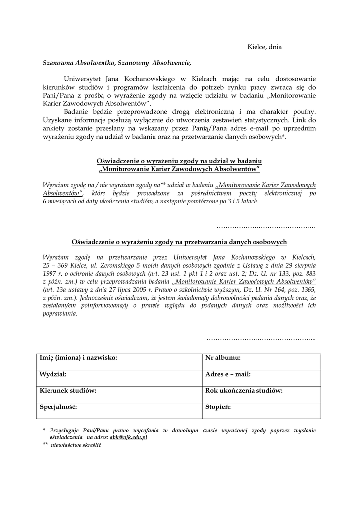 Kielce, dnia Szanowna Absolwentko, Szanowny Absolwencie, Uniwersytet Jana Kochanowskiego w Kielcach mając na celu dostosowanie kierunków studiów i programów kształcenia do potrzeb rynku pracy zwraca się do Pani/Pana z prośbą o wyrażenie zgody na wzięcie udziału w badaniu „Monitorowanie Karier Zawodowych Absolwentów”. Badanie będzie przeprowadzone drogą elektroniczną i ma charakter poufny. Uzyskane informacje posłużą wyłącznie do utworzenia zestawień statystycznych. Link do ankiety zostanie przesłany na wskazany przez Panią/Pana adres e-mail po uprzednim wyrażeniu zgody na udział w badaniu oraz na przetwarzanie danych osobowych*. Oświadczenie o wyrażeniu zgody na udział w badaniu „Monitorowanie Karier Zawodowych Absolwentów” Wyrażam zgodę na / nie wyrażam zgody na** udział w badaniu „Monitorowanie Karier Zawodowych Absolwentów”, które będzie prowadzone za pośrednictwem poczty elektronicznej po 6 miesiącach od daty ukończenia studiów, a następnie powtórzone po 3 i 5 latach. ……………………………………… Oświadczenie o wyrażeniu zgody na przetwarzania danych osobowych Wyrażam zgodę na przetwarzanie przez Uniwersytet Jana Kochanowskiego w Kielcach, 25 – 369 Kielce, ul. Żeromskiego 5 moich danych osobowych zgodnie z Ustawą z dnia 29 sierpnia 1997 r. o ochronie danych osobowych (art. 23 ust. 1 pkt 1 i 2 oraz ust. 2; Dz. U. nr 133, poz. 883 z późn. zm.) w celu przeprowadzania badania „Monitorowanie Karier Zawodowych Absolwentów” (art. 13a ustawy z dnia 27 lipca 2005 r. Prawo o szkolnictwie wyższym, Dz. U. Nr 164, poz. 1365, z późn. zm.). Jednocześnie oświadczam, że jestem świadoma/y dobrowolności podania danych oraz, że zostałam/em poinformowana/y o prawie wglądu do podanych danych oraz możliwości ich poprawiania. ………………………………………….. Imię (imiona) i nazwisko: Nr albumu: Wydział: Adres e – mail: Kierunek studiów: Rok ukończenia studiów: Specjalność: Stopień: * Przysługuje Pani/Panu prawo wycofania w dowolnym czasie wyrażonej zgody poprzez wysłanie oświadczenia na adres: [email protected] ** niewłaściwe skreślić