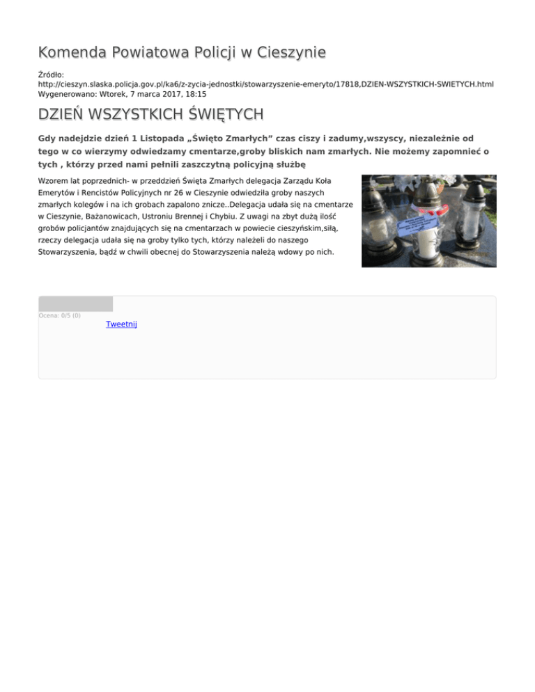 Komenda Powiatowa Policji w Cieszynie Źródło: http://cieszyn.slaska.policja.gov.pl/ka6/z-zycia-jednostki/stowarzyszenie-emeryto/17818,DZIEN-WSZYSTKICH-SWIETYCH.html Wygenerowano: Wtorek, 7 marca 2017, 18:15 DZIEŃ WSZYSTKICH ŚWIĘTYCH Gdy nadejdzie dzień 1 Listopada „Święto Zmarłych” czas ciszy i zadumy,wszyscy, niezależnie od tego w co wierzymy odwiedzamy cmentarze,groby bliskich nam zmarłych. Nie możemy zapomnieć o tych , którzy przed nami pełnili zaszczytną policyjną służbę Wzorem lat poprzednich- w przeddzień Święta Zmarłych delegacja Zarządu Koła Emerytów i Rencistów Policyjnych nr 26 w Cieszynie odwiedziła groby naszych zmarłych kolegów i na ich grobach zapalono znicze..Delegacja udała się na cmentarze w Cieszynie, Bażanowicach, Ustroniu Brennej i Chybiu. Z uwagi na zbyt dużą ilość grobów policjantów znajdujących się na cmentarzach w powiecie cieszyńskim,siłą, rzeczy delegacja udała się na groby tylko tych, którzy należeli do naszego Stowarzyszenia, bądź w chwili obecnej do Stowarzyszenia należą wdowy po nich. Ocena: 0/5 (0) Tweetnij