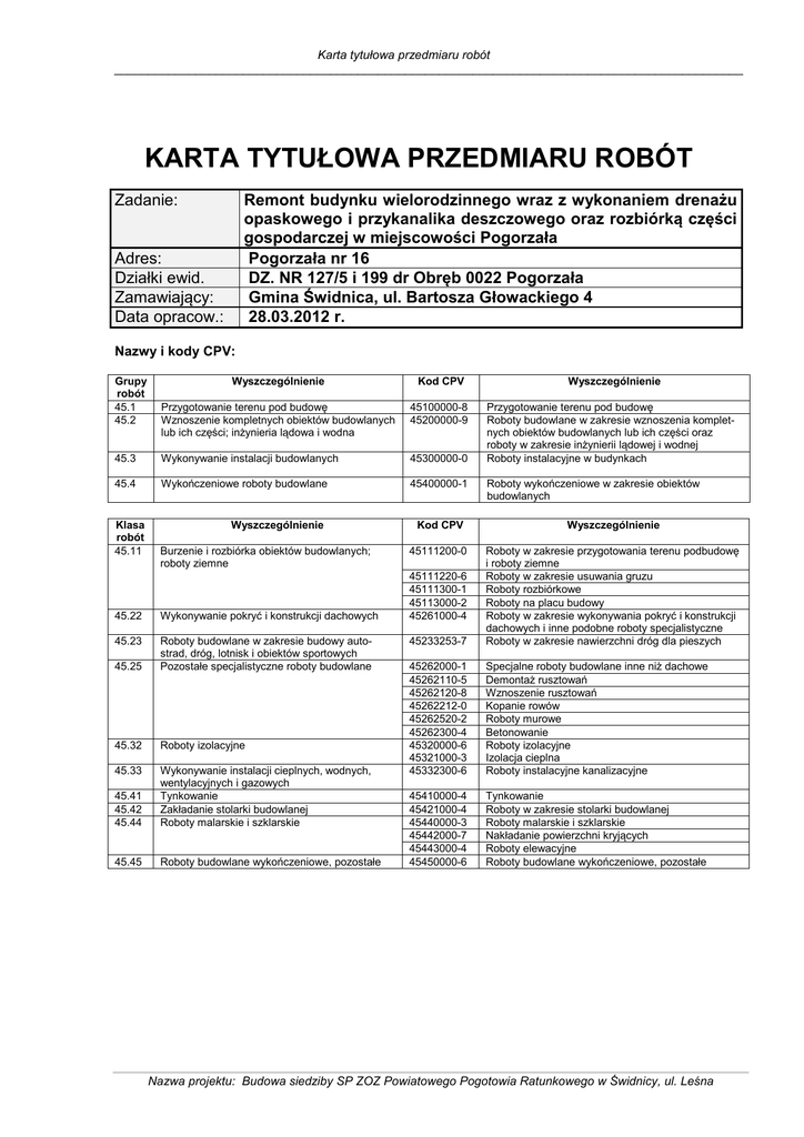 Karta tytułowa przedmiaru robót _____________________________________________________________________________________________ KARTA TYTUŁOWA PRZEDMIARU ROBÓT Zadanie: Remont budynku wielorodzinnego wraz z wykonaniem drenażu opaskowego i przykanalika deszczowego oraz rozbiórką części gospodarczej w miejscowości Pogorzała Pogorzała nr 16 DZ. NR 127/5 i 199 dr Obręb 0022 Pogorzała Gmina Świdnica, ul. Bartosza Głowackiego 4 28.03.2012 r. Adres: Działki ewid. Zamawiający: Data opracow.: Nazwy i kody CPV: Grupy robót 45.1 45.2 Wyszczególnienie Kod CPV Przygotowanie terenu pod budowę Wznoszenie kompletnych obiektów budowlanych lub ich części; inżynieria lądowa i wodna 45100000-8 45200000-9 45.3 Wykonywanie instalacji budowlanych 45300000-0 45.4 Wykończeniowe roboty budowlane 45400000-1 Klasa robót 45.11 Wyszczególnienie Burzenie i rozbiórka obiektów budowlanych; roboty ziemne 45.22 Wykonywanie pokryć i konstrukcji dachowych 45.23 45.25 Roboty budowlane w zakresie budowy autostrad, dróg, lotnisk i obiektów sportowych Pozostałe specjalistyczne roboty budowlane 45.32 Roboty izolacyjne 45.33 45.41 45.42 45.44 Wykonywanie instalacji cieplnych, wodnych, wentylacyjnych i gazowych Tynkowanie Zakładanie stolarki budowlanej Roboty malarskie i szklarskie 45.45 Roboty budowlane wykończeniowe, pozostałe Wyszczególnienie Przygotowanie terenu pod budowę Roboty budowlane w zakresie wznoszenia kompletnych obiektów budowlanych lub ich części oraz roboty w zakresie inżynierii lądowej i wodnej Roboty instalacyjne w budynkach Roboty wykończeniowe w zakresie obiektów budowlanych Kod CPV Wyszczególnienie 45111200-0 45233253-7 Roboty w zakresie przygotowania terenu podbudowę i roboty ziemne Roboty w zakresie usuwania gruzu Roboty rozbiórkowe Roboty na placu budowy Roboty w zakresie wykonywania pokryć i konstrukcji dachowych i inne podobne roboty specjalistyczne Roboty w zakresie nawierzchni dróg dla pieszych 45262000-1 45262110-5 45262120-8 45262212-0 45262520-2 45262300-4 45320000-6 45321000-3 45332300-6 Specjalne roboty budowlane inne niż dachowe Demontaż rusztowań Wznoszenie rusztowań Kopanie rowów Roboty murowe Betonowanie Roboty izolacyjne Izolacja cieplna Roboty instalacyjne kanalizacyjne 45410000-4 45421000-4 45440000-3 45442000-7 45443000-4 45450000-6 Tynkowanie Roboty w zakresie stolarki budowlanej Roboty malarskie i szklarskie Nakładanie powierzchni kryjących Roboty elewacyjne Roboty budowlane wykończeniowe, pozostałe 45111220-6 45111300-1 45113000-2 45261000-4 Nazwa projektu: Budowa siedziby SP ZOZ Powiatowego Pogotowia Ratunkowego w Świdnicy, ul. Leśna Karta tytułowa przedmiaru robót _____________________________________________________________________________________________ Spis działów przedmiaru: Lp. 1. 2. 3. 4. 5. 6. 6.1 6.2 7. 8. 8.1 8.2 Wyszczególnienie ROZBIÓRKA NIEUŻYTKOWEJ CZĘŚCI BUDYNKU GOSPODARCZEGO REMONT DACHU REMONT ELEWACJI ZEWNĘTRZNE SCHODY WYRÓWNAWCZE ELEWACJI WSCHODNIEJ WRAZ Z KONSTRUKCJĄ ZADASZENIA ZEWNĘTRZNE SCHODY WYRÓWNAWCZE GŁÓWNEGO WEJŚCIA DO BUDYNKU ROBOTY IZOLACYJNE Roboty ziemne, drenaŜ opaskowy z przykanalikiem deszczowym wykonanym metodą przewiertu sterowanego Roboty izolacyjne UTWARDZENIE WOKÓŁ BUDYNKU – OPASKA I BETONOWY ŚCIEK ODWADNIAJĄCY INSTALACJE Instalacja odgromowa Instalacja elektryczna w piwnicy budynku Ilości robót w kontraktach rozliczanych ryczałtem W przypadku kontraktów rozliczanych ryczałtowo ilości robót ujęte w Przedmiarze w poszczególnych kategoriach robót zgodnych ze Wspólnym Słownikiem Zamówień (CPV) podawane są w jednostce [1 kpl. ] i obejmują wszystkie roboty budowlane, które musi wykonać Wykonawca, aby przedmiot umowy był zgodny z ustawą Prawo budowlane, ustawą O wyrobach budowlanych, przepisami techniczno-budowlanymi, Dokumentacją Projektową, Specyfikacją Techniczną, normami i aprobatami technicznymi, gwarantujący spełnienie wymagań określonych w art. 5 ustawy Prawo budowlane. Zamieszczone ilości w Przedmiarze naleŜy traktować wyłącznie orientacyjnie. Wykonawca zobowiązany jest do samodzielnego ustalenia zakresu ilościowego w oparciu o dostępne materiały przetargowe obejmujące między innymi: Dokumentację Projektową, Specyfikację Techniczną Wykonania i Odbioru Robót oraz Przedmiar. Niezgodność ilościowa robót pomiędzy wartościami orientacyjnymi zamieszczonymi w Przedmiarze, a faktycznie koniecznymi do wykonania nie jest podstawą domagania się przez Wykonawcę uwzględnienia robót dodatkowych. Cena ryczałtowa za realizację przedmiotu zamówienia będzie uwzględniać wszystkie czynności, wymagania i badania składające się na jej wykonanie, określone dla tego zamówienia w ST i w dokumentacji projektowej oraz ustawie Prawo budowlane, Ustawie o wyrobach budowlanych i przepisach techniczno-budowlanych. Cena ryczałtowa obejmować będzie między innymi: robociznę bezpośrednią, wartość zuŜytych materiałów wraz z kosztami zaopatrzenia i transportu, wartość pracy sprzętu wraz z kosztami jednorazowymi, (sprowadzenie sprzętu na Teren Budowy i z powrotem, montaŜ i demontaŜ na stanowisku pracy, koszty najmu, wypoŜyczenia, odbiorów technicznych, kosztów badań okresowych, legalizacji i innych), koszty pośrednie, w skład których wchodzą,: płace personelu i kierownictwa budowy, pracowników nadzoru i laboratorium, koszty urządzenia i eksploatacji zaplecza budowy (w tym energii elektrycznej i wody, budowy dróg dojazdowych, zabezpieczenia sieci, instalacji i urządzeń infrastruktury technicznej, ochrony drzewostanu, zapewnienia niezbędnych warunków bhp na terenie budowy oraz w całym obszarze związanym z funkcjonowaniem budowy itp.), , wydatki dotyczące bhp, usługi obce na rzecz budowy, opłaty za dzierŜawę placów i bocznic, ekspertyzy dotyczące wykonanych Robót, ubezpieczenia oraz koszty zarządu przedsiębiorstwa Wykonawcy; uzyskanie i pozyskanie terenu na zaplecze budowy leŜy w gestii