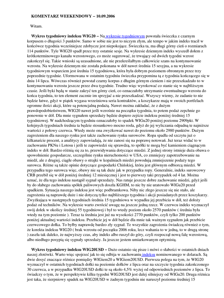 KOMENTARZ WEEKENDOWY − 10.09.2006 Witam. Wykres tygodniowy indeksu WIG20 − Na wykresie tygodniowym powstała świeczka z czarnym korpusem o długości 3 punktów. Samo w sobie nie jest to niczym złym, ale tempo w jakim indeks tracił w końcówce tygodnia wcześniejsze zdobycze jest niepokojące. Świeczka ta, ma długi górny cień o rozmiarach 114 punktów. Tyle WIG20 spadł przez trzy ostatnie sesje. Na wykresie dziennym indeks wyszedł dołem z krótkoterminowego kanału wzrostowego, co może sugerować, że trwający od dwóch tygodni wzrost zakończył się. Takie wnioski są uzasadnione, ale nie przekreślałbym całkowicie szans na kontynuowanie wzrostu. Na wykresie dziennym nie została pokonana w dół nawet średnia 15 sesyjna, a na wykresie tygodniowym wsparciem jest średnia 15 tygodniowa, która była dobrym poziomem obronnym przez trzy poprzednie tygodnie. Uformowana w ostatnim tygodniu świeczka przypomina tą z tygodnia kończącego się w dniu 14 lipca. Wówczas również powstał czarny korpus z długim górnym cieniem i nie przeszkadzało to w kontynuowaniu wzrostu jeszcze przez dwa tygodnie. Trudno więc wyrokować co stanie się w najbliższym czasie. Jeśli byki będą w stanie zakryć ten górny cień, co oznaczałoby utrzymanie ewentualnego wzrostu do końca tygodnia, to ten element zacznie im sprzyjać a nie przeszkadzać. Wszyscy wiemy, że zadanie to nie będzie łatwe, gdyż w piątek wygasa wrześniowa seria kontraktów, a koszykarze mają w swoich portfelach ogromne ilości akcji, które są potencjalną podażą. Nawet można zakładać, że z dużym prawdopodobieństwem, WIG20 nawet jeśli wzrośnie na początku tygodnia, to potem podaż zepchnie go ponownie w dół. Dla mnie sygnałem sprzedaży będzie dopiero zejście indeksu poniżej średniej 15 tygodniowej. W nadchodzącym tygodniu oznaczałoby to spadek WIGu20 poniżej poziomu 2909pkt. W kolejnych tygodniach średnia ta będzie stosunkowo mocno rosła, gdyż do jej wyliczania odpadną te najniższe wartości z połowy czerwca. Wtedy może ona zwyżkować nawet do poziomu około 2980 punktów. Dużym zagrożeniem dla naszego rynku jest także zachowanie rynku surowców. Ropa spadła od szczytu już o kilkanaście procent, a analitycy zapowiadają, że nie zanosi się na poprawę notowań. Już teraz widać to w zachowaniu PKNu i Lotosu i jeśli te zapowiedzi się sprawdzą, to spółki te mogą być kamieniem ciągnącym indeks w dół. Bardzo różnią się za to, przewidywania dotyczące miedzi. Z jednej strony istnieje duża obawa o spowolnienie gospodarcze, szczególnie rynku nieruchomości w USA, co zmniejszy zapotrzebowanie na miedź, ale z drugiej, ciągłe obawy o strajki w kopalniach miedzi powodują zmniejszenie podaży tego surowca. Różne są także opinie dotyczące gospodarki Chińskiej, która jest głównym odbiorcą miedzi. W przypadku tego surowca więc, obawy nie są tak duże jak w przypadku ropy. Generalnie, indeks surowcowy CRB przebił się w dół poniżej średniej 12 miesięcznej i jest to pierwszy taki przypadek od 4 lat. Można uznać, że dla tego indeksu nastąpił sygnał sprzedaży. Nas ratuje jeszcze dobre zachowanie miedzi, gdyż jeśli by do słabego zachowania spółek paliwowych doszła KGHM, to nic by nie uratowało WIGu20 przed spadkiem. Sytuacja naszego indeksu jest więc podbramkowa. Niby nic złego jeszcze się nie stało, ale zagrożenia są naprawdę duże i nie dotyczą tylko najbliższego tygodnia i akcji posiadanych przez koszykarzy. Zwyżkująca w następnych tygodniach średnia 15 tygodniowa w wypadku jej przebicia w dół, też dołoży podaż od techników. Na wykresie warto zwrócić uwagę na jeszcze jedną rzecz. W czerwcu indeks wyznaczył swój dołek w okolicy średniej 55 tygodniowej i był to wtedy poziom około 2570 punktów ( średnia była wtedy na tym poziomie ). Teraz ta średnia jest już na wysokości 2770 punktów, czyli tylko 200 punktów poniżej aktualnej wartości indeksu. Przebicie jej w dół będzie dla mnie tak ważnym sygnałem jak przebicie czerwcowego dołka. To byłby naprawdę bardzo zły sygnał. Te wszystkie zagrożenia świadczą również o tym, że korekta indeksu WIG20 ( brak wzrostu od początku 2006 roku, lecz wahania to w jedną, to w drugą stronę ) zaszła tak daleko, że najwyższy czas, aby indeks albo ruszył do góry, czyli rozpoczął nową falę wzrostową, albo niedługo posypią się sygnały sprzedaży. Ja jeszcze jestem umiarkowanym optymistą. Wykres tygodniowy indeksu WIG20USD − Dużo ostatnio się pisze i mówi o słabości w ostatnich dniach naszej złotówki. Warto więc spojrzeć jak to się odbija w zachowaniu indeksu nominowanego w dolarach. Są dwie dosyć znaczące różnice pomiędzy WIGiem20 a WIGiem20USD. Pierwsza polega na tym, że WIG20 wyznaczył w ostatnich tygodniach dołki na poziomie dołków z lipca oraz na szczycie tygodnia zakończonego 30 czerwca, a w przypadku WIG20USD dołki te są około 4,5% wyżej od odpowiednich poziomów z lipca. To świadczy o tym, że w perspektywie kilku tygodni WIG20USD jest dalej silniejszy od WIGu20. Druga różnica jest taka, że sierpniowy spadek na WIG20USD w żadnym tygodniu nie naruszył poziomu średniej 15 tygodniowej w przeciwieństwie do WIGu20. Widać, że jest ona bardzo dobrym wsparciem dla indeksu i ewentualny sygnał uzyskany po jej przebiciu może być istotny. Owszem, widać na wykresie, że ostatnie trzy tygodnie indeks zachowuje się trochę gorzej niż WIG20, ale jak wykazałem, w trochę szerszej perspektywie jest on dalej silniejszy od indeksu złotówkowego. Wykres tygodniowy indeksu SP500 − Wiele się mówi o możliwym spadku amerykańskiego indeksu oraz, że spadki ze środy i czwartku mogą być tego początkiem. Mogę stwierdzić, że faktycznie indeks trochę zwolnił swój wzrost i zaczyna to wyglądać jak klin wzrostowy, czyli formacja zapowiadająca spadki. Jednak patrząc obiektywnie, SP500 był już bard