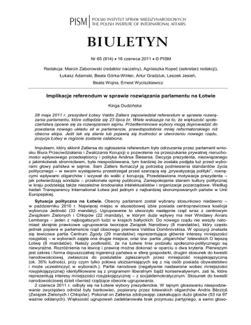 BIULETYN Nr 65 (814) 16 czerwca 2011 © PISM Redakcja: Marcin Zaborowski (redaktor naczelny), Agnieszka Kopeć (sekretarz redakcji), Łukasz Adamski, Beata Górka-Winter, Artur Gradziuk, Leszek Jesień, Beata Wojna, Ernest Wyciszkiewicz Implikacje referendum w sprawie rozwiązania parlamentu na Łotwie Kinga Dudzińska 28 maja 2011 r. prezydent Łotwy Valdis Zatlers zapowiedział referendum w sprawie rozwiązania parlamentu, które odbędzie się 23 lipca br. Wiele wskazuje na to, że większość społeczeństwa opowie się za rozwiązaniem sejmu. Przedterminowe wybory mogą doprowadzić do powstania nowego układu sił w parlamencie, prawdopodobnie mniej reformatorskiego niż obecna ekipa. Jeśli tak się stanie lub pojawią się trudności w utworzeniu nowego rządu, pozycja Łotwy w regionie zostanie osłabiona. Impulsem, który skłonił Zatlersa do ogłoszenia referendum było odrzucenie przez parlament wniosku Biura Przeciwdziałania i Zwalczania Korupcji o pozwolenie na przeszukanie prywatnej nieruchomości wpływowego przedsiębiorcy i polityka Ainārsa Šlesersa. Decyzja prezydenta, niezwiązanego z jakimkolwiek stronnictwem, była niespodziewana, tym bardziej że została podjęta tuż przed wyborami głowy państwa w sejmie. Sam Zatlers tłumaczył ją potrzebą podniesienia standardów życia politycznego – w swoim wystąpieniu przestrzegał przed szerzącą się „prywatyzacją polityki”, rosnącymi wpływami oligarchów i wzywał do walki z korupcją. Przedstawiona motywacja prezydenta – jak potwierdzają sondaże – przekonała opinię publiczną. Zaniepokojenie stanem kultury politycznej w kraju podzielają także niezależne środowiska intelektualistów i organizacje pozarządowe. Według badań Transparency International Łotwa jest jednym z najbardziej skorumpowanych państw w Unii Europejskiej. Sytuacja polityczna na Łotwie. Obecny parlament został wybrany stosunkowo niedawno – w październiku 2010 r. Najwięcej miejsc w stuosobowej izbie posiada centroprawicowa koalicja wyborcza Jedność (33 mandaty). Ugrupowanie to utworzyło następnie rząd wraz z centrowym Związkiem Zielonych i Chłopów (22 mandaty), w którym duże wpływy ma mer Windawy Aivars Lembergs – jeden z najbogatszych ludzi w krajach bałtyckich. Do nowego rządu nie weszły natomiast skrajnie prawicowe ugrupowania tworzące Związek Narodowy (8 mandatów), który często jednak popiera w parlamencie rząd obecnego premiera Valdisa Dombrovskisa. W opozycji znalazła się lewicowa partia Centrum Zgody (29 mandatów) reprezentująca głównie interesy mniejszości rosyjskiej – w wyborach zajęła ona drugie miejsce, oraz tzw. partia „oligarchów” łotewskich O lepszą Łotwę (8 mandatów). Należy podkreślić, że na Łotwie linie podziału społeczno-politycznego są niewyraźne. Rozróżnienia na lewicę i prawicę można dokonać w oparciu o dwa kryteria. Pierwszym jest zakres i forma dopuszczalnej ingerencji państwa w sferę gospodarki, drugim stosunek do kwestii narodowościowej, zwłaszcza do postulatów zgłaszanych przez mniejszość rosyjskojęzyczną (ok. 35% ludności, przy czym tylko połowa utożsamiających się z nią osób posiada obywatelstwo i może uczestniczyć w wyborach.). Partie narodowe (negatywnie nastawione wobec mniejszości rosyjskojęzycznej) identyfikowane są z programem liberalnym bądź konserwatywnym, zaś te, które reprezentują interesy mniejszości rosyjskojęzycznej – z socjaldemokratycznym. Stosunek do kwestii narodowościowej dzieli również rządzące obecnie ugrupowania. 2 czerwca 2011 r. odbyły się na Łotwie wybory prezydenckie. W tajnym głosowaniu niespodziewanie zwycięstwo odniósł były bankowiec, popierany przez łotewskich oligarchów Andris Bērziņš (Związek Zielonych i Chłopów). Pokonał on Zatlersa zdobywając zaskakująco dużo głosów (53 na 97 ważnie oddanych). Większość ugrupowań zadeklarowała brak przymusu partyjnego, a samo głoso- 2475 Polski Instytut Spraw Międzynarodowych wanie podzieliło koalicję rządzącą. Oficjalnie Zatlersa poparła tylko Jedność oraz Związek Narodowy. Przeciw głosowali prawdopodobnie posłowie pozostałych ugrupowań. Sytuacja gospodarcza. Chociaż apogeum kryzysu gospodarczego Łotwa ma już za sobą, to planowane na wrzesień przedterminowe wybory odbędą się w jego cieniu. Spośród państw UE Łotwa najdotkliwiej odczuła skutki załamania ekonomicznego. W 2009 r. zanotowano spadek PKB o 18% w skali roku, bezrobocie osiągnęło 20%, utrzymywał się wysoki poziom emigracji zarobkowej, a obroty w handlu zagranicznym zmniejszyły się o 30%. W 2010 r. tendencje spadkowe uległy odwróceniu i PKB wzrósł o ok. 3%, nieznacznie spadła też liczba bezrobotnych (17%). Pomimo usztywnionego kursu łata i grożącej dewaluacji, zdyscyplinowana polityka budżetowa pierwszego (od marca 2009 r.), jak i drugiego (od listopada 2010 r.) rządu Dombrovskisa oraz pakiet pomocowy Międzynarodowego Funduszu Walutowego i Komisji Europejskiej (pożyczka w wysokości 7,5 mld euro wypłacana w kolejnych transzach) pozwoliły ustabilizować sytuację gospodarczą (prognozy na 2011 r. przewidują wzrost PKB o ponad 3%). Wprowadzenie euro zaplanowano na 2014 r. Mając na uwadze powyższe względy stwierdzić należy, że przedterminowe wybory wykażą czy Łotysze, zmęczeni już kryzysem gospodarczym i oszczędnościową polityką rządu, będą wciąż skłonni powierzyć mandat zaufania Dombrovskisowi. Dotychczas podjął on wiele restrykcyjnych decyzji (m.in. podwyższenie podatku VAT, akcyzy, ograniczenie świadczeń socjalnych), by spełnić rygorystyczne warunki MFW i KE i utrzymać deficyt budżetowy w 2011 r. poniżej 6% PKB oraz zmniejszyć wydatki o 3% PKB. Obniżyło to realnie poziom życia mieszkańców kraju, gdzie wciąż utrzymuje się wysokie bezrobocie (14,5% na początku br.) oraz maleją dochody - średnia miesięczna płaca obniżyła się również w 2010 r., os