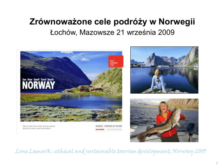 Zrównoważone cele podróży w Norwegii Łochów, Mazowsze 21 września 2009 Lone Lamark : ethical and sustainable tourism development, Norway 2009 1 Plan prezentacji • Rozwój zrównoważonych celów podróży (destynacji) – Co? – Jak? • Doświadczenia norweskie - przykłady • Wyzwania i możliwości Lone Lamark : ethical and sustainable tourism development 2009 Doświadczenie • 1997 – 2008 GRIP Norweskie centrum zrównoważonego rozwoju. Dyrektor departamentu turystyki – Nadawanie ekologicznego profilu hotelom, destynacjom, atrakcjom, rozwój ekocertyfikatów itd – Ecotourism Norway 2005-2009 – Organizacja Międzynarodowej Konferencji Ekoturystycznej (Global Ecotourism Conference) 2007 • 2008 – własna firma konsultingowa – Rozwój i certyfikacja ekoturystyki, członek Zarządu Narodowej Rady Turystyki / Innovation Norway – Wykłady na Uniwersytetach o zrównoważonej turystyce i ekoturystyce – Szkolenia ekoturystyczne dla Norweskich destynacji (celów podróży) • Wcześniej: – Zarządzanie destynacją, przewodnik turystyczny, instruktor narciarstwa, kelnerka….. Opracowane Poradniki i Narzędzia • Zrównoważone zarządzanie hotelem i restauracją 259 przykładów co można zrobić 1998/02 • «Czyste» hotele 1998 • Jak mierzyć efektywność ekologiczną w małym biznesie turystycznym 1999 • Poradnik zarządzania środowiskiem dla hoteli – ISO 14001 and EMAS 1999 • Poradnik zrównoważone cele podróży 2004 • Wytyczne dla odpowiedzialnych turystów 2005 • System certyfikacji ekoturystycznej 2008 Moje ekoturystyczne wyzwanie na wyspach Vesterålen Skagen i Bø – lokalne wyżywienie – oryginalne pokoje – kultura i atrakcje ekoturystyka Zrównoważone cele podróży w Norwegii Łochów, Mazowsze 21 września 2009 Lone Lamark : ethical and sustainable tourism development, Norway 2009 6 Wyzwania dla środowiska Foto: Beitostølen.com Foto: SFT Geiranger Kilde: www.geiranger.no Nagłówek dziennika: Światowe dziedzictwo przyrodnicze zanieczyszczone jak wielkie miasto ! Źródło: Aftenposten, 14.07.06 Turystyka zrównoważona ”Zrównoważony rozwój i odpowiedzialność to klucz dla długofalowej konkurencyjności turystyki. Bez zrównoważonego rozwoju, przemysł turystyczny zniszczy podstawy własnego istnienia.” Mr. Francesco Frangialli, Sekretarz Generalny, UNWTO Globalne ramy “Ekoturystyka to odpowiedzialne podróżowanie do obszarów przyrodniczych, które zachowuje i chroni środowisko oraz polepsza warunki życia lokalnych społeczności” Globalne ramki Biznes ekoturystyczny… Jest oparty na przyrodzie… Służy lokalnej społeczności… Jest źródłem pozytywnych doświadczeń dla gości i gospodarzy… Aktywnie wspiera zachowanie bioróżnorodności… Dostarcza gościom nowej wiedzy… Ogranicza do minimum możliwy negatywny wpływ na otoczenie, przyrodę i lokalną kulturę… Green Key Responsible Tourism Ecotourism Sustainable Tourism EMAS Green Travel Environmental hotel VISIT ISO 14001 Envronmental lighthouse Geotourism CSR EU-flower Blue Flag GRIP destination www.greenhotels.no Green Leaf Olavsrosa The Swan Poradnik zrównoważone destynacje (cele podróży) • Pierwszy norweski poradnik o zrównoważonych destynacjach (2004) • Opracowany na podstawie doświadczeń uzyskanych podczas 4 pilotażowych projektów w różnych miejscach, od roku 2001 – Ponad 150 lokalnych uczestników • Skierowany do samorządów i lokalnych sieci turystycznych Rauland in Telemark – Lofoten Islands – Ulvik in Hardanger – Geilo Cel Rozwinąć norweskie destynacje turystyczne tak by stworzyć Holistyczny, widoczny Wiarygodny wizerunek zrównoważony (ekologiczny) Zrównoważony cel podróży – zawsze oznacza współpracę Hotele, noclegi, agroturystyka Restauracje, catering Gospodarstwa rolne i lokalni producenci żywności Oferta zajęć i przygód Sklepy, kioski, stacje benzynowe Przewoźnicy, firmy transportowe Samorządy, władze lokalne Szkoły Lokalne stowarzyszenia i organizacje pozarządowe Inni.. Różne elementy zrównoważonego celu podróży Lokalna kultura i ludzie Zrównoważony i etyczny biznes i grupy interesu Zorganizowane zajęcia i przygody Przeszkolony personel i przewodnicy Transport a zmiany klimatyczne Czysta przyroda Marketing i informacja Lokalna kultura i ludzie Cel 1: Uzgodnić profil celu podróży (lub markę), oparty na lokalnej społeczności, kulturze i własnych określonych wartościach. Pierwszy krok, pierwsze ”wyzwanie” : Kim jesteśmy ? Jak chcemy być widziani ? Przez kogo? Co możemy wspólnie uzgodnić? Zrównoważony i etyczny biznes i grupy interesu Cel 2: Rozwój ekologicznie wydajnych, lokalnych przedsiębiorstw z wysokiej jakości produktem i jak najmniejszym negatywnym wpływem na środowisko (wpływ na zmiany klimatyczne, energia, woda, chemikalia, odpady itd.) Green Key Responsible Tourism Ecotourism Sustainable Tourism EMAS Green Travel Environmental hotel VISIT ISO 14001 Envronmental lighthouse Geotourism CSR EU-flower Blue Flag GRIP destination www.greenhotels.no Green Leaf Olavsrosa The Swan Przykłady osiągniętych rezultatów: Pola Campingowe Geilo zmniejszyły koszty zużycia prądu o 60 % w jeden rok, poprzez wdrożenie planu racjonalnej gospodarki energią Quality Brakanes Hotel przeorganizowali swoje procedury sprzątania i zaoszczędzili… ZŁ 17.500 dzięki zmniejszeniu ilości detergentów Pensjonat Austbø zaoszczędził dzięki kontroli zużycia detergentów oraz rezygnacji z jednorazowo pakowanych porcji art. śniadaniowych (np. masło, dżem) i plastikowych jednorazówek w łazience. Dzięki instalacji wodooszczędnych prysznicy , małe Turystyczne miasteczkoLauvåsen zmniejszyło zużycie prądu o 10.000 Zł Bardøla Mountain Hotel w narciarskim kurorcie Geilo… zaoszczędził 150.000 ZŁ poprzez wdrożenie programu efektywności ekologicznej . 75.000 ZŁ zaoszczędzono na samym zużyciu energii . 5 hoteli w górach Rauland Zmniejszyło i