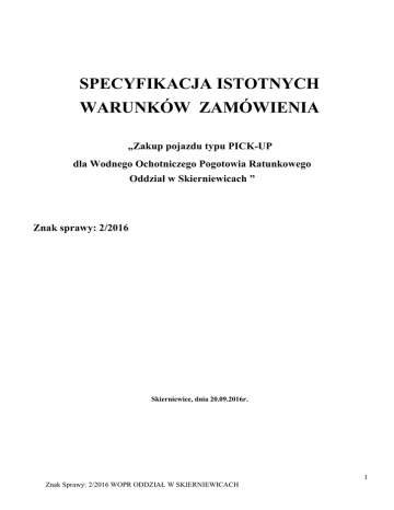 SPECYFIKACJA ISTOTNYCH WARUNKÓW ZAMÓWIENIA „Zakup pojazdu typu PICK-UP dla Wodnego Ochotniczego Pogotowia Ratunkowego Oddział w Skierniewicach ” Znak sprawy: 2/2016 Skierniewice, dnia 20.09.2016r. 1 Znak Sprawy: 2/2016 WOPR ODDZIAŁ W SKIERNIEWICACH I. Nazwa (firma) oraz adres Zamawiającego: 1. Wodne Ochotnicze Pogotowie Ratunkowe Oddział w Skierniewicach Ul. Prusa 6a 2. 3. 4. 5. 96-100 Skierniewice Adres strony internetowej: www.woprskierniewice.pl Rodzaj zamawiającego: stowarzyszenie NIP 8361775347 Zamawiający nie dokonuje zakupu w imieniu innych instytucji zamawiających. II. Tryb udzielenia zamówienia: 1. Postępowanie o udzielenie zamówienia publicznego prowadzone jest w trybie przetargu nieograniczonego art. 11 ust. 8 ustawy z dnia 29 stycznia 2004 r. Prawo zamówień publicznych, zwanej dalej ustawą PZP (tekst jednolity: Dz. U. z 2015r. poz. 2164 z późn. zm.) aktów wykonawczych do ustawy PZP oraz niniejszej Specyfikacji Istotnych Warunków Zamówienia. 2. Niniejsza Specyfikacja Istotnych Warunków Zamówienia zwana jest w dalszej treści Specyfikacją Istotnych Warunków Zamówienia, SIWZ lub specyfikacją. 3. W sprawach nieuregulowanych w niniejszej SIWZ stosuje się przepisy ustawy PZP oraz aktów wykonawczych do ustawy PZP. III. Opis przedmiotu zamówienia: 1. Przedmiotem zamówienia jest sprzedaż i dostawa fabrycznie nowego (rok produkcji 2016), nieużywanego pojazdu oznakowanego typu PICK-UP. Szczegółowy opis przedmiotu zamówienia zawarty został w załączniku nr. 1.1 do SIWZ. 2. Podane przez Zamawiającego ewentualne nazwy (znaki towarowe), mają charakter przykładowy, a ich wskazanie ma na celu określenie oczekiwanego standardu, przy czym Zamawiający dopuszcza składanie ofert równoważnych w zakresie sporządzonego opisu przedmiotu zamówienia. 3. Nomenklatura wg CPV: 34.11.40.00-9 (pojazdy specjalne), 34.11.30.00-2 (pojazdy z napędem na cztery koła) IV. Termin wykonania zamówienia: Zamówienie winno być zrealizowane w terminie do 20.11.2016 roku. V. Opis części zamówienia, jeżeli zamawiający dopuszcza składanie ofert częściowych: Zamawiający nie dopuszcza możliwości składania ofert częściowych. VI. Informacje o przewidywanych zamówieniach uzupełniających, o których mowa w art. 67 ust. 1 pkt 6 i 7 lub art. 134 ust. 6 pkt 3 , jeżeli zamawiający przewiduje udzielenie takich zamówień; Zamawiający nie przewiduje możliwości udzielania zamówień uzupełniających. VII. Opis sposobu przedstawienia ofert wariantowych oraz minimalne warunki, jakim muszą odpowiadać oferty wariantowe, jeżeli Zamawiający dopuszcza ich składanie: Zamawiający nie dopuszcza składania ofert wariantowych. 2 Znak Sprawy: 2/2016 WOPR ODDZIAŁ W SKIERNIEWICACH VIII. Warunki udziału w postępowaniu oraz opis sposobu dokonywania oceny spełniania tych warunków: 1. O udzielenie zamówienia mogą ubiegać się wykonawcy, którzy spełniają warunki, dotyczące: 1) posiadania uprawnień do wykonywania określonej działalności lub czynności, jeżeli przepisy prawa nakładają obowiązek ich posiadania. 2) posiadania wiedzy i doświadczenia; 3) dysponowania odpowiednim potencjałem technicznym oraz osobami zdolnymi do wykonania zamówienia, które będą uczestniczyć w wykonywaniu zamówienia. 4) sytuacji ekonomicznej i finansowej. 2. Zamawiający zbada obecność i prawidłowość każdego wymaganego dokumentu i oświadczenia, a także czy wymagany dokument i oświadczenie potwierdza spełnianie warunku nie później niż na dzień składania ofert. Zamawiający dokona formalnej oceny spełniania warunków udziału w postępowaniu w oparciu o analizę oświadczeń lub dokumentów załączonych do oferty. Informacja o spełnianiu przez wykonawców warunków udziału w postępowaniu zgodnie z formułą: spełnia / nie spełnia. 3. W rozdziale IX SIWZ dotyczącym wykazu oświadczeń lub dokumentów, jakie mają dostarczyć Wykonawcy w celu potwierdzenia spełnienia warunków udziału w postępowaniu, Zamawiający szczegółowo wskazuje jakich oświadczeń lub dokumentów żąda od Wykonawcy. 4. W postepowaniu mogą wziąć udział Wykonawcy, którzy spełniają warunek udziału w postępowaniu dotyczący braku podstaw do wykluczenia z postępowania o udzielenie zamówienia publicznego w okolicznościach o których mowa w art. 24 ust. 1 ustawy Pzp. 5. Wykonawca może polegać na wiedzy i doświadczeniu, potencjale technicznym, osobach zdolnych do wykonania zamówienia lub zdolnościach finansowych innych podmiotów, niezależnie od charakteru prawnego łączących go z nimi stosunków. Wykonawca w takiej sytuacji zobowiązany jest udowodnić zamawiającemu, iż będzie dysponował zasobami niezbędnymi do realizacji zamówienia, w szczególności przedstawiając w tym celu pisemne zobowiązanie tych podmiotów do oddania mu do dyspozycji niezbędnych zasobów na okres korzystania z nich przy wykonywaniu zamówienia. Dokument z którego będzie wynikać zobowiązanie podmiotu trzeciego powinien w sposób wyraźny i jednoznaczny wyrażać wolę udzielenia wykonawcy ubiegającemu się o udzielenie zamówienia odpowiedniego zasobu oraz wskazywać: 1) jaki jest zakres dostępnych wykonawcy zasobów innego podmiotu, 2) w jaki sposób zostaną wykorzystane zasoby innego podmiotu przez wykonawcę, 3) jakiego charakteru stosunki będą łączyły wykonawcę z innym podmiotem, 4) jaki jest zakres i termin udziału innego podmiotu przy wykonywaniu zamówienia. IX. Wykaz oświadczeń lub dokumentów, jakie mają dostarczyć Wykonawcy w celu potwierdzenia spełnienia warunków udziału w postępowaniu oraz niepodlegania wykluczeniu na podstawie art. 24 ust 1 ustawy: 1. W zakresie wykazania spełniania przez wykonawcę warunków, o których mowa w art. 22 ust. 1 ustawy, szczegółowo opisanych w rozdziale VIII należy przedłożyć: 1) oświadczenie o spełnianiu warunków udziału w postępowaniu, zgodnie z załącznikiem nr 2 do SIWZ. W przypadku składania ofert