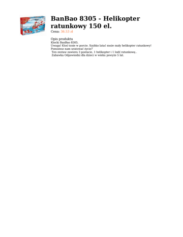 BanBao 8305 - Helikopter ratunkowy 150 el. Cena: 36.53 zł Opis produktu Klocki BanBao 8305. Uwaga! Ktoś tonie w porcie. Szybko latać może mały helikopter ratunkowy! Pomożesz nam uratować życie? Ten zestaw zawiera 3 postacie, 1 helikopter i 1 lodź ratunkową . Zabawka Odpowiedni dla dzieci w wieku powyże 5 lat.