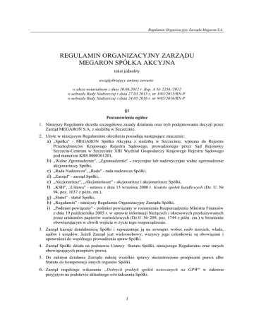 Regulamin Organizacyjny Zarządu Megaron S.A. REGULAMIN ORGANIZACYJNY ZARZĄDU MEGARON SPÓŁKA AKCYJNA tekst jednolity uwzględniający zmiany zawarte w akcie notarialnym z dnia 20.06.2012 r. Rep. A Nr 2256 /2012 w uchwale Rady Nadzorczej z dnia 27.03.2015 r. nr 3/03/2015/RN-P w uchwale Rady Nadzorczej z dnia 24.05.2016 r. nr 9/05/2016/RN-P §1 Postanowienia ogólne 1. Niniejszy Regulamin określa szczegółowe zasady działania oraz tryb podejmowania decyzji przez Zarząd MEGARON S.A. z siedzibą w Szczecinie. 2. Użyte w niniejszym Regulaminie określenia posiadają następujące znaczenie: a) „Spółka" - MEGARON Spółka Akcyjna z siedzibą w Szczecinie, wpisana do Rejestru Przedsiębiorców Krajowego Rejestru Sądowego, prowadzonego przez Sąd Rejonowy Szczecin-Centrum w Szczecinie XIII Wydział Gospodarczy Krajowego Rejestru Sądowego pod numerem KRS 0000301201, b) „Walne Zgromadzenie", „Zgromadzenie" - zwyczajne lub nadzwyczajne walne zgromadzenie akcjonariuszy Spółki, c) „Rada Nadzorcza", „Rada" - rada nadzorcza Spółki, d) „Zarząd" - zarząd Spółki, e) „Akcjonariusz", „Akcjonariusze" - akcjonariusz i akcjonariusze Spółki, f) „KSH", „Ustawa" - ustawa z dnia 15 września 2000 r. Kodeks spółek handlowych (Dz. U. Nr 94, poz. 1037 z późn. zm.), g) „Statut" - statut Spółki, h) „Regulamin" - niniejszy Regulamin Organizacyjny Zarządu Spółki, i) „Podmiot powiązany" - podmiot powiązany w rozumieniu Rozporządzenia Ministra Finansów z dnia 19 października 2005 r. w sprawie informacji bieżących i okresowych przekazywanych przez emitentów papierów wartościowych (Dz.U. Nr 209, poz. 1744 z późn. zm.) w brzmieniu obowiązującym w chwili wejścia w życie tego rozporządzenia. 3. Zarząd kieruje działalnością Spółki i reprezentuje ją na zewnątrz wobec osób trzecich, władz, sądów i urzędów. Jeżeli Zarząd jest wieloosobowy, wszyscy jego członkowie są obowiązani i uprawnieni do wspólnego prowadzenia spraw Spółki. 4. Zarząd Spółki działa na podstawie Ustawy Statutu Spółki, niniejszego Regulaminu oraz innych obowiązujących przepisów prawa. 5. Do zakresu działania Zarządu należą wszelkie sprawy niezastrzeżone przepisami prawa albo Statutu do kompetencji innych organów Spółki. 6. Zarząd respektuje wskazania „Dobrych praktyk spółek notowanych na GPW" w zakresie przyjętym na podstawie aktualnego oświadczenia Spółki. 1 Regulamin Organizacyjny Zarządu Megaron S.A. §2 Skład i organizacja Zarządu 1. Zgodnie z postanowieniami Statutu, Zarząd składa się z jednego do trzech członków. Liczbę członków Zarządu ustala Rada Nadzorcza. W razie powołania zarządu jednoosobowego, jedyny członek Zarządu powoływany jest jako Prezes Zarządu. 2. Zarząd Spółki jest powoływany i odwoływany przez Radę Nadzorczą. 3. Kadencja Zarządu trwa trzy lata i jest kadencją wspólną. 4. Rada Nadzorcza wyznacza Prezesa Zarządu oraz pozostałych Członków Zarządu. 5. W razie powołania zarządu wieloosobowego jego pracami kieruje Prezes Zarządu. 6. Członkowie Zarządu mogą być wybrani ponownie, nie wcześniej jednak niż na rok przed upływem bieżącej kadencji. 7. Mandaty członków Zarządu wygasają najpóźniej z dniem odbycia Walnego Zgromadzenia zatwierdzającego sprawozdanie finansowe Spółki za ostatni pełny rok sprawowania funkcji. 8. W przypadku ustąpienia, śmierci, odwołania lub wystąpienia innych przyczyn skutkujących zmniejszeniem liczby członków Zarządu, Zarząd występuje niezwłocznie do Rady Nadzorczej o zwołanie posiedzenia w celu uzupełnienia składu Zarządu. 9. Do wyboru, obliczania okresów kadencji oraz chwili wygaśnięcia mandatów członków Zarządu stosuje się właściwe przepisy Kodeksu spółek handlowych oraz postanowienia Statutu. 10. Prezes Zarządu jest odpowiedzialny za organizację i kierowanie pracami Zarządu Spółki. W przypadku jego długotrwałej nieobecności, choroby lub niemożności wypełniania obowiązków z jakiejkolwiek innej przyczyny przez okres przekraczający jeden miesiąc, obowiązki Prezesa Zarządu wykonuje Wiceprezes Zarządu, zaś w braku Wiceprezesa Zarządu, Członek Zarządu wyznaczony przez Radę Nadzorczą. W przypadku Zarządu jednoosobowego obowiązki Prezesa Zarządu wykonuje członek Rady Nadzorczej wyznaczony przez Radę Nadzorczą na okres nie dłuższy niż 3 miesiące. 11. W przypadku Zarządu jednoosobowego, do składania oświadczeń w imieniu Spółki upoważniony jest samodzielnie Prezes Zarządu, a w przypadku Zarządu wieloosobowego do składania oświadczeń w imieniu Spółki wymagane jest współdziałanie dwóch członków Zarządu albo jednego członka Zarządu łącznie z prokurentem. Oświadczenia składane Spółce oraz doręczenia pism Spółce mogą być dokonywane wobec jednego członka Zarządu lub prokurenta. 12. W przypadku Zarządu wieloosobowego, wszyscy członkowie Zarządu uprawnieni i zobowiązani są do prowadzenia spraw Spółki. Uchwały Zarządu wymagają wszystkie sprawy przekraczające zakres zwykłych czynności. Uchwały Zarządu zapadają zwykłą większością głosów, jeżeli wszyscy członkowie zostali prawidłowo zawiadomieni o posiedzeniu. W razie równości głosów decyduje głos Prezesa Zarządu §3 Prawa i obowiązki Zarządu 1. Zarząd wykonuje zadania wynikające z przepisów prawa, postanowień Statutu oraz uchwał Walnego Zgromadzenia. 2. Zarząd, kierując się interesem Spółki, określa strategię oraz główne cele działania spółki i przedkłada je Radzie Nadzorczej, po czym jest odpowiedzialny za ich wdrożenie i realizację. Zarząd dba o przejrzystość i efektywność systemu zarządzania Spółką oraz prowadzenie jej spraw zgodne z przepisami prawa i dobrą praktyką. 2 Regulamin Organizacyjny Zarządu Megaron S.A. 3. Członek Zarządu powinien zachowywać pełną lojalność wobec Spółki i uchylać się od działań, które mogłyby prowadzić wyłączni