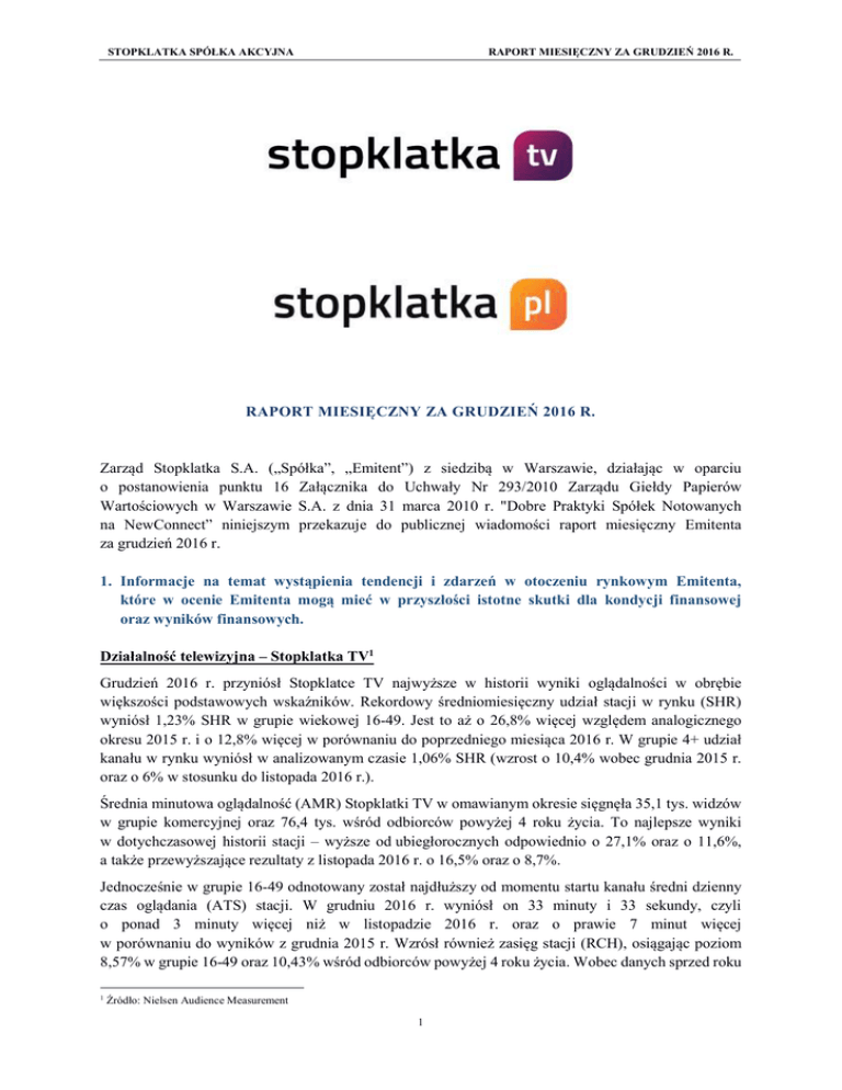 STOPKLATKA SPÓŁKA AKCYJNA RAPORT MIESIĘCZNY ZA GRUDZIEŃ 2016 R. RAPORT MIESIĘCZNY ZA GRUDZIEŃ 2016 R. Zarząd Stopklatka S.A. („Spółka”, „Emitent”) z siedzibą w Warszawie, działając w oparciu o postanowienia punktu 16 Załącznika do Uchwały Nr 293/2010 Zarządu Giełdy Papierów Wartościowych w Warszawie S.A. z dnia 31 marca 2010 r. "Dobre Praktyki Spółek Notowanych na NewConnect” niniejszym przekazuje do publicznej wiadomości raport miesięczny Emitenta za grudzień 2016 r. 1. Informacje na temat wystąpienia tendencji i zdarzeń w otoczeniu rynkowym Emitenta, które w ocenie Emitenta mogą mieć w przyszłości istotne skutki dla kondycji finansowej oraz wyników finansowych. Działalność telewizyjna – Stopklatka TV1 Grudzień 2016 r. przyniósł Stopklatce TV najwyższe w historii wyniki oglądalności w obrębie większości podstawowych wskaźników. Rekordowy średniomiesięczny udział stacji w rynku (SHR) wyniósł 1,23% SHR w grupie wiekowej 16-49. Jest to aż o 26,8% więcej względem analogicznego okresu 2015 r. i o 12,8% więcej w porównaniu do poprzedniego miesiąca 2016 r. W grupie 4+ udział kanału w rynku wyniósł w analizowanym czasie 1,06% SHR (wzrost o 10,4% wobec grudnia 2015 r. oraz o 6% w stosunku do listopada 2016 r.). Średnia minutowa oglądalność (AMR) Stopklatki TV w omawianym okresie sięgnęła 35,1 tys. widzów w grupie komercyjnej oraz 76,4 tys. wśród odbiorców powyżej 4 roku życia. To najlepsze wyniki w dotychczasowej historii stacji – wyższe od ubiegłorocznych odpowiednio o 27,1% oraz o 11,6%, a także przewyższające rezultaty z listopada 2016 r. o 16,5% oraz o 8,7%. Jednocześnie w grupie 16-49 odnotowany został najdłuższy od momentu startu kanału średni dzienny czas oglądania (ATS) stacji. W grudniu 2016 r. wyniósł on 33 minuty i 33 sekundy, czyli o ponad 3 minuty więcej niż w listopadzie 2016 r. oraz o prawie 7 minut więcej w porównaniu do wyników z grudnia 2015 r. Wzrósł również zasięg stacji (RCH), osiągając poziom 8,57% w grupie 16-49 oraz 10,43% wśród odbiorców powyżej 4 roku życia. Wobec danych sprzed roku 1 Źródło: Nielsen Audience Measurement 1 STOPKLATKA SPÓŁKA AKCYJNA RAPORT MIESIĘCZNY ZA GRUDZIEŃ 2016 R. oznacza to wzrost odpowiednio o 5,3% oraz o 4,7%, a w stosunku do danych z listopada 2016 r. – o 5,9% i o 3,6%. W ostatnim miesiącu 2016 r. stacja cieszyła się dużą popularnością wśród widzów z grupy komercyjnej korzystających z naziemnej telewizji cyfrowej. Rekordowe wskaźniki wyniosły: 21,9 tys. AMR i 2,57% SHR (w stosunku do wyników z grudnia 2015 r. jest to wzrost odpowiednio o 17,5% i o 24,8%). Wydłużeniu w tej grupie uległ również średni dzienny czas oglądania programu stacji, sięgając 36 minut i 42 sekund. Jest to o ponad 7 minut więcej niż w tym samym miesiącu 2015 r. Nadzwyczajne Walne Zgromadzenie W dniu 13 grudnia 2016 r. miało miejsce Nadzwyczajne Walne Zgromadzenie Stopklatka S.A., podczas którego podjęto uchwały w przedmiocie: wyboru biegłego rewidenta do zbadania rocznego sprawozdania finansowego Spółki za okres od 1 stycznia 2016 r. do 31 grudnia 2016 r. wybranym biegłym rewidentem jest PricewaterhouseCoopers Sp. z o.o., zmian w Statucie Emitenta w zakresie Art. 13A ust. 5 oraz Art. 16A ust. 2, przyjęcia tekstu jednolitego Statutu Spółki, o czym Emitent poinformował raportem bieżącym EBI nr 43/2016. 2. Zestawienie informacji opublikowanych przez Emitenta w okresie objętym raportem. RAPORTY EBI: Data Rodzaj Numer Temat raportu 13.12.2016 r. Bieżący 43/2016 Treść uchwał podjętych podczas Nadzwyczajnego Walnego Zgromadzenia Stopklatka S.A. w dniu 13 grudnia 2016 r. 14.12.2016 r. Bieżący 44/2016 Raport miesięczny Stopklatka S.A. za listopad 2016 r. Bieżący 45/2016 Podpisanie z podmiotem uprawnionym do badania sprawozdań finansowych umowy o badanie sprawozdania finansowego Stopklatka S.A. za rok obrotowy 2016 Rodzaj Numer Temat raportu 4/2016 Wykaz akcjonariuszy posiadających co najmniej 5% ogólnej liczby głosów na Nadzwyczajnym Walnym Zgromadzeniu Stopklatka S.A. w dniu 13 grudnia 2016 r. 20.12.2016 r. RAPORTY ESPI: Data 13.12.2016 r. Bieżący 2 STOPKLATKA SPÓŁKA AKCYJNA RAPORT MIESIĘCZNY ZA GRUDZIEŃ 2016 R. 3. Informacje na temat realizacji celów emisji, jeżeli taka realizacja choćby w części miała miejsce w okresie objętym raportem oraz informacje na temat działalności Emitenta w grudniu 2016 r. Informacje odnośnie najważniejszych wydarzeń, mających miejsce w grudniu 2016 r. zostały przedstawione w pkt 1 niniejszego raportu. 4. Kalendarz inwestora, obejmujący wydarzenia mające mieć miejsce w nadchodzącym miesiącu, które dotyczą Emitenta i są istotne z punktu widzenia interesów inwestorów, w szczególności daty publikacji raportów okresowych, planowanych walnych zgromadzeń, otwarcia subskrypcji, spotkań z inwestorami lub analitykami oraz oczekiwany termin publikacji raportu analitycznego. W związku z punktem 16 Załącznika do Uchwały Nr 293/2010 Zarządu Giełdy Papierów Wartościowych w Warszawie S.A. z dnia 31 marca 2010 r. "Dobre Praktyki Spółek Notowanych na NewConnect” do dnia 14 lutego 2017 r. Emitent przekaże raport miesięczny za styczeń 2017 r. Podstawa prawna: Punkt 16 Załącznika do Uchwały Nr 293/2010 Zarządu Giełdy Papierów Wartościowych w Warszawie S.A. z dnia 31 marca 2010 r. "Dobre Praktyki Spółek Notowanych na NewConnect”. Osoby reprezentujące Spółkę: Bogusław Kisielewski – Prezes Zarządu Agnieszka Sadowska – Członek Zarządu 3