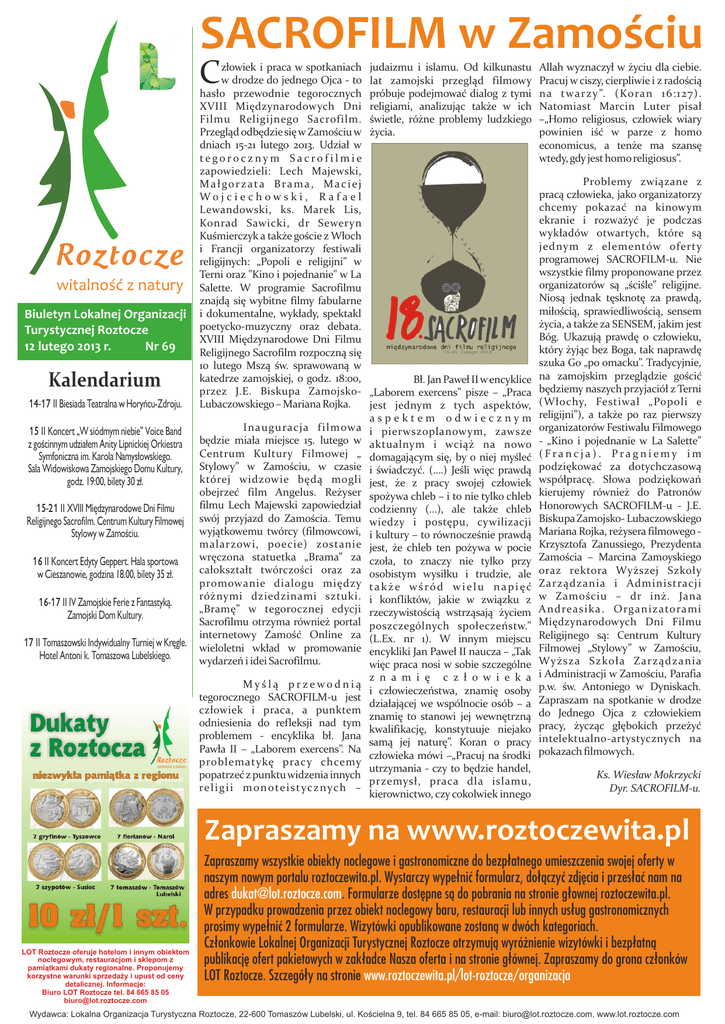 SACROFILM w Zamościu C Biuletyn Lokalnej Organizacji Turystycznej Roztocze 12 lutego 2013 r. Nr 69 Kalendarium 51 14-17 II Biesiada Teatralna w Horyńcu-Zdroju. 15 II Koncert „W siódmym niebie” Voice Band z gościnnym udziałem Anity Lipnickiej Orkiestra Symfoniczna im. Karola Namysłowskiego. Sala Widowiskowa Zamojskiego Domu Kultury, godz. 19:00, bilety 30 zł. 15-21 II XVIII Międzynarodowe Dni Filmu Religijnego Sacrofilm. Centrum Kultury Filmowej Stylowy w Zamościu. 16 II Koncert Edyty Geppert. Hala sportowa w Cieszanowie, godzina 18.00, bilety 35 zł. 16-17 II IV Zamojskie Ferie z Fantastyką. Zamojski Dom Kultury. 17 II Tomaszowski Indywidualny Turniej w Kręgle. Hotel Antoni k. Tomaszowa Lubelskiego. złowiek i praca w spotkaniach w drodze do jednego Ojca - to hasło przewodnie tegorocznych XVIII Międzynarodowych Dni Filmu Religijnego Sacrofilm. Przegląd odbędzie się w Zamościu w dniach 15-21 lutego 2013. Udział w tegorocznym Sacrof ilmie zapowiedzieli: Lech Majewski, M a ł go r z a t a B r a m a , M a c i e j Wo j c i e c h o w s k i , R a f a e l Lewandowski, ks. Marek Lis, Konrad Sawicki, dr Seweryn Kuśmierczyk a także goście z Włoch i Francji organizatorzy festiwali religijnych: „Popoli e religijni” w Terni oraz "Kino i pojednanie" w La Salette. W programie Sacrofilmu znajdą się wybitne filmy fabularne i dokumentalne, wykłady, spektakl poetycko-muzyczny oraz debata. XVIII Międzynarodowe Dni Filmu Religijnego Sacrofilm rozpoczną się 10 lutego Mszą św. sprawowaną w katedrze zamojskiej, o godz. 18:00, przez J.E. Biskupa ZamojskoLubaczowskiego – Mariana Rojka. Inauguracja f ilmowa będzie miała miejsce 15. lutego w Centrum Kultury Filmowej „ Stylowy” w Zamościu, w czasie której widzowie będą mogli obejrzeć film Angelus. Reżyser filmu Lech Majewski zapowiedział swój przyjazd do Zamościa. Temu wyjątkowemu twórcy (filmowcowi, malarzowi, poecie) zostanie wręczona statuetka „Brama” za całokształt twórczości oraz za promowanie dialogu między różnymi dziedzinami sztuki. „Bramę” w tegorocznej edycji Sacrofilmu otrzyma również portal internetowy Zamość Online za wieloletni wkład w promowanie wydarzeń i idei Sacrofilmu. Myślą przewodnią tegorocznego SACROFILM-u jest człowiek i praca, a punktem odniesienia do refleksji nad tym problemem - encyklika bł. Jana Pawła II – „Laborem exercens”. Na problematykę pracy chcemy popatrzeć z punktu widzenia innych re l i g i i m o n o te i s t yc z nyc h – judaizmu i islamu. Od kilkunastu lat zamojski przegląd filmowy próbuje podejmować dialog z tymi religiami, analizując także w ich świetle, różne problemy ludzkiego życia. Bł. Jan Paweł II w encyklice „Laborem exercens” pisze – „Praca jest jednym z tych aspektów, aspektem odwiecznym i pierwszoplanowym, zawsze aktualnym i wciąż na nowo domagającym się, by o niej myśleć i świadczyć. (….) Jeśli więc prawdą jest, że z pracy swojej człowiek spożywa chleb – i to nie tylko chleb codzienny (…), ale także chleb wiedzy i postępu, cywilizacji i kultury – to równocześnie prawdą jest, że chleb ten pożywa w pocie czoła, to znaczy nie tylko przy osobistym wysiłku i trudzie, ale także wśród wielu napięć i konfliktów, jakie w związku z rzeczywistością wstrząsają życiem poszczególnych społeczeństw.” (L.Ex. nr 1). W innym miejscu encykliki Jan Paweł II naucza – „Tak więc praca nosi w sobie szczególne z n a m i ę c z ł o w i e k a i człowieczeństwa, znamię osoby działającej we wspólnocie osób – a znamię to stanowi jej wewnętrzną kwalifikację, konstytuuje niejako samą jej naturę”. Koran o pracy człowieka mówi –„Pracuj na środki utrzymania - czy to będzie handel, przemysł, praca dla islamu, kierownictwo, czy cokolwiek innego Allah wyznaczył w życiu dla ciebie. Pracuj w ciszy, cierpliwie i z radością na twarzy ”. (Koran 16:127). Natomiast Marcin Luter pisał –„Homo religiosus, człowiek wiary powinien iść w parze z homo economicus, a tenże ma szansę wtedy, gdy jest homo religiosus”. Problemy związane z pracą człowieka, jako organizatorzy chcemy pokazać na kinowym ekranie i rozważyć je podczas wykładów otwartych, które są jednym z elementów oferty programowej SACROFILM-u. Nie wszystkie filmy proponowane przez organizatorów są „ściśle” religijne. Niosą jednak tęsknotę za prawdą, miłością, sprawiedliwością, sensem życia, a także za SENSEM, jakim jest Bóg. Ukazują prawdę o człowieku, który żyjąc bez Boga, tak naprawdę szuka Go „po omacku”. Tradycyjnie, na zamojskim przeglądzie gościć będziemy naszych przyjaciół z Terni (Włochy, Festiwal „Popoli e religijni”), a także po raz pierwszy organizatorów Festiwalu Filmowego - „Kino i pojednanie w La Salette” (Francja). Pragniemy im podziękować za dotychczasową współpracę. Słowa podziękowań kierujemy również do Patronów Honorowych SACROFILM-u - J.E. Biskupa Zamojsko- Lubaczowskiego Mariana Rojka, reżysera filmowego Krzysztofa Zanussiego, Prezydenta Zamościa – Marcina Zamoyskiego oraz rektora Wyższej Szkoły Zarządzania i Administracji w Zamościu – dr inż. Jana Andreasika. Organizatorami Międzynarodowych Dni Filmu Religijnego są: Centrum Kultury Filmowej „Stylowy” w Zamościu, Wyższa Szkoła Zarządzania i Administracji w Zamościu, Parafia p.w. św. Antoniego w Dyniskach. Zapraszam na spotkanie w drodze do Jednego Ojca z człowiekiem pracy, życząc głębokich przeżyć intelektualno-artystycznych na pokazach filmowych. Ks. Wiesław Mokrzycki Dyr. SACROFILM-u. Zapraszamy na www.roztoczewita.pl LOT Roztocze oferuje hotelom i innym obiektom noclegowym, restauracjom i sklepom z pamiątkami dukaty regionalne. Proponujemy korzystne warunki sprzedaży i upust od ceny detalicznej. Informacje: Biuro LOT Roztocze tel. 84 665 85 05 [email protected] Zapraszamy wszystkie obiekty noclegowe i gastronomiczne do b