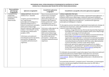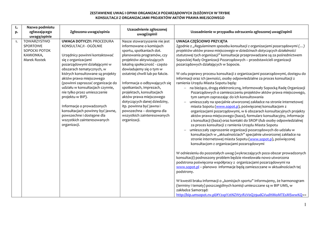 ZESTAWIENIE UWAG I OPINII ORGANIZACJI POZARZĄDOWYCH ZŁOŻONYCH W TRYBIE KONSULTACJI Z ORGANIZACJAMI PROJEKTÓW AKTÓW PRAWA MIEJSCOWEGO L. p. 1. Nazwa podmiotu zgłaszającego uwagę/opinie TOWARZYSTWO SPORTOWE SOPOCKI POTOK KAMIONKA, Marek Rostek Zgłoszona uwaga/opinia UWAGA DOTYCZY: PROCEDURA KONSULTACJI - OGÓLNIE Urzędnicy powinni kontaktować się z organizacjami pozarządowymi działającymi w obszarach tematycznych, w których konsultowane są projekty aktów prawa miejscowego (powinni zapraszać organizacje do udziału w konsultacjach czynnie, nie tylko przez umieszczenie projektu w BIP). Informacje o prowadzonych konsultacjach powinny być jawne, powszechne i dostępne dla wszystkich zainteresowanych organizacji. Uzasadnienie zgłoszonej uwagi/opinii Nasze stowarzyszenie nie jest informowane o komisjach sportu, spotkaniach dot. planowania programów, czy projektów aktywizujących lokalną społeczność - często dowiadujemy się o tym w ostatniej chwili lub po fakcie. Informacja o odbywających się spotkaniach, imprezach, projektach, konsultacjach aktów prawa miejscowego dotyczących danej dziedziny, itp. powinna być jawna i powszechna – dostępna dla wszystkich zainteresowanych organizacji. Uzasadnienie w przypadku odrzucenia zgłoszonej uwagi/opinii UWAGA CZĘŚCIOWO PRZYJĘTA Zgodnie z „Regulaminem sposobu konsultacji z organizacjami pozarządowymi (…) projektów aktów prawa miejscowego w dziedzinach dotyczących działalności statutowej tych organizacji” konsultacje przeprowadzane są za pośrednictwem Sopockiej Rady Organizacji Pozarządowych – przedstawicieli organizacji pozarządowych działających w Sopocie. W celu poprawy procesu konsultacji z organizacjami pozarządowymi, dostępu do informacji oraz ich jawności, osoby odpowiedzialne za proces konsultacji z ramienia Urzędu Miasta Sopotu będą: na bieżąco, drogą elektroniczną, informowały Sopocką Radę Organizacji Pozarządowych o zamieszczeniu projektów aktów prawa miejscowego, tym samym zapraszając do ich konsultowania umieszczały na specjalnie utworzonej zakładce na stronie internetowej miasta Sopotu (www.sopot.p), poświęconej konsultacjom z organizacjami pozarządowymi, w 6 obszarach konsultacyjnych projekty aktów prawa miejscowego (baza), formularz konsultacyjny, informacje z konsultacji (baza) oraz kontakt do SROP i/lub osoby odpowiedzialnej za proces konsultacji z ramienia Urzędu Miasta Sopotu umieszczały zaproszenie organizacji pozarządowych do udziału w konsultacjach w „aktualnościach” specjalnie utworzonej zakładce na stronie internetowej miasta Sopotu (www.sopot.p), poświęconej konsultacjom z organizacjami pozarządowymi W odniesieniu do pozostałych uwag (wykraczających poza obszar prowadzonych konsultacji) podnoszony problem będzie niwelowała nowo utworzona podstrona poświęcona współpracy z organizacjami pozarządowymi na www.sopot.pl – planowo informacje będą zamieszczane w aktualnościach tej podstrony. W kwestii braku informacji o „komisjach sportu” informujemy, że harmonogram (terminy i tematy) poszczególnych komisji umieszczane są w BIP UMS, w zakładce Samorząd: http://bip.umsopot.nv.pl/#Y2xpY2tNZW51R2V0Q29udGVudHMoMTEsMSwwKQ== 1 2. 3. TOWARZYSTWO SPORTOWE SOPOCKI POTOK KAMIONKA, Marek Rostek Obywatelskie Biuro Interwencji Ogólnopolska Organizacja Obywatelska Jacek Wojciech Gibała – przewodniczący Stowarzyszenie In Memoriam oraz Mieszkańcy dla Sopotu Barbara Kűhn UWAGA DOTYCZY: PROCEDURA KONSULTACJI - OGÓLNIE Doświadczenia i praktyka wskazują, że zgłaszane uwagi i opinie mają wyłącznie charakter opiniodawczy, do których sopoccy urzędnicy nie odnoszą się – nie przygotowują odpowiedzi na składane pisma. UWAGA DOTYCZY: Uchwały Nr XLI/517/2010 Rada Miasta Sopotu z 03.09.2010 r. w sprawie określenia sposobu konsultacji z organizacjami (…), projektów aktów prawa miejscowego w dziedzinach dotyczących działalności statutowej tych organizacji” wraz z załącznikiem do uchwały: „Regulamin sposobu konsultowania z organizacjami pozarządowymi (…) projektów aktów prawnych prawa miejscowego w dziedzinach dotyczących działalności statutowej tych organizacji”. Uchwalenia przez RM rocznego lub wieloletniego programu współpracy z organizacjami pozarządowymi oraz podmiotami Taki stan rzeczy generuje brak poczucia sprawstwa i poddaje w wątpliwość sens przeprowadzania konsultacji. W spotkaniach konsultacyjnych powinni brać udział zarówno urzędnicy jak i radni miasta zainteresowani obszarem konsultacyjnym. Z przeprowadzonych konsultacji urzędnicy powinni sporządzać pisemną informację z uzasadnieniem. Również wszelkie inne pisma/wnioski organizacji kierowane do urzędu powinny otrzymywać odpowiedź. Przyjęte w „Regulaminie…” zasady dotyczące konsultacji winny być uzupełnione o nałożenie na podmiot inicjujący podjęcie uchwały Rady Miasta obowiązku przeprowadzenia jej konsultacji z co najmniej 5cioma organizacjami pozarządowymi, czy też z podmiotami wymienionymi w art. 3 UoDPPioW. Zobowiązanie to winno polegać na : 1. Pisemnym wystąpieniu do podmiotu konsultującego z przekazaniem mu treści konsultowanej uchwały wraz z jej wszechstronnym uzasadnieniem, czy też materiałami ją UWAGA PRZYJĘTA W procedurze konsultacji aktów prawa miejscowego zostaną przyjęte rozwiązania: 1) uwagi i opinie składane z wykorzystaniem formularza konsultacyjnego 2) z konsultacji urzędnicy sporządzają INFORMACJĘ - zestawienie uwag wraz z uzasadnieniem odrzucenia 3) Informacja z konsultacji jest upubliczniana na specjalnie utworzonej zakładce na stronie internetowej miasta Sopotu (www.sopot.p), poświęconej konsultacjom z organizacjami pozarządowymi, w 6 obszarach konsultacyjnych UWAGA CZĘŚCIOWO PRZYJĘTA W interesie gminy leży realizacja ustawowego obowiązku konsultowania z organizacjami pozarządowymi projektów aktów prawa miejscowego. Zgodnie z „Regulaminem sposobu konsult