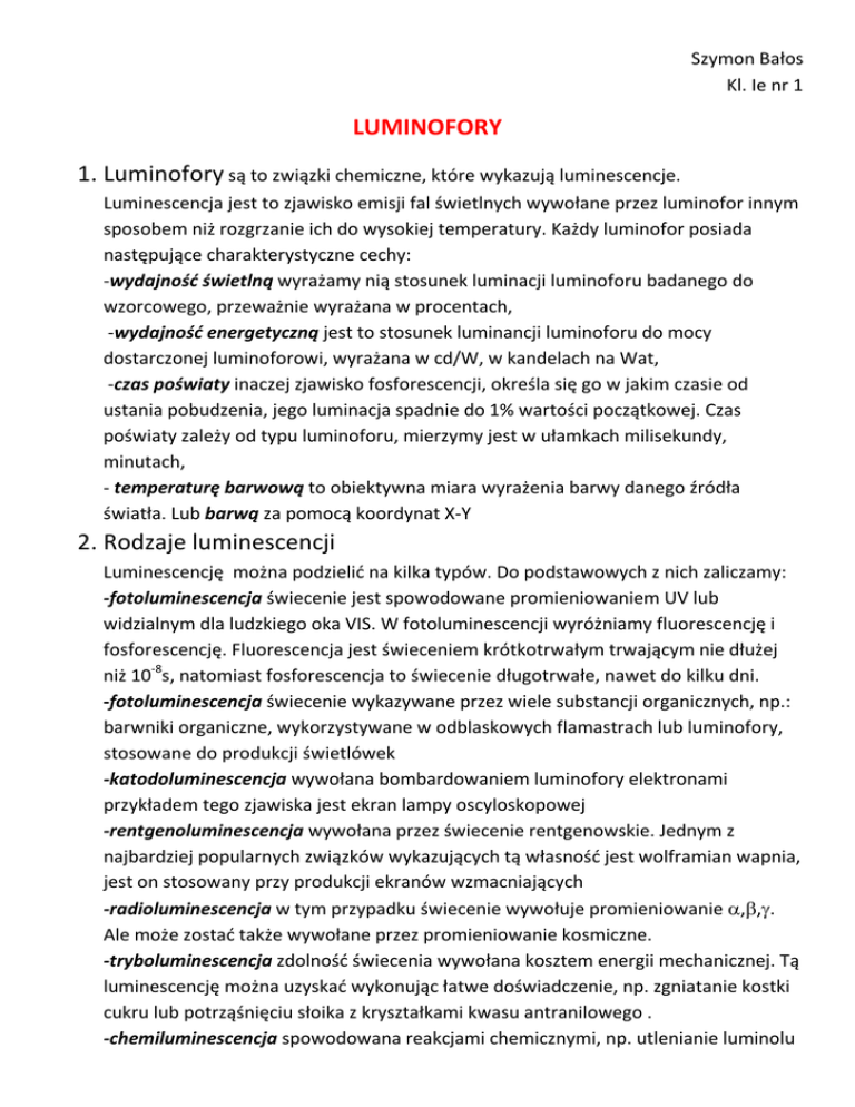 Szymon Bałos Kl. Ie nr 1 LUMINOFORY 1. Luminofory są to związki chemiczne, które wykazują luminescencje. Luminescencja jest to zjawisko emisji fal świetlnych wywołane przez luminofor innym sposobem niż rozgrzanie ich do wysokiej temperatury. Każdy luminofor posiada następujące charakterystyczne cechy: -wydajność świetlną wyrażamy nią stosunek luminacji luminoforu badanego do wzorcowego, przeważnie wyrażana w procentach, -wydajność energetyczną jest to stosunek luminancji luminoforu do mocy dostarczonej luminoforowi, wyrażana w cd/W, w kandelach na Wat, -czas poświaty inaczej zjawisko fosforescencji, określa się go w jakim czasie od ustania pobudzenia, jego luminacja spadnie do 1% wartości początkowej. Czas poświaty zależy od typu luminoforu, mierzymy jest w ułamkach milisekundy, minutach, - temperaturę barwową to obiektywna miara wyrażenia barwy danego źródła światła. Lub barwą za pomocą koordynat X-Y 2. Rodzaje luminescencji Luminescencję można podzielić na kilka typów. Do podstawowych z nich zaliczamy: -fotoluminescencja świecenie jest spowodowane promieniowaniem UV lub widzialnym dla ludzkiego oka VIS. W fotoluminescencji wyróżniamy fluorescencję i fosforescencję. Fluorescencja jest świeceniem krótkotrwałym trwającym nie dłużej niż 10-8s, natomiast fosforescencja to świecenie długotrwałe, nawet do kilku dni. -fotoluminescencja świecenie wykazywane przez wiele substancji organicznych, np.: barwniki organiczne, wykorzystywane w odblaskowych flamastrach lub luminofory, stosowane do produkcji świetlówek -katodoluminescencja wywołana bombardowaniem luminofory elektronami przykładem tego zjawiska jest ekran lampy oscyloskopowej -rentgenoluminescencja wywołana przez świecenie rentgenowskie. Jednym z najbardziej popularnych związków wykazujących tą własność jest wolframian wapnia, jest on stosowany przy produkcji ekranów wzmacniających -radioluminescencja w tym przypadku świecenie wywołuje promieniowanie α,β,γ. Ale może zostać także wywołane przez promieniowanie kosmiczne. -tryboluminescencja zdolność świecenia wywołana kosztem energii mechanicznej. Tą luminescencję można uzyskać wykonując łatwe doświadczenie, np. zgniatanie kostki cukru lub potrząśnięciu słoika z kryształkami kwasu antranilowego . -chemiluminescencja spowodowana reakcjami chemicznymi, np. utlenianie luminolu czy fosforu białego. -elektroluminescencja to świecenie substancji pod wpływem przyłożonego pola elektrycznego. Obecnie zjawisko elektroluminescencji jest szeroko wykorzystywane w diodach LED oraz lamp neonowych. 3. Podział luminoforów • • • • a) Luminofory możemy podzielić w zależności od czynnika wywołującego świecenie. Wyróżniamy następujące luminofory: katodoluminofor- świecący pod wpływem bombardowania elektronami elektroluminofor- świecący w zmiennym polu elektrycznym rentgenoluminofor- świecący pod wpływem promieni X luminofor świecący pod wpływem promieniowania ultrafioletowego b) Luminoforami mogą być związki organiczne i nieorganiczne. Luminofory organiczne- to niektóre polimery, fluoresceinę, eozynę, rodaminę, uraninę oraz wiele innych. Luminofory nieorganiczne- najczęściej otrzymywane są metodą Lenarda, czyli poprzez spiekanie materiału podstawowego z topnikiem i aktywatorem. Z nieorganicznych luminoforów wyróżniamy między innymi: z grupy halofosforanów wapnia. Stosuje się je między innymi w produkcji lamp fluorescencyjnych (świetlówkach). Cechuj je dobra wydajność świetlna, są aktywowane manganem. Wolframiany wapnia są to dobre rentgenoluminofory stosowane do folii wzmacniających w rentgenodiagnostyce. Przykłady wolframian wapnia CaWO4, wolframian magnezu MgWO4 Siarczki-najpopularniejsze to siarczek cynku ZnS i siarczek kadmu. Ich cecha charakterystyczna to wysoka wydajność świetlna. Są także dobrymi katodoluminoforami, elektroluminoforami i rentgenoluminoforami. Tlenosiarczek itru, aktywowany europem bardzo dobry luminofor czerwony, jest on stosowany w telewizji kolorowej. 4. Zasada działania luminoforu na przykładzie ZnS Fluorescencja występuje przy przejściu samorzutnym z wyższego poziomu energetycznego elektronu na niższy. Fosforescencja zaś powstaje przy udziale energii cieplnej ośrodka. Warunkiem wystąpienia tego zjawiska jest istnienie poziomów meta trwałych. Po wzbudzeniu cząsteczki część elektronów nie wraca do stanu podstawowego od razu (co odpowiadałoby fluorescencji), lecz osiągają stan metastabilny. Z tego stanu elektrony mogą być przeniesione na wyższy poziom kosztem energii cieplnej i dopiero z niego może następować powrót do stanu podstawowego z emisją światła. Obecność aktywatora-domieszki w krysztale jest często korzystna, gdyż taki obcy atom może się jonizować dostarczając dziury. Dziura taka z elektronem przewodnictwa może ulegać rekombinacji, czemu towarzyszy emisja fotonu. Atom domieszki stanowi tzw. centrum świecenia lub centrum emisji. Widmo świecenia zależy od aktywatora, zaś czas wygasania (poświaty) zależy od ilości defektów w strukturze- pułapek. 5. Zachowanie luminoforu w typowej lampie jarzeniowej W takiej lampie rura wykładowcza jest wypełniona parami. Kiedy prąd elektryczny płynie przez pary rtęci, zaczyna wydobywać się promieniowanie ultrafioletowe. Promieniowanie pada na luminofor, którym pokryta jest rura od wewnątrz i pobudza go do świecenia przez fluorescencję. Bibliografia: 1. „Podstawy elektroniki 1”- Barbara Pióro, Marek Pióro 2. „Wizyjne przetworniki optoelektroniczne”- Marek Rusin 3. „Zjawisko optyczne w półprzewodnikach”- Jacques I. Pankove 4. „Zarys Fizyki lamp elektrycznych” -Lucjan Berson