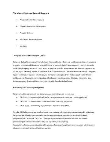 Narodowe Centrum Badań i Rozwoju Program Badań Stosowanych Projekty Badawcze Rozwojowe Projekty Celowe Inicjatywa Technologiczna Innotech Program Badań Stosowanych „PBS” Program Badań Stosowanych Narodowego Centrum Badań i Rozwoju jest horyzontalnym programem wsparcia sektora nauki i sektora przedsiębiorstw w zakresie badań stosowanych z różnych dziedzin nauki (ścieżka programowa A) oraz branż przemysłu (ścieżka programowa B), ustanowionym na art. 30 ust. 1 pkt 3 Ustawy z dnia 30 kwietnia 2010 r. o Narodowym Centrum Badań i Rozwoju. Program będzie wdrażany w oparciu o konkursy na dofinansowanie projektów badawczych o charakterze aplikacyjnym. Szczegółowy tryb realizacji konkursu w odniesieniu do składania wniosków oraz kryteriów oceny formalnej i merytorycznej określa Regulamin konkursu. Harmonogram realizacji Programu Program będzie realizowany wg następującego harmonogramu czasowego: 2012-2014 – organizacja konkursów (przeprowadzenie naborów i rozstrzygnięcie); -2017 – finansowanie i monitorowanie realizacji projektów; 2013 -2022 – monitoring wykorzystania wyników projektów. W roku 2011 planowane jest zrealizowanie prac związanych z przygotowaniem narzędzi wdrażania Programu, jak również przeprowadzenie pierwszego naboru wniosków w dwóch ścieżkach programowych. W latach 2012-2013 planuje się dwa nabory wniosków rocznie. W ramach prowadzonych naborów wniosków zakłada się nabór jednoetapowy. Szczegółowy harmonogram realizacji Programu, obejmujący część przygotowawczą i wdrożeniową dla poszczególnych lat przedstawiono poniżej. 2012 styczeń *otwarcie 1. naboru wniosków (45 dni) marzec ocena wniosków kwiecień ogłoszenie wyników konkursu maj podpisywanie umów, rozpoczęcie finansowania projektów czerwiec ewaluacja pierwszego naboru sierpień *otwarcie 2. naboru wniosków (45 dni) październik ocena wniosków listopad ogłoszenie wyników konkursu grudzień podpisywanie umów, rozpoczęcie finansowania projektów 2013 nabory wniosków, ocena, ogłoszenie wyników – analogicznie jak w roku 2012 styczeń - grudzień finansowanie i monitorowanie realizacji projektów wyłonionych w kolejnych naborach 2014 styczeń *otwarcie 1. naboru wniosków (60 dni) marzec ocena wniosków kwiecień ogłoszenie wyników konkursu maj podpisywanie umów, rozpoczęcie finansowania projektów styczeń - grudzień finansowanie i monitorowanie realizacji projektów wyłonionych w kolejnych naborach 2015-2022 finansowanie i monitorowanie realizacji projektów monitorowanie realizacji wskaźników rezultatu i wskaźników oddziaływania ewaluacja Programu Ustalenie planu finansowego w tym źródeł finansowania programu Program będzie finansowany ze środków publicznych (dotacja celowa Ministra Nauki i Szkolnictwa Wyższego) oraz prywatnych (środki przedsiębiorców). latach 2012-2013 planowane są 2 nabory rocznie, budżet każdego z konkursów – 240 mln zł (razem 960 mln zł). W roku 2014 planuje się ogłoszenie jednego konkursu, którego budżet będzie wynosił 240 mln zł. Mając na uwadze powyższe założenia, oczekuje się, że maksymalna wartość zobowiązań Centrum wyniesie 1,2 mld złotych. Roczne wydatki na dofinansowanie projektów zwiększałyby się narastająco do roku 2013, zgodnie z poniższym planem (w milionach złotych): W zależności od wyników kolejnych konkursów, na podstawie prowadzonej na bieżąco ewaluacji Programu, zakłada się możliwość zmian. Mając na uwadze cele Programu oraz katalog potencjalnych wnioskodawców, oczekuje się że, środki przeznaczone przez NCBiR na dofinansowanie projektów w ramach Programu wyniosą ok. 1 200 mln zł. Kwota ta oznacza wkład środków publicznych z budżetu nauki przyznanych przez Centrum na realizację projektów w ramach Programu; będą one stanowiły ok. 90% kosztów realizacji projektów, pozostałe ok. 10% będą stanowiły środki prywatne, pochodzące od przedsiębiorców. Zakłada się, że całkowity budżet programu, uwzględniający środki publiczne oraz prywatne będzie wynosił ok. 1,35 mld zł (1,3333 mld.) Zadania dla NCBiR zlecone przez MNiSW: projekty zamawiane, rozwojowe i "Inicjatywa technologiczna I” Minister Nauki i Szkolnictwa Wyższego prof. dr hab. Barbara Kudrycka zleciła Narodowemu Centrum Badań i Rozwoju realizację projektów zamawianych /oprócz wcześniej już przyjętych przez Centrum/ oraz realizację projektów rozwojowych, przyjętych do finansowania w ramach IV konkursu.Minister Nauki i Szkolnictwa Wyższego prof. dr hab. Barbara Kudrycka zleciła Narodowemu Centrum Badań i Rozwoju realizację projektów zamawianych /oprócz wcześniej już przyjętych przez Centrum/ oraz realizację projektów rozwojowych, przyjętych do finansowania w ramach IV konkursu. Narodowe Centrum Badań i Rozwoju przejęło także monitorowanie projektów rozwojowych i celowych realizowanych w ramach Przedsięwzięcia Ministra Nauki i Szkolnictwa Wyższego „Inicjatywa technologiczna I", w tym 46 umów już zawartych oraz 96 projektów, na które umowy będą zawierane już przez Centrum. Proces przejmowania Przedsięwzięcia „Inicjatywa technologiczna I" powinien zakończyć się w kwietniu br. W tym czasie sukcesywnie podpisywane będą umowy, zgodnie z którymi nastąpi cesja praw i obowiązków wynikających z 46 umów zawartych między MNiSW a beneficjentami na Narodowe Centrum Badań i Rozwoju. Następnie Centrum przygotuje nowe wzory umów i formularzy, które w pełni odzwierciedlą treść decyzji Ministra Nauki i Szkolnictwa Wyższego. Z kolei z beneficjentami 96 projektów, dla których umowy z MNiSW nie zostały jeszcze zawarte, Centrum podpisze własne umowy, wg nowego wzoru. Wzory formularzy zostaną udostępnione na stronie internetowej Centrum w najbliższych tygodniach. Jednocześnie informujemy, że wszelkie zmiany w harmonogramie prac wynikające z opóźnień po stronie MNiSW zostaną uwzględnione w nowych umowac