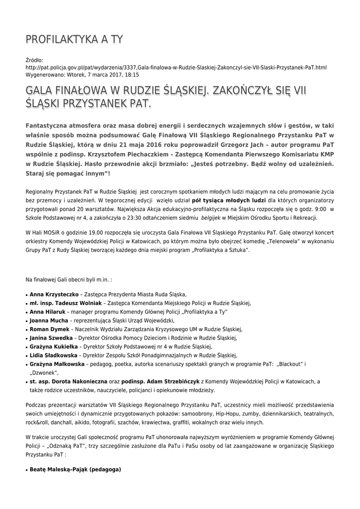 PROFILAKTYKA A TY Źródło: http://pat.policja.gov.pl/pat/wydarzenia/3337,Gala-finalowa-w-Rudzie-Slaskiej-Zakonczyl-sie-VII-Slaski-Przystanek-PaT.html Wygenerowano: Wtorek, 7 marca 2017, 18:15 GALA FINAŁOWA W RUDZIE ŚLĄSKIEJ. ZAKOŃCZYŁ SIĘ VII ŚLĄSKI PRZYSTANEK PAT. Fantastyczna atmosfera oraz masa dobrej energii i serdecznych wzajemnych słów i gestów, w taki właśnie sposób można podsumować Galę Finałową VII Śląskiego Regionalnego Przystanku PaT w Rudzie Śląskiej, którą w dniu 21 maja 2016 roku poprowadził Grzegorz Jach – autor programu PaT wspólnie z podinsp. Krzysztofem Piechaczkiem – Zastępcą Komendanta Pierwszego Komisariatu KMP w Rudzie Śląskiej. Hasło przewodnie akcji brzmiało: „Jesteś potrzebny. Bądź wolny od uzależnień. Staraj się pomagać innym”! Regionalny Przystanek PaT w Rudzie Śląskiej jest corocznym spotkaniem młodych ludzi mającym na celu promowanie życia bez przemocy i uzależnień. W tegorocznej edycji wzięło udział pół tysiąca młodych ludzi dla których organizatorzy przygotowali ponad 20 warsztatów. Największa Akcja edukacyjno-profilaktyczna na Śląsku rozpoczęła się o godz. 9:00 w Szkole Podstawowej nr 4, a zakończyła o 23:30 odtańczeniem siedmiu belgijek w Miejskim Ośrodku Sportu i Rekreacji. W Hali MOSiR o godzinie 19.00 rozpoczęła się uroczysta Gala Finałowa VII Śląskiego Przystanku PaT. Galę otworzył koncert orkiestry Komendy Wojewódzkiej Policji w Katowicach, po którym można było obejrzeć komedię „Telenowela” w wykonaniu Grupy PaT z Rudy Śląskiej tworzącej każdego dnia miejski program „Profilaktyka a Sztuka”. Na finałowej Gali obecni byli m.in. : ● Anna Krzysteczko – Zastępca Prezydenta Miasta Ruda Śląska, ● mł. insp. Tadeusz Wolniak – Zastępca Komendanta Miejskiego Policji w Rudzie Śląskiej, ● Anna Hilaruk – manager programu Komendy Głównej Policji „Profilaktyka a Ty” ● Joanna Mucha – reprezentująca Śląski Urząd Wojewódzki, ● Roman Dymek – Naczelnik Wydziału Zarządzania Kryzysowego UM w Rudzie Śląskiej, ● Janina Szwedka – Dyrektor Ośrodka Pomocy Dzieciom i Rodzinie w Rudzie Śląskiej, ● Grażyna Kukiełka – Dyrektor Szkoły Podstawowej nr 4 w Rudzie Śląskiej, ● Lidia Sładkowska – Dyrektor Zespołu Szkół Ponadgimnazjalnych w Rudzie Śląskiej, ● Grażyna Małkowska – pedagog, poetka, autorka scenariuszy spektakli granych w programie PaT: „Blackout” i „Dzwonek”, ● st. asp. Dorota Nakonieczna oraz podinsp. Adam Strzebińczyk z Komendy Wojewódzkiej Policji w Katowicach, a także rodzice uczestników, nauczyciele, policjanci i opiekunowie młodzieży. Podczas prezentacji warsztatów VII Śląskiego Regionalnego Przystanku PaT, uczestnicy mieli możliwość przedstawienia swoich umiejętności i dynamicznie przygotowanych pokazów: samoobrony, Hip-Hopu, zumby, dziennikarskich, teatralnych, rock&roll, danchall, aikido, fotografii, szachów, krawiectwa, graffiti, wokalnych oraz wielu innych. W trakcie uroczystej Gali społeczność programu PaT uhonorowała najwyższym wyróżnieniem w programie Komendy Głównej Policji – „Odznaką PaT”, trzy szczególnie zasłużone dla PaTu i PaSu osoby od lat zaangażowane w organizację Śląskiego Przystanku PaT : ● Beatę Maleską–Pająk (pedagoga) ● Zbigniewa Figurę (urzędnika) ● podinsp. Krzysztofa Piechaczka (policjanta) Finał zakończył się wspólnie odśpiewanym hymnem PaTu. Jak zawsze przy jego wykonaniu panowała nieziemska energia. „ Żeby to wszystko poczuć trzeba tu być. Już zaczynam tęsknić za kolejnym spotkaniem w gronie PaTowiczów”. – podsumował VII Śląski Regionalny Przystanek PaT w Rudzie Śląskiej jeden z uczestników Akcji. Wszystkim osobom i instytucjom zaangażowanym w organizację VII Śląskiego Przystanku PaT serdecznie dziękujemy! Tekst: st. sierż. Damian Wroczyński – Rzecznik Prasowy programu PaT Zdjęcia: Wojciech Kozioł Film: Julia Szymańczyk Ocena: 3/5 (2) Tweetnij
